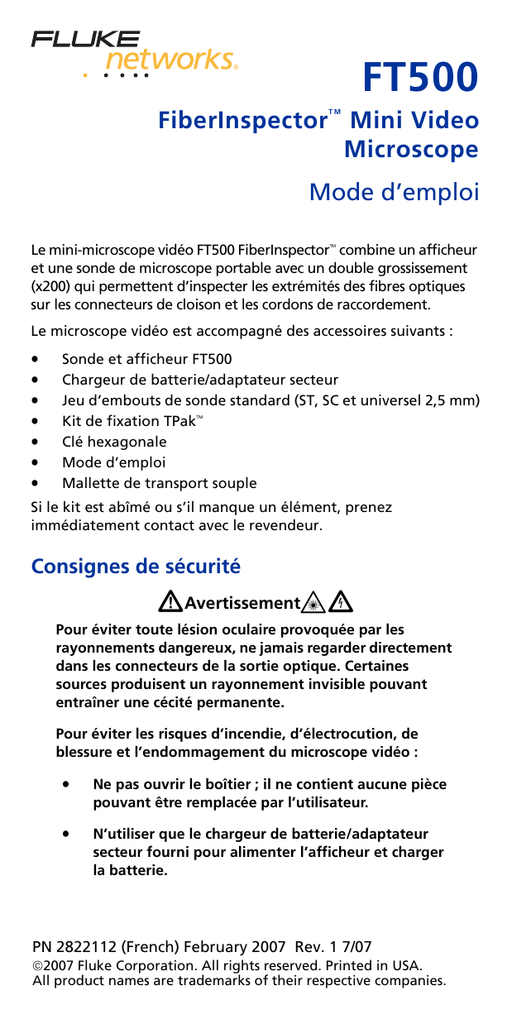 FiberInspectorT M Mini Video Microscope Mode d`emploi