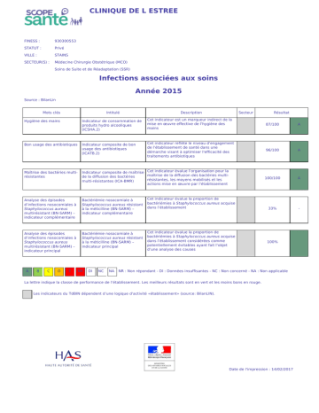 CLINIQUE DE L ESTREE FINESS : 930300553 STATUT : Privé VILLE : STAINS SECTEUR(S) : Médecine Chirurgie Obstétrique (MCO) Soins de Suite et de Réadaptation (SSR) Infections associées aux soins Année 2015 Source : BilanLin Mots clés Intitulé Description Secteur Hygiène des mains Indicateur de consommation de produits hydro alcooliques (ICSHA.2) Cet indicateur est un marqueur indirect de la mise en œuvre effective de l'hygiène des mains Bon usage des antibiotiques Indicateur composite de bon usage des antibiotiques (ICATB.2) Cet indicateur reflète le niveau d'engagement de l'établissement de santé dans une démarche visant à optimiser l'efficacité des traitements antibiotiques Maîtrise des bactéries multirésistantes Indicateur composite de maîtrise Cet indicateur évalue l’organisation pour la maîtrise de la diffusion des bactéries multide la diffusion des bactéries résistantes, les moyens mobilisés et les multi-résistantes (ICA-BMR) actions mise en œuvre par l’établissement Analyse des épisodes d’infections nosocomiales à Staphylococcus aureus multirésistant (BN-SARM) – indicateur complémentaire Bactériémie nosocomiale à Staphylococcus aureus résistant à la méticilline (BN-SARM) – indicateur complémentaire Cet indicateur évalue la proportion de bactériémies à Staphylococcus aureus acquise dans l’établissement Analyse des épisodes d’infections nosocomiales à Staphylococcus aureus multirésistant (BN-SARM) – indicateur principal Bactériémie nosocomiale à Staphylococcus aureus résistant à la méticilline (BN-SARM) – indicateur principal Cet indicateur évalue la proportion de bactériémies à Staphylococcus aureus acquise dans l’établissement considérées comme potentiellement évitables ayant fait l’objet d’une analyse des causes A B C D E NR DI NC NA Résultat 87/100 A 96/100 A 100/100 A 33% - 100% NR : Non répondant - DI : Données insuffisantes - NC : Non concerné - NA : Non applicable La lettre indique la classe de performance de l’établissement. Les meilleurs résultats sont en vert et les moins bons en rouge. Les indicateurs du TdBIN dépendent d’une logique d'activité «établissement» (source: BilanLIN). Date de l'impression : 14/02/2017 CLINIQUE DE L ESTREE FINESS : 930300553 STATUT : Privé VILLE : STAINS SECTEUR(S) : Médecine Chirurgie Obstétrique (MCO) Soins de Suite et de Réadaptation (SSR) Infections associées aux soins - suite Année 2014 Source : BilanLin Mots clés Intitulé Description Secteur Prévention des infections nosocomiales Indicateur composite des activités de lutte contre les infections nosocomiales (ICALIN.2) Cet indicateur évalue l'organisation de la lutte contre les infections nosocomiales dans l'établissement, les moyens mobilisés et les actions mises en œuvre Risque infectieux opératoire Indicateur composite de lutte contre les infections du site opératoire (ICA-LISO) Cet indicateur évalue l'organisation pour la prévention des infections du site opératoire en chirurgie ou en obstétrique, les moyens mobilisés et les actions mises en œuvre par l'établissement A B C D E NR DI NC NA Résultat 97/100 A 93/100 A NR : Non répondant - DI : Données insuffisantes - NC : Non concerné - NA : Non applicable La lettre indique la classe de performance de l’établissement. Les meilleurs résultats sont en vert et les moins bons en rouge. Les indicateurs du TdBIN dépendent d’une logique d'activité «établissement» (source: BilanLIN). Date de l'impression : 14/02/2017 CLINIQUE DE L ESTREE FINESS : 930300553 STATUT : Privé VILLE : STAINS SECTEUR(S) : Médecine Chirurgie Obstétrique (MCO) Soins de Suite et de Réadaptation (SSR) Indicateurs transversaux de qualité et de sécurité des soins Année 2015 Source : QUALHAS Mots clés Intitulé Description Secteur Qualité du dossier patient Tenue du dossier patient Cet indicateur évalue la qualité du dossier du patient hospitalisé Document de sortie Document de sortie Cet indicateur, présenté sous forme de taux, évalue la qualité du document de sortie produit le jour de la sortie du patient Courrier de fin d'hospitalisation Délai d'envoi du courrier de fin d’hospitalisation Cet indicateur évalue la qualité du courrier de fin d’hospitalisation et son délai d’envoi Evaluation de la douleur Traçabilité de l’évaluation de la douleur Suivi du poids Dépistage des troubles nutritionnels Cet indicateur mesure la traçabilité de l’évaluation de la douleur dans le dossier du patient Cet indicateur évalue le dépistage des troubles nutritionnels chez le patient adulte Qualité du dossier d’anesthésie Tenue du dossier d’anesthésie Résultat MCO SSR PSY HAD 88/100 86/100 NC NC A A NC NC MCO 34/100 C SSR PSY HAD MCO SSR HAD MCO SSR PSY HAD 53/100 NC NC 91/100 100/100 NC 96/100 89/100 NC NC C NC NC A A NC A B NC NC Cet indicateur évalue la qualité du dossier d’anesthésie MCO 94/100 A Traçabilité de l'évaluation de Traçabilité de l'évaluation de la la douleur post-opératoire douleur post-opératoire avec une échelle en salle de surveillance postinterventionnelle (SSPI) Cet indicateur, présenté sous la forme d’un taux, évalue la traçabilité dans le dossier anesthésique de l’évaluation de la douleur post-opératoire avec une échelle sur la feuille de surveillance du patient en SSPI (à l’entrée et à la sortie) MCO 25/100 C Evaluation du risque d’escarre Cet indicateur mesure la traçabilité de l’évaluation du risque d’escarre dans le dossier du patient adulte HAD NC NC MCO 93/100 A Traçabilité de l’évaluation du risque d’escarre Cet indicateur évalue si une proposition de Décision médicale en équipe Réunion de concertation en cas de cancer pluridisciplinaire en cancérologie traitement a été émise par au moins trois médecins de spécialités différentes lors de la prise en charge initiale d’un patient atteint de cancer A B C NR NV NC NR : Non r