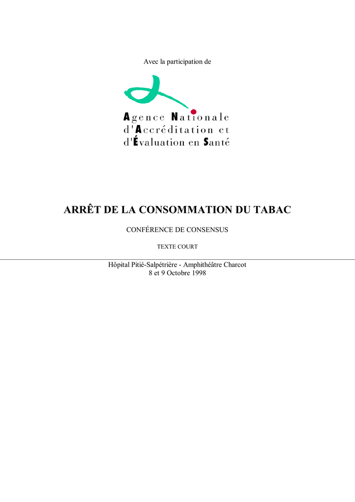 Avec la participation de ARRÊT DE LA CONSOMMATION DU TABAC CONFÉRENCE DE CONSENSUS TEXTE COURT Hôpital Pitié-Salpétrière - Amphithéâtre Charcot 8 et 9 Octobre 1998 Conférence de consensus Arrêt de la consommation du tabac PARTENAIRES : Secrétariat d’état à la santé Ministère de l’éducation nationale, de la recherche et de la technologie Comité Français d’éducation pour la santé Caisse nationale de l’assurance maladie des travailleurs salariés Ordre national des médecins Ordre national des pharmaciens Ordre national des chirurgiens dentistes Association française de thérapie comportementale et cognitive Association française d’urologie Collège français de pathologie vasculaire Collège national des gynécologues et obstétriciens français Comité national contre les maladies respiratoires et la tuberculose Confédération nationale des syndicats dentaires Fédération Française de Cardiologie Fédération nationale des centres de lutte contre le cancer Groupement des sociétés scientifiques odonto-stomatologiques Société de pneumologie de langue française Société française d’ORL et de pathologie cervico-faciale Société française de cardiologie Société française de gynécologie obstétrique Société française d’hypertension artérielle Société française de médecine générale Société française de microcirculation Société française de pédiatrie Société française de santé publique Société française du cancer Alliance française pour la santé-coalition contre le tabagisme Association pour la recherche sur le cancer Comité national contre le tabagisme Ligue nationale contre le cancer Association tabac et liberté Réseau hôpital sans tabac AVEC L’AIDE DE : Direction générale de la santé Agence nationale d’accréditation et d’évaluation en santé Caisse nationale de l’assurance maladie des travailleurs salariés Association pour la recherche sur le cancer Ligue nationale contre le cancer Bayer Pharma Laboratoires Hoechst-Houdé Produits Roche ANAES/Recommandations professionnelles/Octobre 1998 2 Conférence de consensus Arrêt de la consommation du tabac COMITÉ D'ORGANISATION P M. TUBIANA, Président d’honneur : Cancérologue, Alliance Française pour la Santé Coalition contre le tabagisme, Paris Pr. THOMAS, Président du comité : Cardiologue, Groupe hospitalier Pitié-Salpétrière, Paris Dr. E. ANDRÉ : Médecin de Santé Publique , Grenoble Dr. F. BAUDIER : Caisse Nationale de l’Assurance Maladie des Travailleurs Salariés, Paris Pr. BEAUFILS : Pédiatre , Hôpital Robert Debré, Paris Pr. F. BONNAUD : Pneumologue, Comité National contre les maladies respiratoires et de la Tuberculose, Paris Dr. A. BORGNE : Tabacologue, Réseau Hôpital sans tabac, Paris Pr. JP. BROUSTET :Cardiologue, Groupe Hospitalier Sud, Pessac Pr. G. BRÜCKER : Bureau du comité, Médecin de Santé Publique, A.P.-H.P., Paris Pr. F. CARPENTIER : Méthodologie, ANAES, Paris Dr. P. DOSQUET : Méthodologie, ANAES, Paris Pr. A. DUROCHER : Méthodologie, ANAES, Paris Dr. G. ERRIEAU : Médecin Généraliste, Paris Pr. A. HIRSCH : Pneumologue, Hôpital Saint-Louis, Paris Dr. F. LAVERGNE : Pneumologue, Hôpital Saint-Louis, Paris Pr. B. LEBEAU : Pneumologue, Hôpital Saint-Antoine, Paris Pr. M. LEGRAIN : Président du jury, Néphrologue, Paris Dr. C. MATHIOT : Cancérologue, Institut Curie, Paris Dr. H-J. PHILIPPE : Gynécologue, obstétricien CHI Poissy - Saint-Germain-en-Laye, Poissy AM. SCHOELCHER : Prévention, Assistance Publique-Hôpitaux de Paris Dr. E. RUSCH : Médecin de santé Publique, Hôpital Fernand Widal, Paris JURY Pr. M. LEGRAIN : Président, Néphrologue , Paris Dr. M. COLETTI : Médecin Généraliste, Viroflay J. CHWALLOW : Psychosociologue, Inserm U341, Villejuif Pr.S. DALLY :Toxicologue, Hôpital Fernand vidal, Paris Pr .M. DETILLEUX : Médecin Interniste, Hôpital Cochin, Paris Dr .F. DIEVART : Cardiologue, Clinique Villette, Dunkerque Dr. I. GREMY : Médecin de Santé Publique, ORS, Paris Pr. G. KANTOR : Cancérologue, Institut Bergonié, Bordeaux Dr. R. KNOCKAERT : Médecin Généraliste, Paris Dr. J-J. LARZUL : Pneumologue, CH de Cornouaille, Quimper Pr. D. ZMIROU : Médecin de Santé Publique, Faculté de Médecine, Grenoble Dr. M. VIGY : Journaliste, Le Figaro, Paris ANAES/Recommandations professionnelles/Octobre 1998 3 Conférence de consensus Arrêt de la consommation du tabac EXPERTS Dr. K. ABDENNBI : Cardiologue, Centre Cardiologique du Nord, Saint-Denis Dr. C. ANDRÉ : Psychiatre, CH Saint-Anne, Paris Dr. H-J.. AUBIN : Psychiatre, CH Émile Roux, Limeil Brevannes Pr .M. BASTIDE : Immunologiste, Faculté de Pharmacie, Université Montpellier Dr. J. BECCHIO : Médecin Généraliste , Hôpital Paul Brousse,Villejuif Dr. Ph. CASTERA : Médecin Généraliste, Bordeaux Dr. AM. CLAUZEL : Tabacologue, Pneumologue CHU, Montpellier Pr. J-C. COLAU : Gynécologue Obstétricien, CMC Foch, Suresnes Dr. G. DEMIGNEUX : Médecin Généraliste, Blois Dr. C.GILLET :Alcoologue , Hôpital Villemin, Nancy D. GRIZEAU : Démographe, CFES, Vanves Dr. C. HILL :Epidémiologiste, Institut Gustave Roussy, Villejuif S. KARSENTY : Sociologue, CNRS ,Maison des Sciences de l’Homme Ange Guepin, Nantes Pr. G. LAGRUE : Tabacologue, Hôpital Henri Mondor, Créteil Dr. J-M. LEDER, Pharmacien, Paris J. LE HOUEZEC : Consultant en Neuro Sciences et Psycho pharmacologie, Paris Dr. G. PEIFFER : Pneumologue, CHR Bon Secours, Metz Pr. O. POMERLEAU : Psychologue, Université de Michigan, USA Pr. J. PRIGNOT : Pneumologue, Fondation contre les Affections Respiratoires et pour l’Education de la santé, Bruxelles Dr. P. RAVAUD : Médecin de Santé Publique, Hôpital Cochin, Paris Pr. H. SANCHO-GARNIE : Médecin de Santé Publique, CHU Montpellier. Nîmes Dr. S. SARETTO : Pneumologue, Archée , Aix en Provence K. SLAMA : Psycho -Sociologue, UICTMR, Paris Dr. J. TICHET : Médecine de Santé Publique, IRSA ,Tours Dr. J. TREDANIEL : Pneumologue, Hô