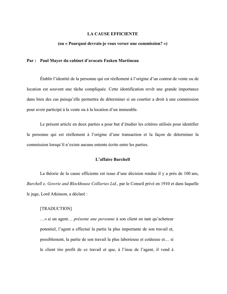 LA CAUSE EFFICIENTE (ou « Pourquoi devrais-je vous verser une commission? ») Par : Paul Mayer du cabinet d’avocats Fasken Martineau Établir l’identité de la personne qui est réellement à l’origine d’un contrat de vente ou de location est souvent une tâche compliquée. Cette identification revêt une grande importance dans bien des cas puisqu’elle permettra de déterminer si un courtier a droit à une commission pour avoir participé à la vente ou à la location d’un immeuble. Le présent article en deux parties a pour but d’étudier les critères utilisés pour identifier la personne qui est réellement à l’origine d’une transaction et la façon de déterminer la commission lorsqu’il n’existe aucune entente écrite entre les parties. L’affaire Burchell La théorie de la cause efficiente est issue d’une décision rendue il y a près de 100 ans, Burchell c. Gowrie and Blockhouse Collieries Ltd., par le Conseil privé en 1910 et dans laquelle le juge, Lord Atkinson, a déclaré : [TRADUCTION] …« si un agent… présente une personne à son client en tant qu’acheteur potentiel, l’agent a effectué la partie la plus importante de son travail et, possiblement, la partie de son travail la plus laborieuse et coûteuse et… si le client tire profit de ce travail et que, à l’insu de l’agent, il vend à 2 l’acheteur, … le travail de l’agent pourrait toujours constituer la cause efficiente de la vente. » [nos italiques] Dans cette affaire, le Tribunal a jugé que lorsqu’un agent a été la cause efficiente d’une vente, il a droit à une commission même si la vente a eu lieu à son insu. Deux types de situation visés La théorie de la cause efficiente s’applique à deux (2) types de situation : 1. L’inscription ouverte. En premier lieu, la théorie s’appliquera dans le cas où il existe un contrat de courtage non exclusif, c’est-à-dire une « inscription ouverte ». Ce type de contrat peut se présenter sous forme écrite mais est souvent verbal. Voici un exemple : « Présentez-moi un acheteur et je vous verserai une commission ». Dans ce type de contrat, le propriétaire ou le locataire, selon le cas, se réserve le droit de faire affaire avec d’autres courtiers ou d’effectuer l’opération lui-même. En outre, le propriétaire ou le locataire se réserve habituellement le droit de résilier le contrat en tout temps. Lorsqu’un courtier a conclu un contrat de courtage exclusif avec le propriétaire d’un immeuble ou avec un locataire qui cherche un logement, la théorie ne s’applique pas puisque, afin de toucher une commission, il est suffisant pour le courtier de déterminer que l’immeuble a été vendu ou loué pendant la durée du contrat. Le courtier a droit à une commission même s’il n’a pas participé à l’opération. Dans le cadre d’un contrat de courtage exclusif, le contrat pourra être résilié et la commission refusée uniquement dans des cas de négligence totale ou d’abus. La jurisprudence a établi que l’opération de vente ou de location ne devait pas nécessairement avoir lieu pendant la durée du contrat. Pour avoir droit à la commission, il est suffisant que la présentation des parties et les négociations qui ont mené à la vente ou à la location aient eu lieu pendant la durée du contrat. 3 2. Après l’expiration de la durée du contrat. En second lieu, la théorie s’appliquera après l’expiration de la durée d’un contrat de courtage exclusif. En fait, ce principe constitue une pratique contractuelle reconnue dans le domaine de l’immobilier. La plupart des contrats de courtage commerciaux prévoient clairement une période de prolongation au cours de laquelle il est mentionné que le courtier sera rémunéré si l’immeuble est vendu ou loué dans un délai de 180 jours à un an après l’expiration du contrat de courtage à une personne qui était intéressée à la propriété pendant la durée du contrat. Aussi, la Loi sur le courtage immobilier du Québec prévoit qu’un contrat de courtage à l’égard d'immeubles résidentiels peut stipuler qu’une commission devra être versée au courtier si l’opération a lieu dans les 180 jours de l’expiration du contrat, pourvu qu’un contrat exclusif n’ait pas été conclu avec un autre courtier au cours de cette période. Dans ces deux types de situation, le courtier aura droit à une commission s’il peut démontrer qu’il a été la cause efficiente de l’opération. Que doit faire un courtier pour être considéré comme la cause efficiente d’une vente ou d’une location? La jurisprudence et la doctrine traitent abondamment de la question concernant ce qu’un courtier doit avoir fait pour être considéré comme la cause efficiente d’une vente ou d’une location. Cette jurisprudence illustre bien que verser ou partager une commission constitue une question délicate susceptible de donner naissance à des litiges. La jurisprudence fait référence à divers moyens qui contribuent à déterminer ce que les romains appelaient la « causa causans » d’une transaction. Les cas de jurisprudence utilisent différents termes pour décrire ce qu’un courtier doit avoir fait pour être la cause efficiente d’une transaction. Le courtier devra démontrer qu’il a organisé la rencontre des parties et qu’il a créé une relation de « négociation ». Pour avoir droit à la commission, certaines décisions énoncent 4 que le courtier doit avoir « contribué » à la vente, qu’il doit avoir été le « catalyseur » ou qu’il doit avoir « suivi les étapes et fourni les services ». Afin de déterminer qui a été la cause efficiente, on doit chercher à savoir qui a fait naître cette « volonté de négocier » entre les parties. Pour avoir droit à une commission, un courtier doit démontrer qu’il a effectué le travail requis pour présenter les parties l’une à l’autre et que cette prése