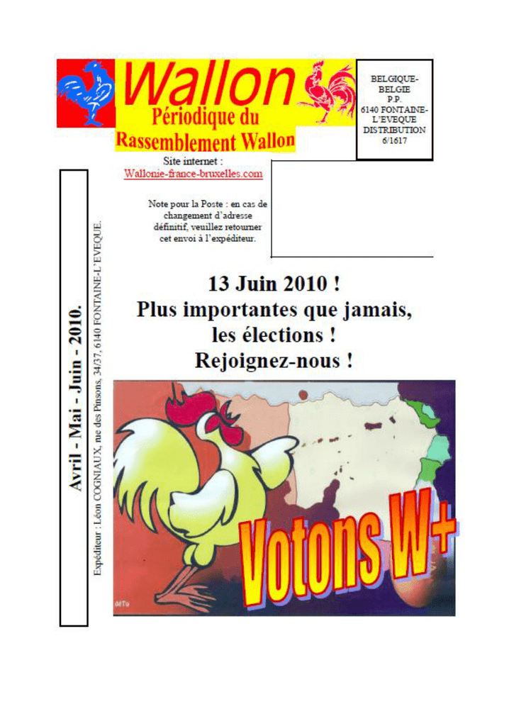 « Bureau National du Rassemblement Wallon. » Membre de W+. Agenda N° 52, 2010. PRENEZ BIEN NOTE ! N’oubliez pas de vider votre messagerie ! MERCI. Section de Fontaine-l’Evêque ; en général, le 4ème mercredi du mois, à 19 h 00, réunion avant le conseil communal du 4ème jeudi ; à 19 h 30, réunion W.- S.D. P.S.D.I. (Friterie d’Emilio Gaone, place C. Brogniez). Attention aux changements possibles ! Pas de réunion en juillet et août. Dimanche 30 mai – 14h30 – 18h00- Congrès Electoral W+, Palais des Congrès, Salle Rogier, Liège (petit car au départ de Charleroi). Dimanche 13 juin – ELECTIONS. Dimanche 20 juin – Wallonie Libre – Aigle blessé, commémoration du 18 juin. (Waterloo). Samedi 26 juin – 10 h 30 - Brasserie de Charleroi, 6000 Charleroi – Réunion R.W. ouverte aux membres et sympathisants, intégration dans W+, vos remarques, vos, suggestions. Samedi 28 août 2010 – 16 h 00 – Traditionnel verre festif et musical de l’amitié, chez André LIBERT, à l’occasion de ses 68 ans. Inauguration par Jean-Luc Danel (petitfils de Maître Charles FRUH, ancien sénateur et Conseiller Général de la Seine, ancien Vice-président du Conseil Municipal de Paris) de la reproduction de la plaque officielle, rue des Wallons, 13ème arrondissement. Vendredi 31 décembre – Réveillon avec les Molières et Mocassins, Petit Théâtre de la Ruelle et Ruche Verrière, Lodelinsart (Charleroi). Revue-Spectacle sur l’actualité carolorégienne et repas de Réveillon avec soirée dansante. Le Président : André LIBERT Rue Hougaerde, 24A, 6142 Leernes - Fontaine-l’Evêque Tél:— Télécopie - Répondeur : 00-32-(07 1)52.60.96 - 0487/44.15.55. [email protected] Le Secrétaire général : Michel ORBAN Rue de la Libération, 24, 6040 Jumet. Tél: 071/35.34.03. Courriel : [email protected] W+ rassemble les Wallons qui n’ont pas peur d’un avenir sans la Flandre. Une Belgique confédérale ? En réponse aux exigences flamandes, W+ envisage d’autres scénarios, plus respectueux de la Wallonie et de ses habitants. Pour être vous-mêmes, vous avez besoin de la Wallonie ; Pour être elle-même, la Wallonie a besoin de vous. DISCOURS D’ANDRE LIBERT AU CONGRES W+ DU 30 MAI 2010, SALLE ROGIER, PALAIS DES CONGRES, LIEGE. Comme l’aurait dit, mon ami, le très regretté Fernand Massart, Salut et Fraternité. Merci à vous, amies et amis de Wallonie pour ce vibrant moment d’union des indépendantistes et des réunionnistes, liés par une fraternité wallonne pour la défense d’un Etat-Région qu’ils aiment. Merci aux Mouvements Wallons présents ce jour, merci d’être restés des éveilleurs de conscience comme l’ont été fidèlement les Bologne-Lemaire, un Etienne Duvieusart, un Jean-Emile Humblet, un Jules Loriaux, une Geneviève Becquet, une Diane Jacob et tant d’autres. Personnellement, je ne suis l’héritier de personne, je continue la chaîne de l’amitié, de la fraternité ; la vraie noblesse, c’est celle du cœur et c’est ici que sont les véritables gens de bien. Fiers d’être wallons et d’aimer la France, nous préparons l’avenir, nous refusons un gourou, confondant innovation et destruction d’autrui, qui s’est maintenu grâce à un jeu d’alliance avec les partis traditionnels et à l’étouffement répété de l’action wallonne. Nous avons besoin de travail, de sécurité, mais aussi de liberté. On préfère nous offrir le pain pour vivoter et le mirage des jeux toujours plus nombreux. Le peuple fouronnais n’aurait pas dû être une marchandise qui se négocie. Les Bruxellois ont droit à tous leurs droits. Les communes à facilité ont le droit de leurs choix. Le commerce n’a plus de frontière, à Bruxelles comme ailleurs. A l’heure où de nos bières rythment un pas brésilien et où notre acier devient indien ou italo-suisse, le Brabant Wallon, notre roman païs doit rester wallon. L’aigle blessé ne sera pas « bilinguisé » et les Wallons doivent au plus tôt posséder la pleine maîtrise de leur enseignement et de leur culture. Oui, liberté, avec Paul Eluard, j’écris ton nom sur les toits de la périphérie flamandisée au forceps. Déjà avec Verdi et le Nabucco de nos amis italiens, le chœur des esclaves entonnait son besoin de liberté. Alors, amies et amis, vivons debout, serrons-nous la ceinture, s’il le faut. Arrêtons de nous déculotter à la mode des partis traditionnels. N’avançons pas la sébile à la main. Nous ne sommes pas un peuple de mendiants. Nous sommes des latins ouverts sur le monde, des démocrates ouverts au progrès. Etes-vous des fainéants, des « gréviculteurs » ? Etes-vous des inaptes intellectuellement incapables d’apprendre une autre langue ? Nos grands-parents étaient des bilingues franco-wallons, s’enrichissant volontiers d’un amoureux « dji vos wé volti ». J’ai été déclaré apte à l’enseignement du « beschaafd Nederlands », j’ai pour amie un professeur de langues et ma belle-fille, secrétaire de direction est multilingue. Le Grand Jacques, poète émérite et incontesté de la langue française se méfiait des flamingants trop souvent amis des loups de Germanie. La Belgique s’évapore, dit la Flandre, la Belgique n’est pas un plus a annoncé Letermeminus. Pourquoi vouloir absolument vivre avec ceux qui nous méprisent avec constance ? Le bonheur dans la souffrance, je ne me sens pas concerné. Je suis pour la joie de vivre et plutôt épicurien. Une Wallonie Libre sera libre de ses choix, de ses accords. Elle a une langue à vocation internationale, celle du Siècle des Lumières, celle de Montesquieu, de Rabelais, de Molière, de Malraux et aussi celle de Charles de Gaulle qu’elle n’oppose pas à ses langues endogènes qui ne peuvent que l’enrichir. A la France Libre du 18 juin, a répondu, le soir même, la Wallonie Libre. Une Wallonie libre pourra conclure les accords qu’elle souhaitera avec ceux qu’elle aime et qui l