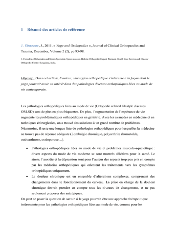 1 Résumé des articles de référence 1. Ebnezar, J., 2011, « Yoga and Orthopedics », Journal of Clinical Orthopaedics and Trauma, December, Volume 2 (2), pp 93-98. 1. Consulting Orthopedic and Sports Specialist, Spine surgeon, Holistic Orthopedic Expert. Parimala Health Care Service and Ebnezar Orthopedic Center, Bengalore, India. Objectif : Dans cet article, l’auteur, chirurgien orthopédique s’intéresse à la façon dont le yoga pourrait avoir un intérêt dans des pathologies diverses orthopédiques liées au mode de vie contemporain. Les pathologies orthopédiques liées au mode de vie (Ortopedic related lifestyle diseases ORLSD) sont de plus en plus fréquentes. De plus, l’augmentation de l’espérance de vie augmente les problématiques orthopédiques en gériatrie. Avec les avancées en médecine et en techniques chirurgicales, on a trouvé des solutions à un grand nombre de problèmes. Néanmoins, il reste une longue liste de pathologies orthopédiques pour lesquelles la médecine ne trouve pas de réponse adéquate (Lombalgie chronique, polyarthrite rhumatoïde, ostéoarthrose, ostéoporose…). Pathologies orthopédiques liées au mode de vie et problèmes musculo-squelettique : divers aspects du mode de vie moderne se sont montrés délétères pour la santé. Le stress, l’anxiété et la dépression sont pour l’auteur des aspects trop peu pris en compte par les médecins orthopédiques qui orientent les traitements vers les symptômes orthopédiques uniquement. La douleur chronique est un ensemble d’altérations complexes, comprenant des changements dans le fonctionnement du cerveau. La prise en charge de la douleur chronique devrait prendre en compte tous les niveaux de changement, et ne pas seulement proposer des antalgiques. On peut se poser la question de savoir si le yoga pourrait être une approche thérapeutique intéressante pour les pathologies orthopédiques liées au mode de vie, comme pour les douleurs chroniques. Le yoga peut intervenir sur la détente du corps, sur le ralentissement de la respiration, sur l‘apaisement du mental, sur la transformation des pensées négatives. D’après des études scientifiques, le yoga équilibre le système nerveux et le système endocrinien, qui ensemble influent sur un grand nombre de systèmes et d’organes. Les différents effets du yoga : Biochimique : le yoga diminue, comme d’autres activités physiques, le stress qui a un effet oxydatif, et stimule la production d’une enzyme qui élimine les radicaux libres. Biomécanique : le yoga tonifie les muscles squelettiques et antigravitaires, augmente les amplitudes articulaires et assouplit le corps dans sa globalité. Il améliore la posture, l’équilibre et la coordination. Diminution de la douleur : en renforçant le système musculaire par le yoga, on stabilise les articulations et on diminue les sensibilités liées à l’instabilité articulaire, de ce fait la douleur diminue. De plus, le yoga influe sur le système nerveux central en diminuant l’épinephrine, qui est un neurotransmetteur de la douleur. Diminution du stress : le yoga équilibre les systèmes sympathique et parasympathique et de ce fait aide à réguler la sécrétion des hormones liées au stress, et par conséquent diminue l’anxiété et la dépression. Co-morbidité : le yoga a une influence positive sur d’autres pathologies telles le diabète, l’hypertension artérielle, l’obésité, l’ostéoporose entre autres. Conclusion : En conclusion nous pouvons dire que la plupart des troubles liés au mode de vie moderne sont liées au stress, et des situations de douleur chronique, avec des répercussions cognitives. En regard, le yoga est une approche holistique, abordant l’ensemble corps-esprit. Il ne coûte pas cher et peut influer positivement sur le stress et les facteurs associés. Dans notre société où le stress est omniprésent, le yoga peut être proposé en traitement complémentaire des soins en orthopédie. De cette manière, on pourrait réduire le stress en pré comme en post opératoire, et ainsi réduire les médicaments prescrits. 2. Evans S., Tsao J., Sternlieb B., Zeltzer L., 2009, « Using the Biopsychosocial Model to understand the Health Benefits of Yoga », Journal of Complementary and Integrative Medecine, Vol : 6 (1), article 15. 1. University of California, Los Angeles, USA. Objet : Dans cet article, les auteurs analysent, à partir des études publiées, les bienfaits du yoga sur la santé, à partir du modèle biopsychosocial. Le yoga est une discipline spirituelle et métaphysique indienne très ancienne. Traditionnellement le yoga consiste en 8 étapes : Yama (comportement social), Niyama (discipline personnelle), Asanas (postures), Pranayama (Respiration), Pratyahara (retrait des sens), dhyana (méditation), dharana (concentration) et samadhi (conscience méditative profonde). Depuis le siècle dernier, la pratique du yoga s’est étendue en Inde et en occident. On a également commencé à pratiquer le yoga dans un contexte médical. De nombreuses études ont été menées pour étudier les bienfaits du yoga sur des pathologies spécifiques. L’objet de cet article est de rendre compte des bienfaits dans le domaine biologique, psychologique, social et spirituel, d’après le système biopsychosocial. La pratique du yoga aujourd’hui s’articule autour des postures (asanas), la respiration, (pranayama), la détente (shavasana) et de la méditation (dhyana). Il existe des écoles de yoga différentes. Nous citons les plus connues : le Yoga Iyengar, qui met l’accent sur l’alignement du corps et sur son ajustement avec précision. Dans cette école de yoga, on porte une attention particulière à la l’ordre des postures (la séquence) et on peut tenir la posture pendant un certain temps. Une autre école est l’Asthanga Yoga, où la synchronisation de la respiration avec les mouvements en succession rapide est l’objet prin