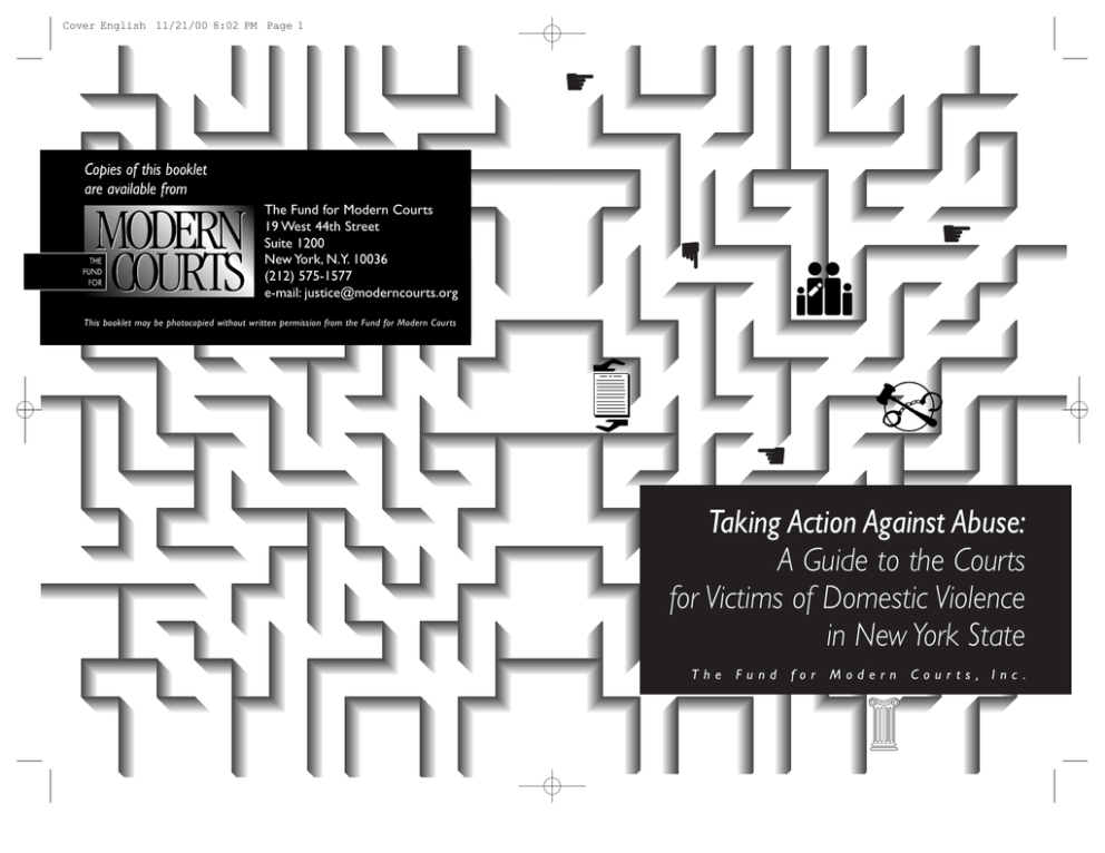 Cover English 11/21/00 8:02 PM Page 1 ☛ Copies of this booklet are available from ☛ ☛ The Fund for Modern Courts 19 West 44th Street Suite 1200 New York, N.Y. 10036 (212) 575-1577 e-mail: [email protected] This booklet may be photocopied without written permission from the Fund for Modern Courts ☛ Taking Action Against Abuse: A Guide to the Courts for Victims of Domestic Violence in New York State The Fund for Modern Cour ts, Inc . Cover English 11/21/00 8:02 PM Page 3 Special thanks to the New York Community Trust— Robert M. Kaufman Fund whose generous grant made this publication possible Bklt.-5 x 7-English WEB 11/21/00 7:55 PM Page i Taking Action Against Abuse: A Guide to the Courts for Victims of Domestic Violence in New York State Published by The Fund for Modern Courts, Inc. in partnership with The Pace University Battered Women’s Justice Center December 1998 TITLE OF BOOKLET <#> Bklt.-5 x 7-English WEB 11/21/00 7:55 PM Page ii CONTENTS PART I: INTRODUCTION ACKNOWLEDGMENTS This booklet was developed by Gary S. Brown and Alan B. Beck of the Fund for Modern Courts and Vicki L. Lutz of the Pace University Battered Women’s Justice Center. Mr. Beck is the principal author. Special thanks to the experts across New York State who reviewed the draft of this guide and made many improvements in the text: Hon. Jo Ann Friia, Judge of the White Plains City Court; Hon. Linda C. Griffin, Judge of the Rensselaer County Family Court; Hon. Judy Harris Kluger, Administrative Judge of the Criminal Court of the City of New York; Joanne Sarro, Counsel to Judge Kluger; Lisa Frisch, Wendy Maher, Sujata Warrier, Gwen Wright, and Theresa M. Zubretsky of the New York State Office for the Prevention of Domestic Violence; Sherry Frohman and Patti Jo Newell of the New York State Coalition Against Domestic Violence; Lisa Rodwin and Dale Hall of the Erie County District Attorney’s Office; Jeanne B. Mullgrav, Rita Asen, Joan Lilly, Jean Olsen, Paula Rogowsky, Bobbi Tannenbaum and Javiel Vega of the Victim Services Agency; Linda M. Mussillo of the International Center for the Disabled; and Jennifer Brown and Jennifer deWolf, interns with the Pace University Battered Women’s Justice Center. Thanks also to Simone Lewis of the Fund for Modern Courts for her assistance in compiling information for the resource list which accompanies this guide. Funding for this booklet was provided by a generous grant from the New York Community Trust—Robert M. Kaufman Fund. Copyright 1998 The Fund for Modern Courts, Inc. ii TAKING ACTION AGAINST ABUSE: A GUIDE TO THE COURTS FOR VICTIMS OF DOMESTIC VIOLENCE About This Booklet . . . . . . . . . . . . . . . . . . . . . . . . . . . . . . . . 1 Other Guides . . . . . . . . . . . . . . . . . . . . . . . . . . . . . . . . . . . . 1 The Epidemic of Domestic Violence . . . . . . . . . . . . . . . . . . . 2 Are You a Victim of Domestic Violence? . . . . . . . . . . . . . . . . 3 How Can a Domestic Violence Advocate Help Me? . . . . . . 4 Should I Leave the Relationship? . . . . . . . . . . . . . . . . . . . . . 5 What is a “Personal Safety Plan,” and Why Should I Have One?. . . . . . . . . . . . . . . . . . . . . . . . . . . . . . . . . . 6 PART II:TAKING ACTION AGAINST DOMESTIC VIOLENCE What Can the Family Court Do for Me? . . . . . . . . . . . . . . . 7 What Can a Criminal Court Do for Me? . . . . . . . . . . . . . . . 8 What is an Order of Protection?. . . . . . . . . . . . . . . . . . . . . . 8 In Which Court Will My Case Be Heard?. . . . . . . . . . . . . . . 9 PART III: GOING TO FAMILY COURT Which Courthouse Do I Go To? . . . . . . . . . . . . . . . . . . . . . 12 When Is the Family Court Open?. . . . . . . . . . . . . . . . . . . . 12 Can I Bring My Child to Family Court with Me? . . . . . . . . 13 What Kind of Case Do I Bring in Family Court? . . . . . . . . 14 What Should I Bring with Me to Family Court? . . . . . . . . . 14 Where Do I Go to Start a Case in the Family Court? . . . . 15 What Should I Tell the Petition Clerk?. . . . . . . . . . . . . . . . . 15 Should I Read the Petition Before I Sign It? . . . . . . . . . . . . 16 What Happens When I Go Before a Family Court Judge?—Getting a Temporary Order of Protection. . . . 17 How is the Temporary Order of Protection Delivered to the Abuser? . . . . . . . . . . . . . . . . . . . . . . . . . . . . . . . 17 How Long Does the Temporary Order of Protection Remain in Effect?. . . . . . . . . . . . . . . . . . . . . . . . . . . . . 18 What Other Relief is Available? . . . . . . . . . . . . . . . . . . . . . 18 Do I Have a Right to a Lawyer? . . . . . . . . . . . . . . . . . . . . 18 When Do I Meet My Lawyer? . . . . . . . . . . . . . . . . . . . . . . 19 TAKING ACTION AGAINST ABUSE: A GUIDE TO THE COURTS FOR VICTIMS OF DOMESTIC VIOLENCE iii Bklt.-5 x 7-English WEB 11/21/00 7:55 PM Page ii CONTENTS PART I: INTRODUCTION ACKNOWLEDGMENTS This booklet was developed by Gary S. Brown and Alan B. Beck of the Fund for Modern Courts and Vicki L. Lutz of the Pace University Battered Women’s Justice Center. Mr. Beck is the principal author. Special thanks to the experts across New York State who reviewed the draft of this guide and made many improvements in the text: Hon. Jo Ann Friia, Judge of the White Plains City Court; Hon. Linda C. Griffin, Judge of the Rensselaer County Family Court; Hon. Judy Harris Kluger, Administrative Judge of the Criminal Court of the City of New York; Joanne Sarro, Counsel to Judge Kluger; Lisa Frisch, Wendy Maher, Sujata Warrier, Gwen Wright, and Theresa M. Zubretsky of the New York State Office for the Prevention of Domestic Violence; Sherry Frohman and Patti Jo Newell of the New York State Coalition Against Domestic Violence; Lisa Rodwin and Dale Hall of the Erie County District Attorney’s Office; Jeanne B. Mullgrav, Rita Asen, Joan Lilly, Jean Olsen, Paula Rogowsky, Bobbi Tannenbaum and Javiel Vega of the Victim Services Agency; Linda M. Mussillo of the International Center for the Disa