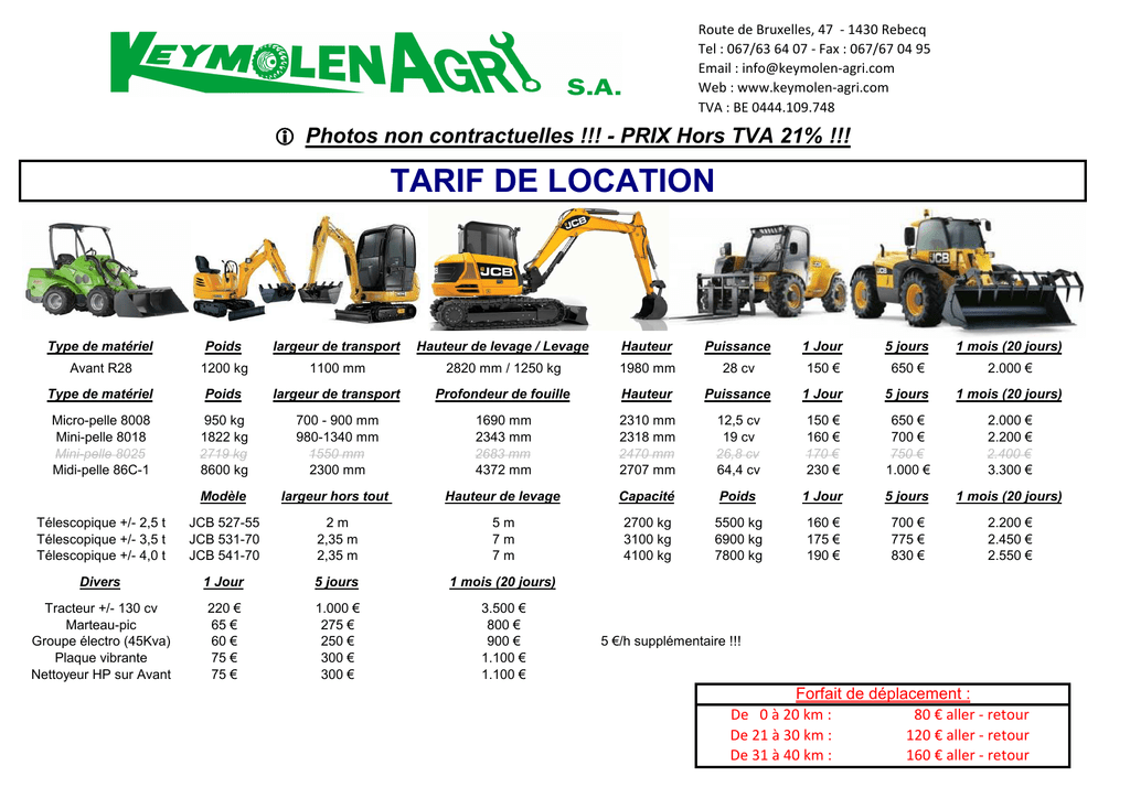 Route de Bruxelles, 47 - 1430 Rebecq Tel : 067/63 64 07 - Fax : 067/67 04 95 Email : [email protected] Web : www.keymolen-agri.com TVA : BE 0444.109.748 Photos non contractuelles !!! - PRIX Hors TVA 21% !!! TARIF DE LOCATION Type de matériel Poids largeur de transport Hauteur de levage / Levage Hauteur Puissance 1 Jour 5 jours 1 mois (20 jours) Avant R28 1200 kg 1100 mm 2820 mm / 1250 kg 1980 mm 28 cv 150 € 650 € 2.000 € Type de matériel Poids largeur de transport Profondeur de fouille Hauteur Puissance 1 Jour 5 jours 1 mois (20 jours) Micro-pelle 8008 Mini-pelle 8018 Mini-pelle 8025 Midi-pelle 86C-1 950 kg 1822 kg 2719 kg 8600 kg 700 - 900 mm 980-1340 mm 1550 mm 2300 mm 1690 mm 2343 mm 2683 mm 4372 mm 2310 mm 2318 mm 2470 mm 2707 mm 12,5 cv 19 cv 26,8 cv 64,4 cv 150 € 160 € 170 € 230 € 650 € 700 € 750 € 1.000 € 2.000 € 2.200 € 2.400 € 3.300 € Modèle largeur hors tout Hauteur de levage Capacité Poids 1 Jour 5 jours 1 mois (20 jours) Télescopique +/- 2,5 t Télescopique +/- 3,5 t Télescopique +/- 4,0 t JCB 527-55 JCB 531-70 JCB 541-70 2m 2,35 m 2,35 m 5m 7m 7m 2700 kg 3100 kg 4100 kg 5500 kg 6900 kg 7800 kg 160 € 175 € 190 € 700 € 775 € 830 € 2.200 € 2.450 € 2.550 € Divers 1 Jour 5 jours 1 mois (20 jours) Tracteur +/- 130 cv Marteau-pic Groupe électro (45Kva) Plaque vibrante Nettoyeur HP sur Avant 220 € 65 € 60 € 75 € 75 € 1.000 € 275 € 250 € 300 € 300 € 3.500 € 800 € 900 € 1.100 € 1.100 € 5 €/h supplémentaire !!! Forfait de déplacement : De 0 à 20 km : 80 € aller - retour De 21 à 30 km : 120 € aller - retour De 31 à 40 km : 160 € aller - retour Route de Bruxelles, 47 - 1430 Rebecq Tel : 067/63 64 07 - Fax : 067/67 04 95 Email : [email protected] Web : www.keymolen-agri.com CONDITIONS GENERALES DE LOCATION Article 1 – GENERALITES Nos locations sont exclusivement soumises aux conditions ci-après. Les conditions du client locataire ne sont opposables que si nous les avons préalablement acceptées de façon formelle et écrite. Les dimensions, poids, photos et autres caractéristiques sont à considérer comme indicatifs. Le matériel loué est celui qui disponible et en stock en lieu et date de la location. Le client s'engage à suivre les conseils techniques d'utilisation et plus généralement, privilégier le bon état général de fonctionnement et de propreté du matériel loué. Par dérogation à l’article 1583 du code civil, le matériel reste l'entière propriété de la S.A. Keymolen Agri, même si celles-ci ont été rendues immeubles par incorporation ou par destination. Dès lors, le locateur s’interdit d’en disposer d’une quelconque manière. Article 2 – DU PRIX ET DU PAIEMENT DE LA LOCATION Tous les prix indiqués sont en EURO et hors T.V.A. 21%. Les prix sont valables pour une utilisation de maximum 8 heures par jour, 40 heures/semaine et 175 heures par mois. Les heures supplémentaires sont facturées à 20 €/h. Une caution du montant de la location est demandée et payable au plus tard, le matin même de la location. Nos tarifs sont donnés sans engagement, à titre indicatif et peuvent être soumis à révision. Toutefois, les prix en vigueur au jour de la location sont d'application. Le locataire renonce à invoquer une variation de prix pour annuler la commande, l Les bons de location signés sont censés être acceptés! Néanmoins, la location peut être, sans frais, annulée moyennant écrit au plus 24 heures précédant la location. Tous les paiements doivent être faits comptant à notre siège. Le non-paiement à l’échéance convenue entraîne de plein droit et sans mise en demeure un intérêt de retard de 1% par jour de retard à partir de la date de la location. En outre, à défaut d'un paiement dans les 15 jours après l’envoi d’une lettre recommandée de mise en demeure, une indemnité égale à 15% du solde restant dû avec un minimum de 65 euros est exigible. Indépendamment de ce qui précède, nous nous réservons le droit, en cas de retard de paiement, d’interrompre la location, de résilier le contrat et de reprendre le matériel loué. Le client ne peut invoquer un mauvais fonctionnement des marchandises pour suspendre le paiement. Article 3 – DE LA LOCATION Les engins loués sont équipés d'un godet minimum. D'autres accessoires peuvent être disponible sur demande. Toutefois, pour des accessoires spécifiques un forfait supplémentaire vous sera demandé. Le matériel est fourni avec le plein effectué. Il sera remis avec le plein fait complètement sans quoi le carburant vous sera facturé en sus au prix du marché. Le carburant à utiliser est généralement du mazout rouge extra. Le locataire est responsable de tout dégât occasionné au matériel, qu'il s'agisse d'une mauvaise utilisation, une négligence d'entretien ou dû au transport par ses soins. Le locataire le locataire seul responsable en cas delevol ou dégradation matériel celle-ci pendantvoyage toute la durée la location. Aucune n'est autorisée. Dans le cas est où le effectue lui-même déplacement de ladumachine, sous sa de responsabilité. Dans lesous-location cas malheureux d'un accident ou autre incident endommageant le matériel loué, tous les frais seront pris à charge du locataire. Article 4 – DE L'ENTRETIEN DU MATERIEL Le carburant, les assurances (vol et bris de machine), les crevaisons, les dégâts éventuels dus à une mauvaise utilisation du matériel ou à un accident sont à charge, seul, du locataire. Dans le cas d'une location de plus de 3 jours, le contrôle, les remise à niveau sont à effectuer journalièrement par le locataire. Outre ces recommandation, le locataire s’engage à entretenir le matériel en bon père de famille et le tenir à disposition. Article 5 – RECLAMATIONS Toutes réclamations doivent nous être faites par écrit dans les 8 jours suivant la location. Article 6 – TRIBUNAUX COMPETENTS En cas de différend,