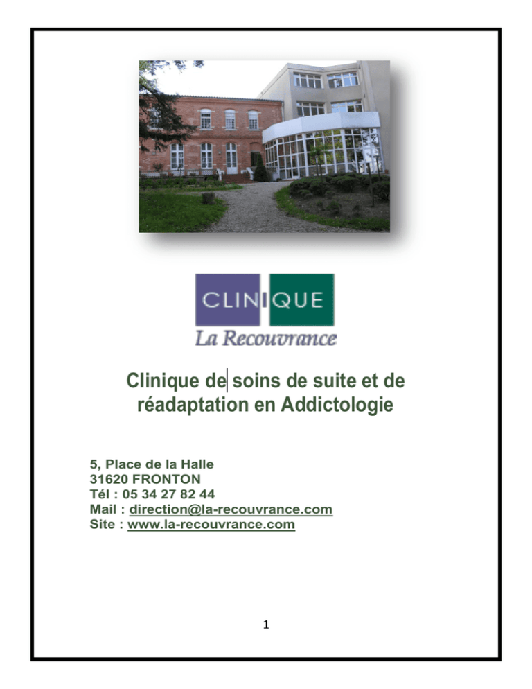 Clinique de soins de suite et de réadaptation en Addictologie 5, Place de la Halle 31620 FRONTON Tél : 05 34 27 82 44 Mail : [email protected] Site : www.la-recouvrance.com 1 MOT DU DIRECTEUR Madame, Mademoiselle, Monsieur, Bienvenue à la Clinique de Soins de Suite et de réadaptation (SSR) La Recouvrance, appartenant au groupe Santé Actions. Nous avons conçu le livret qui vous est remis afin de faciliter votre séjour. Il vous permet de mieux appréhender le fonctionnement de nos services, de préparer votre admission, de connaître les conditions de déroulement du séjour, ainsi que vos droits et vos devoirs,... et de disposer, ainsi que votre entourage familial, de toutes les informations pratiques et utiles permettant de répondre à vos interrogations. La clinique La Recouvrance est un établissement de soins de suite et de réadaptation spécialisé dans les affections liées aux conduites addictives. L’exercice de cette activité de soins hospitalière est autorisé par l’Agence Régionale de Santé de Midi-Pyrénées. La clinique accueille des personnes ayant une conduite de dépendance comportementale ou associée à une substance psychoactive (alcool, drogue...) et engagées dans un processus de soins en addictologie après sevrage. Ses missions sont axées sur le retour du patient vers son lieu de vie. Votre admission dans nos locaux hospitaliers entre soins de courte durée et retour à domicile ou secteur médico-social constitue une étape importante de votre prise en charge résidentielle après des soins aigus pour consolider votre abstinence. Un projet thérapeutique médico-psycho-social vous est proposé pendant votre séjour où la réadaptation est un objectif essentiel. Il est mis en œuvre dans une concertation avec tous les acteurs de la filière de soins addictologiques, et tous les acteurs de la réinsertion (habitat, professionnel, aide à domicile, soins à domicile…) La Direction, les équipes médicales et soignantes et l’ensemble du personnel, sont à votre service. 2 SOMMAIRE La prise en charge en SSR d’addictologie A- Objectif de la prise en charge B- Le Projet thérapeutique individualisé C- Les modalités de la prise en charge D- L’organisation des soins E- L’équipe de soins F- Votre séjour G- L’établissement H- Accès à l’établissement 3 LA PRISE EN CHARGE EN SSR ADDICTOLOGIE A- L’OBJECTIF DE LA PRISE EN CHARGE L’établissement a pour objet de consolider le sevrage et de favoriser la réinsertion des personnes ayant une conduite de dépendance comportementale ou associée à une substance psychoactive (alcool, drogue...) et engagées dans un processus de soins en addictologie. Ce séjour de maintien d’abstinence intervient après un sevrage, réalisé en milieu hospitalier ou en ambulatoire. Dans ce but, il associe un suivi médical, une aide psychothérapeutique individuelle et collective, un programme socio-éducatif pour une durée de 5 semaines orientées selon un projet thérapeutique individualisé. Cette démarche de réadaptation repose sur des équipes pluridisciplinaires et un plateau technique spécifique tenant compte de l’état de santé du patient. Le patient doit être volontaire, prêt et motivé pour : - être en mesure de réfléchir sur son comportement addictif et élaborer un changement, - accepter ce travail sur soi dans un lieu et un temps propices à la restauration de la personne sur les plans physique, psychologique et social, - adhérer aux objectifs thérapeutiques et aux conditions du séjour au sein de l’établissement La Recouvrance, - adhérer au contrat thérapeutique proposé par la structure La Recouvrance et être acteur de ses soins. 4 B- LE PROJET THERAPEUTIQUE INDIVIDUALISE Le projet thérapeutique est centré sur les objectifs suivants : B-1 CONSOLIDATION GLOBALE Afin d’obtenir et de maintenir un état de rémission la plus complète et la plus stable possible sur le plan addictologique, les soins ont pour objectif d’aider le patient à prévenir et à réduire les conséquences fonctionnelles, physiques, cognitives, psychologiques, relationnelles et socio-professionnelles engendrées par l’addiction. A travers les ateliers thérapeutiques, le patient peut restaurer ses capacités, réapprendre la confiance en soi et retrouver l’estime de lui. Il peut également diversifier ses sources de gratification, retrouver des désirs et des plaisirs perdus. L’éloignement du produit et des situations à risque permet la réduction voire la disparition du craving (envies pathologiques de l’usage du produit ou de la conduite addictive, symptôme de la maladie addictive), ce qui participe à restaurer la confiance en soi. L’objectif global du séjour est de consolider le sevrage et de prolonger l’abstinence pour établir un projet thérapeutique durable, afin de gérer les situations à risques, limiter les re-consommations, réduire en fréquence et en gravité les rechutes, globalement maintenir un état de rémission la plus complète possible et la plus stable possible après la sortie, même si le projet de sortie n’est pas celui du maintien de l’abstinence totale. 5 B-2 REHABILITATION DE SOI, TRAVAIL PSYCHODYNAMIQUE Aider le patient à identifier ce qui l’a amené à devenir dépendant, ce qui a entretenu la dépendance, l’aider à traiter les éventuels psycho-traumas, à gérer son stress, ses émotions, à identifier ce qu’il peut changer dans son approche de lui-même et de son environnement pour qu’il puisse se protéger de son addiction. B-3 RESOCIALISATION ET REFLEXION FAMILIALE Aider le patient à retrouver sa place dans le groupe, dans son environnement social et familial. B- 4 L’EDUCATION THERAPEUTIQUE Sont proposés des ateliers d’éducation thérapeutique en lien avec les consommations de substances psychoactives (alcool, drogue, etc...) ou les conduites addictives sans produit (jeu, troubles du comportement alimentaire, travail, sport