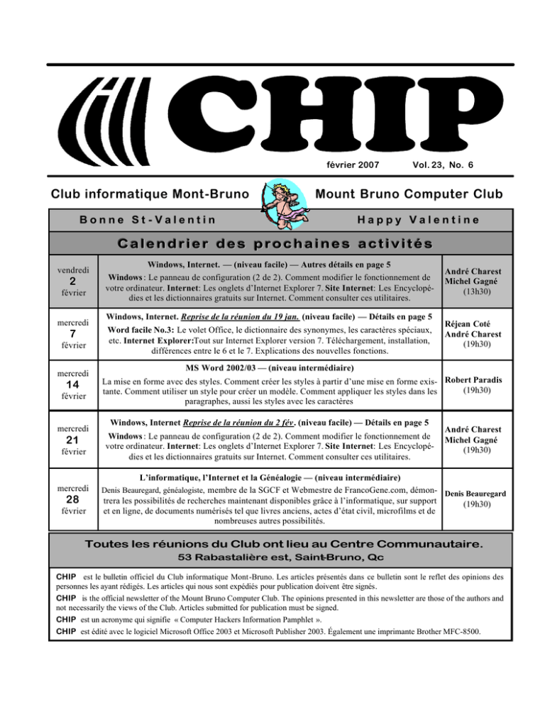 octobre décembre février 2007 2006 2006 Club informatique Mont-Bruno Vol. 23, No. 6 2 4 Mount Bruno Computer Club Bonne St-Valentin Happy Valentine C Ca alle en nd drriie err d de es s p prro oc ch ha aiin ne es s a ac cttiiv viitté és s vendredi 2 février mercredi 7 février mercredi 14 février mercredi 21 février Windows, Internet. — (niveau facile) — Autres détails en page 5 Windows : Le panneau de configuration (2 de 2). Comment modifier le fonctionnement de votre ordinateur. Internet: Les onglets d’Internet Explorer 7. Site Internet: Les Encyclopédies et les dictionnaires gratuits sur Internet. Comment consulter ces utilitaires. Windows, Internet. Reprise de la réunion du 19 jan. (niveau facile) — Détails en page 5 Word facile No.3: Le volet Office, le dictionnaire des synonymes, les caractères spéciaux, etc. Internet Explorer:Tout sur Internet Explorer version 7. Téléchargement, installation, différences entre le 6 et le 7. Explications des nouvelles fonctions. André Charest Michel Gagné (13h30) Réjean Coté André Charest (19h30) MS Word 2002/03 — (niveau intermédiaire) La mise en forme avec des styles. Comment créer les styles à partir d’une mise en forme exis- Robert Paradis (19h30) tante. Comment utiliser un style pour créer un modèle. Comment appliquer les styles dans les paragraphes, aussi les styles avec les caractères Windows, Internet Reprise de la réunion du 2 fév. (niveau facile) — Détails en page 5 Windows : Le panneau de configuration (2 de 2). Comment modifier le fonctionnement de votre ordinateur. Internet: Les onglets d’Internet Explorer 7. Site Internet: Les Encyclopédies et les dictionnaires gratuits sur Internet. Comment consulter ces utilitaires. André Charest Michel Gagné (19h30) L’informatique, l’Internet et la Généalogie — (niveau intermédiaire) mercredi 28 février Denis Beauregard, généalogiste, membre de la SGCF et Webmestre de FrancoGene.com, démon- Denis Beauregard trera les possibilités de recherches maintenant disponibles grâce à l’informatique, sur support et en ligne, de documents numérisés tel que livres anciens, actes d’état civil, microfilms et de nombreuses autres possibilités. (19h30) Toutes les réunions du Club ont lieu au Centre Communautaire. 53 Rabastalière est, Saint-Bruno, Qc CHIP est le bulletin officiel du Club informatique Mont-Bruno. Les articles présentés dans ce bulletin sont le reflet des opinions des personnes les ayant rédigés. Les articles qui nous sont expédiés pour publication doivent être signés. CHIP is the official newsletter of the Mount Bruno Computer Club. The opinions presented in this newsletter are those of the authors and not necessarily the views of the Club. Articles submitted for publication must be signed. CHIP est un acronyme qui signifie « Computer Hackers Information Pamphlet ». CHIP est édité avec le logiciel Microsoft Office 2003 et Microsoft Publisher 2003. Également une imprimante Brother MFC-8500. Club informatique Mont-Bruno u Mount Bruno Computer Club ÉQUIPE DE DIRECTION Le Club informatique possède une adresse courriel (e-mail address): [email protected] Visitez la page d’accueil du Club sur Internet à l’adresse suivante: Visit our WEB site and find out about the Club activities: http://www.cimbcc.ca Adresse postale: Club informatique Mont-Bruno a/s Service de la Récréation 1585 rue Montarville Saint-Bruno de Montarville, Qc J3V 3T8 PERSONNES RESSOURCES André Bergeron relations publiques Normand Desmarais activités spéciales Walter Pearce Carnet d’adresses Internet coordonnateur mentors Gérard Carignan(450)653-1811 Albert Richard « membership » Gérard Couture éditeur du CHIP Robert Paradis accueil réunions Jaques Savoie « coffee master » André P. Roy 3 • Message du président 4 • Le Coin du Curieux FORMATION DES MEMBRES Carmen Gamache 6 Richard Bérubé Denis Bélanger Walter Pearce Gérard Couture Réjean Coté « web master » matériel didactique Sommaire 2 président vice-président trésorier secrétaire président sortant • L’informatique n’est pas un jeu, c’est une aventure… planification Roch Lafrance formation bibliothèque Réjean Coté Michel Gagné Robert Paradis 7 • Computer Hardware Course 102 Robert Paradis 8 • Échos de l’Équipe de Direction Gérard Couture Carnet d’adresses Internet Par Albert Richard Juke Box http://www.bobforrest.com/JukeBox.htm 3-D and SIRDS stereogram images http://archive.museophile.org/3d/ 2 novices applications internet thèmes avancés thèmes spéciaux Robert Bujold André Charest Robert Paradis Albert Richard Pierre St-Aubin PROJET RECYCLAGE D’ORDINATEURS Pierre St-Aubin. Email/Courriel: [email protected] Mon site à http://pages.infinit.net/alber Broadband Speed Test http://www.bplspeedtest.com/ Autres Formateurs: Pour informations: (450) 653-4871 Fondé en 1983, le Club informatique Mont-Bruno est une société incorporée sans but lucratif. Ses administrateurs et ses animateurs déclinent donc toute responsabilité envers les participants aux soirées d’information verbale ou écrite. De plus, nous déclinons toute responsabilité sur les conséquences possibles de vos expériences que vous seriez tentés de faire, suite à ce que vous auriez entendu ou discuté entre membres du Club, aux soirées ou ailleurs. Founded in 1983 by M. Gordon Craig, minister of the United Church in St-Bruno, Mount Bruno Computer Club is incorporated as a non-profit organization. All responsabilities are declined as described in the French text above. CHIP février 2007 Vol. 23, No. 6 Message du président Richard Bérubé Nous voici déjà rendus à vous présenter la programmation de février. En consultant la première page, vous noterez qu’il y aura une présentation de niveau facile le vendredi 2 février et que les mercredis seront en alternance de niveau facile et intermédiaire. En plus de la description de la programmation dans le CHIP