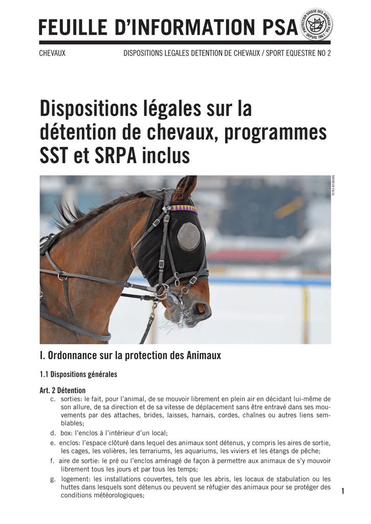 CHEVAUX ROTECTION ·P DE X MAU PSA · NI FEUILLE D’INFORMATION PSA ISSE DES A SU PUIS 18 6 1 DISPOSITIONS LEGALES DETENTION DE CHEVAUX / SPORT EQUESTRE NO 2 PETRA WEGMANN Dispositions légales sur la détention de chevaux, programmes SST et SRPA inclus I. Ordonnance sur la protection des Animaux 1.1 Dispositions générales Art. 2 Détention c. sorties: le fait, pour l’animal, de se mouvoir librement en plein air en décidant lui-même de son allure, de sa direction et de sa vitesse de déplacement sans être entravé dans ses mouvements par des attaches, brides, laisses, harnais, cordes, chaînes ou autres liens semblables; d. box: l’enclos à l’intérieur d’un local; e. enclos: l’espace clôturé dans lequel des animaux sont détenus, y compris les aires de sortie, les cages, les volières, les terrariums, les aquariums, les viviers et les étangs de pêche; f. aire de sortie: le pré ou l’enclos aménagé de façon à permettre aux animaux de s’y mouvoir librement tous les jours et par tous les temps; g. logement: les installations couvertes, tels que les abris, les locaux de stabulation ou les huttes dans lesquels sont détenus ou peuvent se réfugier des animaux pour se protéger des conditions météorologiques; 1 PROTECTION SUISSE DES ANIMAUX PSA DISPOSITIONS LEGALES DETENTION DE CHEVAUX / SPORT EQUESTRE NO 2 o. utilisation: 1. d’un cheval: le travail sous la selle, à la main ou à l’attelage et les déplacements de l’animal dans un carrousel, 2. + 3. (ne concernent pas les chevaux) p. chevaux: les animaux domestiqués de l’espèce équine, c’est-à-dire les chevaux proprement dits, les poneys, les ânes, les mulets et les bardots; q. jeunes chevaux: les poulains sevrés qui n’ont pas encore atteint l’âge d’une utilisation régulière, mais qui sont âgés de 30 mois au plus; Art. 3 Principes Les animaux doivent être détenus et traités de manière à ce que leurs fonctions corporelles et leur comportement ne soient pas gênés et que leur faculté d’adaptation ne soit pas sollicitée de manière excessive. 2 Les logements et les enclos doivent être munis de mangeoires, d’abreuvoirs, d’emplacements de défécation et d’urinement, de lieux de repos et de retraite couverts, de possibilités d’occupation, de dispositifs pour les soins corporels et d’aires climatisées adéquats. 3 L’alimentation et les soins sont appropriés s’ils répondent aux besoins des animaux à la lumière de l’expérience acquise et des connaissances en physiologie, éthologie et hygiène. 4 Les animaux ne doivent pas être détenus en permanence à l’attache. 1 Art. 4 Alimentation Les animaux doivent recevoir régulièrement et en quantité suffisante une nourriture leur convenant et de l’eau. Lorsque des animaux sont détenus en groupe, le détenteur doit veiller à ce que chacun d’eux reçoive suffisamment d’eau et de nourriture. 2 Les animaux doivent pouvoir exprimer le comportement d’occupation propre à l’espèce en relation avec la prise de nourriture. 3 Des animaux vivants ne peuvent être donnés en pâture qu’à des animaux sauvages; ceux-ci doivent pouvoir capturer et tuer leur proie comme ils le font en liberté dans la nature, et: a. leur alimentation ne peut être fournie au moyen d’animaux morts ou d’autres aliments; b. un retour dans le milieu naturel est prévu, ou c. l’animal sauvage et sa proie sont détenus dans le même enclos; ce dernier doit être aménagé de manière à être conforme également aux besoins de la proie. 1 Art. 5 Soins Le détenteur d’animaux doit contrôler aussi souvent que nécessaire le bien-être de ses animaux et l’état des installations. Si celles-ci sont défectueuses et diminuent le bien-être des animaux, il doit les réparer sans délai ou prendre les mesures propres à assurer la protection des animaux. 2 Les soins ont pour but de prévenir maladies et blessures. Dès que des animaux sont malades ou blessés, le détenteur doit les loger, les soigner et les traiter d’une manière adaptée à leur état ou, à défaut, les mettre à mort. En cas de besoin, les installations nécessaires doivent être mises à disposition en temps utile. Il faut prévoir des installations permettant d’attacher les animaux qui subiront des traitements vétérinaires ou autres. 3 Le comportement de soins corporels propre à l’espèce ne doit pas être limité inutilement par la détention. Si ce comportement est restreint par la détention, il faut le remplacer par des soins. 4 Sabots, onglons, ongles et griffes doivent être soignés et coupés correctement et aussi souvent que nécessaire. Au besoin, les sabots doivent être ferrés dans les règles de l’art. 1 2 PROTECTION SUISSE DES ANIMAUX PSA DISPOSITIONS LEGALES DETENTION DE CHEVAUX / SPORT EQUESTRE NO 2 Art. 6 Protection contre les conditions météorologiques Le détenteur veille à fournir la protection nécessaire aux animaux qui ne peuvent s’adapter aux conditions météorologiques. Art. 7 Logements, enclos, sols Les logements et les enclos doivent être construits et équipés de façon à ce que: a. le risque de blessure pour les animaux soit faible; b. les animaux ne soient pas atteints dans leur santé, et c. les animaux ne puissent pas s’en échapper. 2 Les logements et les enclos doivent être construits, équipés et pourvus d’un espace suffisant de façon à ce que les animaux puissent y exprimer les comportements propres à l’espèce. 3 La nature des sols ne doit pas présenter de risque pour la santé des animaux. 1 Art. 8 Couches, box, dispositifs d’attache SLes couches, les box et les dispositifs d’attache doivent être conçus de telle façon qu’ils n’occasionnent pas de blessures et que les animaux puissent se tenir debout, se coucher, se reposer et se lever de la manière qui est propre à l’espèce. 2 Cordes, chaînes, licols et dispositifs d’attache similaires doivent être contrôlés réguli