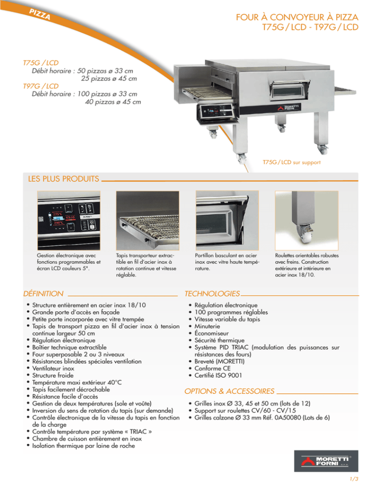 PIZ ZA FOUR À CONVOYEUR À PIZZA T75G / LCD - T97G / LCD T75G / LCD Débit horaire : 50 pizzas ø 33 cm 25 pizzas ø 45 cm T97G / LCD Débit horaire : 100 pizzas ø 33 cm 40 pizzas ø 45 cm T75G / LCD sur support LES PLUS PRODUITS Gestion électronique avec fonctions programmables et écran LCD couleurs 5". Tapis transporteur extractible en fil d’acier inox à rotation continue et vitesse réglable. DÉFINITION • • • • • • • • • • • • • • • • • • • Structure entièrement en acier inox 18/10 Grande porte d’accès en façade Petite porte incorporée avec vitre trempée Tapis de transport pizza en fil d’acier inox à tension continue largeur 50 cm Régulation électronique Boîtier technique extractible Four superposable 2 ou 3 niveaux Résistances blindées spéciales ventilation Ventilateur inox Structure froide Température maxi extérieur 40°C Tapis facilement décrochable Résistance facile d’accès Gestion de deux températures (sole et voûte) Inversion du sens de rotation du tapis (sur demande) Contrôle électronique de la vitesse du tapis en fonction de la charge Contrôle température par système « TRIAC » Chambre de cuisson entièrement en inox Isolation thermique par laine de roche Portillon basculant en acier inox avec vitre haute température. Roulettes orientables robustes avec freins. Construction extérieure et intérieure en acier inox 18/10. TECHNOLOGIES • • • • • • • Régulation électronique 100 programmes réglables Vitesse variable du tapis Minuterie Économiseur Sécurité thermique Système PID TRIAC (modulation des puissances sur résistances des fours) • Breveté (MORETTI) • Conforme CE • Certifié ISO 9001 OPTIONS & ACCESSOIRES • Grilles inox Ø 33, 45 et 50 cm (lots de 12) • Support sur roulettes CV/60 - CV/15 • Grilles calzone Ø 33 mm Réf. 0A50080 (Lots de 6) 1/3 T75G / /LCD T97G / /LCD T75G / LCD : montée sur support hauteur 600 mm LES CARACTÉRISTIQUES TECHNIQUES T75G / LCD Puissance gaz (kW) 17 Alimentation 50 Hz 400 V 3 N / 230 V 3 Consommation horaire gaz (m /h) 3 2,09 Débit horaire Pizza ø 33 cm 50 Pizza ø 45 cm 25 Dimensions / Poids Dimensions extérieures (lxpxh) (mm) 1774x1353x560 Hauteur du socle roulette extérieur (mm) 600 Dimensions intérieures (lxpxh) (mm) 990x750x80 Poids net (kg) 260 2/3 T75G / /LCD T97G / /LCD T97G / LCD : montée sur support hauteur 600 mm VUE DESSUS VUE ARRIERE VUE COTE LES CARACTÉRISTIQUES TECHNIQUES T97G / LCD Puissance gaz (kW) 32 Alimentation 50 Hz 400 V 3 N / 230 V 3 Consommation horaire gaz (m /h) 3 3,93 Débit horaire Pizza ø 33 cm 100 Pizza ø 45 cm 40 Dimensions / Poids Dimensions extérieures (lxpxh) (mm) 2024x1653x560 Hauteur du socle roulette extérieur (mm) 600 Dimensions intérieures (lxpxh) (mm) 740x500x80 Poids net (kg) 335 04/16 (SOUS RÉSERVE DE MODIFICATION) 3/3