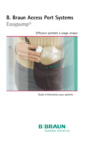 B. Braun Access Port Systems Easypump® Diffuseur portable à usage unique Guide d’information pour patients Sommaire Introduction 3 Description du produit 4 Glossaire 5 Conservation du diffuseur portable Easypump® après remplissage 6 Connexion d’Easypump® à un accès veineux central ou périphérique? 8 Notes de suivi de traitement Sommaire 11 INTRODUCTION Afin d’améliorer votre traitement et d’accélérer votre guérison, on vous a prescrit un traitement incluant une perfusion continue ou intermittente de médicaments par voie intra-veineuse, intraartérielle, sous-cutanée ou intra-rachidienne. Jusqu’à présent, ce traitement nécessitait une hospitalisation longue couvrant toute la période du traitement. Grâce aux systèmes de perfusion par diffuseur portable Easypump®, votre traitement peut être facilement réalisé à domicile ou en ambulatoire. Easypump® est un système de perfusion à membrane élastomérique délivrant régulièrement les médicaments grâce à la seule propriété énergétique de son élastomère. Le principe de fonctionnement d’Easypump® est simple : un ballon en élastomère est rempli avec un médicament qui est ensuite «poussé» au travers d’une tubulure munie d’un régulateur qui contrôle le débit. Le diffuseur assure une administration fiable et constante de médicament. Easypump® est discret et léger. Il peut être porté dans un étui prévu à cet effet, ou à la ceinture. Ce produit peut fonctionner indépendamment de tout mécanisme de gravité et de source électrique. Il est particulièrement indiqué pour le traitement ambulatoire. Vous pouvez normalement poursuivre vos activités quotidiennes. Votre médecin ou infirmière vous informera en détail sur le traitement suivi et les médicaments administrés. Ce guide est conçu pour répondre aux questions que vous vous posez concernant le dispositif Easypump® utilisé pour la perfusion du médicament qui vous a été prescrit. N’hésitez pas à contacter votre médecin ou infirmière pour toute question complémentaire. 3 EASYPUMP® - DESCRIPTION DU PRODUIT 3 4 1 Bouchon de l’embout 2 de remplissage 5 2 Embout de remplissage 1 3 Enveloppe extérieure de protection 4 Membrane élastomérique 5 Clamp 6 Tubulure 7 Filtre 6 8 Régulateur de débit 9 Bouchon d’extrémité distale 7 8 9 4 EASYPUMP® - GLOSSAIRE Terme Définition CANULE I .V.Petit tube placé dans une veine du dos, de la main ou du bras. CATHÉTER VEINEUX CENTRALVoie d’accès placée dans une large veine du corps humain. CHAMBRES SOUS CUTANÉES Dispositif composé d’un cathéter relié à IMPLANTABLESune chambre implantée sous la peau, utilisé pour administrer des médicaments dans l’organisme humain. CLAMPDispositif utilisé dans une tubulure pour arrêter une perfusion. DÉBIT Vitesse à laquelle les médicaments diffusent. DIFFUSEUR PORTABLE Dispositif d’administration de médicaments fonctionnant comme un ballon gonflé qui expulse le médicament extérieurement. DISTALE Désigne une partie éloignée. FILTRE À AIR ET À PARTICULES Filtre qui évite à l’air ou à des particules d’entrer dans l’organisme humain. INTRA-ARTÉRIELTerme signifiant « à l’intérieur d’une artère ». INTRA-RACHIDIENTerme signifiant « à l’intérieur de la moelle épinière ». INTRA-VEINEUSE Terme signifiant « à l’intérieur d’une veine ». PURGERPermettre à un liquide de « chasser » l’air contenu dans une tubulure. TUBULURE DE PERFUSIONTubulure de plastique utilisée pour faire passer un médicament d’un réservoir à une voie d’accès vasculaire. VASCULAIREDésigne les veines et les artères dans l’organisme humain. 5 CONSERVATION D’UN DIFFUSEUR PORTABLE EASYPUMP® APRÈS REMPLISSAGE En fonction du traitement prescrit, Easypump® peut être conservé dans un réfrigérateur après remplissage. Suite à des essais réalisés, nous avons pu déterminer les recommandations mentionnées ci-dessous concernant la durée de conservation maximale pour un Easypump® : Indications de conservation Température ambiante Réfrigérateur Temps maximal 3 jours 14 jours Si ces indications de conservation maximale sont correctement suivies, la modification de débit ne peut être que minimale. Une durée de conservation supérieure à celle recommandée entraîne une diminution de débit. Chaque médicament a une durée différente de conservation, résultant du fait que certains médicaments ont la particularité de modifier leurs propriétés, de se décolorer ou de précipiter dans le diffuseur. Votre infirmière, votre médecin ou votre pharmacien pourra vous indiquer la durée maximale de conservation de votre diffuseur. 6 Conservation au réfrigérateur Un diffuseur Easypump® conservé dans un réfrigérateur devra être retiré avant utilisation, afin d’atteindre la température ambiante. Pour un volume : - inférieur ou égal à 100 ml - entre 100 et 400 ml - entre 400 et 500 ml 6 heures avant utilisation 12 heures avant utilisation 18 heures avant utilisation Ne jamais mettre l’Easypump® dans un four électrique, dans de l’eau chaude ou un four à micro-ondes pour accélérer le réchauffement. 7 CONNEXION D’EASYPUMP® À UN ACCÈS VEINEUX CENTRAL OU PÉRIPHÉRIQUE Le traitement médicamenteux requis est administré au travers de : - une canule I.V. (B. Braun Vasofix®) - un cathéter veineux central (B. Braun Certofix®) - une chambre implantable sous-cutanée (B. Braun Celsite®) - un cathéter épidural (B. Braun Celsite® pour le traitement de la douleur) De manière à augmenter l’efficacité du traitement médicamenteux que l’on a prescrit, il est indispensable de respecter totalement les horaires auxquels les perfusions doivent être réalisées et de garder le régulateur de débit en contact avec la peau. Vérifiez sur les notes de suivi de traitement les heures de début et de fin de perfusions. Pour toute question, n’hésitez pas à contacter votre m