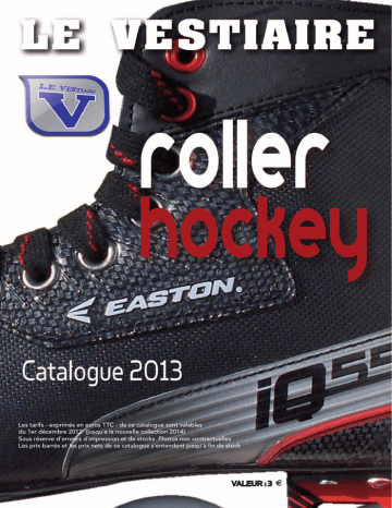 Les tarifs - exprimés en euros TTC - de ce catalogue sont valables du 1er décembre 2012 (jusqu’à la nouvelle collection 2014) Sous réserve d‘erreurs d’impression et de stocks. Photos non contractuelles Les prix barrés et les prix nets de ce catalogue s’entendent jusqu’à fin de stock VALEUR : 3 € Nouveau site internet : www.le-vestiaire.fr Possibilité d’achats directs en ligne 24h/24, 7 j/7 - Site sécurisé Vous y trouverez toutes les nouveautés qui comptent, ainsi que de nombreux articles en promotion ou destockage. 1 service Vente par Correspondance : Par simple appel au 04.50.47.29.35 Renseignez vous sur les articles, leur disponibilité,les prix et les promos en cours. 5 catalogues LE VESTIAIRE annuels : Sur simple demande au 04.50.47.29.35 recevez le catalogue de votre choix parmi 5 disciplines ROLLER/ BASEBALL/PATINAGE/HOCKEY/GARDIEN 7 magasins à votre service en France : Saint Maurice 94 - Meudon 92 - Passy 74 - Amiens 80 - Strasbourg 67 - Blagnac 31 - Grenoble 38 Horaires d’ouverture et localisations exactes à retrouver sur le site internet et au dos de ce catalogue. 6000 références produits en stock : La plus grande gamme de produits de glace et roller sous une même enseigne en France. Modes de réglement Sur le site par carte bancaire en paiement sécurisé. Par correspondance classique, nous acceptons les réglements en espèce, carte bancaire, et contre remboursement (frais 10€). La marchandise reste notre propriété jusqu’à son paiement intégral. Modes d’expédition Nous expédions chaque jour par Colissimo Suivi ou Chronopost dans toute la France métropolitaine. Livraison sous 48h maximum (généralement 24 heures ouvrables). Tarification transport 8,50 € TTC. Service après vente Pour toute demande de SAV, il vous faudra retourner votre article (accompagné de la preuve d’achat) pour contrôle. Après inspection, nous vous informons rapidement de la suite donnée à votre demande. INFO + : Pour tout autre équipement tel que casque, crosse, gants, protections… demandez notre catalogue hockey ou consultez notre site le Vestiaire http://www.le-vestiaire.fr EASTON IQ22 Roues Syndicate Outdoor Skull Dureté 83A Chassis Alu extrudé Roulements ABEC 3 129 € 30 à 37 139 € 38 à 46 Dispo 30 à 46 30/35 : Diam 60/64/64/68mm 36/37 : Diam 68/72/72/76mm 38/46: Diam 72/76/76/80mm EASTON IQ33 Roues Syndicate Pro Indoor Dureté 76A Chassis Alu extrudé Roulements ABEC 5 149 € 36 à 39 169 € 40 à 46 Dispo 36 à 46 36/37 : Diam 68/72/72/76mm 38/46: Diam 72/76/76/80mm 3 http://www.le-vestiaire.fr EASTON IQ44 Roues Syndicate Pro Indoor 72/72/80/80mm - 76A Chassis Alu extrudé Roulements ABEC 7 199 € Dispo 40 à 46 EASTON IQ55 Roues Syndicate Pro Indoor 72/72/80/80mm - 76A Chassis Alu extrudé Semelle carbone Roulements ABEC 9 289 € Dispo 40 à 46 http://www.le-vestiaire.fr 4 EASTON SE12 WHITE Dispo : 41 - 46 - 47 EASTON SE10 BLUE Dispo : 39 - 40 - 41 - 46 - 47 199 € 159,20 € 149 € 119,20 € 269 € 188,30 € EASTON SE16 BLACK Dispo 40 - 47 TORSPO SWEET 21 99 € Roues Torspo 72/76/76/80mm - 82A Chassis Alu Roulements ABEC 5 Forme ergonomique Dispo 6 - 9 - 11 - 12 Stock restreint Prix promo dans la limite des stocks disponibles 5 http://www.le-vestiaire.fr MISSION AXIOM A5 Roues Mission Indoor 76/76/80/80mm - 76A Chassis Alu extrudé 6000 Roulements ABEC 7 Mission Dispo 6 à 12 199 € MISSION INHALER AC5 Roues HL1 76/76/80/80mm - 76A Chassis Alu extrudé 6000 HI-LOW Roulements ABEC 7 Mission 259 € Dispo 6 à 12 399 € MISSION INHALER AC3 Roues RINK RAT HotShot 76/76/80/80mm - 76A Chassis Alu CNC Semelle carbone Roulements ABEC Swiss Dispo 7 à 11,5 http://www.le-vestiaire.fr 6 MISSION FL5 Goalie Roues Mission FL 76A Chassis Alu CNC HI-LOW Roulements ABEC 5 Dispo 6 à 11 Stock limité 359 € 399 € Stock restreint MISSION AXIOM G7 GOALIE Roues Rink Rat Goalie 59/59/59/59mm - 76A Chassis Alu extrudé 6000 Roulements ABEC 5 Mission Dispo 7 - 8 - 10 379 € 303,20 € MISSION AXIOM T8 Roues Rink Rat Hornet Indoor 76/76/80/80mm - 76A Chassis Alu extrudé Roulements ABEC Swiss Semelle carbone 479 € 383,20 € Dispo 8 - 8,5 - 9,5 - 10 - 10,5 MISSION AXIOM T7 Roues Rink Rat Hot Shot Indoor 76/76/80/80mm - 76A Chassis Aluminium 6000 Roulements ABEC Swiss Dispo 8 - 8,5 - 9,5 10 - 10,5 - 11 Prix promo dans la limite des stocks disponibles 7 http://www.le-vestiaire.fr MISSION IDX MISSION BSX Dispo 6 - 7 - 12 Dispo 7 - 10 - 12 165 € 120 € 115,50 € 84 € MISSION CSX MISSION DSX 09 Dispo 7 - 11 - 12 Dispo 7 - 12 235 € 185 € 164,50 € 129,50 € MISSION COMMANDER BK Dispo 7 - 7,5 - 11,5 MISSION DSX 2010 Dispo 7 - 10 - 11 - 12 Action Prix 229 € 183,20 € 479€ 299 € http://www.le-vestiaire.fr 8 Prix promo dans la limite des stocks disponibles MISSION BOSS BLACK Dispo 12 Action Prix MISSION COMMANDER SE Dispo 7,5 - 8,5 - 9,5 - 10,5 - 11,5 599 € 299 € 475 € 380 € CCM V04 Dispo 7 - 10 - 12 229 € 160,30 € 295 € 206,50 € CCM V02 Dispo 7 - 9 - 10 - 11 - 12 159 € 111,30 € CCM V06 Dispo 9 - 10,5 Prix promo dans la limite des stocks disponibles 9 http://www.le-vestiaire.fr BAUER XR1 Roues Bauer 76/76/80/80mm 129 € 1à5 139 € 6 à 10 219 € 3à5 249 € 6 à 11 BAUER XR3 Roues Bauer Indoor 76/76/80/80mm - 76A (adultes) 649 € BAUER APXR Dispo 6 à 12 Stock limité http://www.le-vestiaire.fr 10 BAUER XR Premier Roues Revision Variant 76/76/80/80mm - 74A Thermoformable Chassis Magnesium Semelle carbone Roulements ABEC Swiss 6 à 12 599 € 235 € 149 € BAUER RX 20 Dispo 7 - 8 - 9 - 11 599 € 399 € Action Prix BAUER RX 60 Dispo 7 - 7,5 - 9 - 9,5 Prix promo dans la limite des stocks disponibles 11 http://www.le-vestiaire.fr REEBOK 1K Dispo 8 à 12 199 € 199 € 139,30 € 159,20 € REEBOK 2K Roues Reebok Labeda 72/76/76/80mm Chassis Alu 2 pièces Roulements ABEC 5 Dispo 7 - 8 - 10 175 € 122,50 € REEBOK 2K RED Dispo 7 - 10 - 11 - 12 REEBOK 4K Dispo 9 - 10 269 € 188,30 € http://www.le-vestia