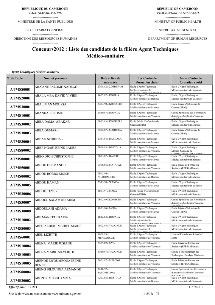 REPUBLIQUE DU CAMEROUN PAIX-TRAVAIL-PATRIE ----------------------MINISTERE DE LA SANTE PUBLIQUE ----------------------SECRETARIAT GENERAL ----------------------DIRECTION DES RESSOURCES HUMAINES ----------------------- REPUBLIC OF CAMEROON PEACE-WORK-FATHERLAND ----------------------MINISTRY OF PUBLIC HEALTH ----------------------SECRETARIAT GENERAL ----------------------DEPARTMENT OF HUMAN RESOURCES ----------------------- Concours2012 : Liste des candidats de la filière Agent Techniques Médico-sanitaire Agent Techniques Médico-sanitaire: N° de Table ATMS80001 ATMS20001 ATMS30001 ATMS10001 ATMS30002 ATMS30003 ATMS30004 ATMS80002 ATMS00001 ATMS50001 ATMS00002 ATMS30005 ATMS30006 ATMS30007 ATMS30008 ATMS10002 ATMS80003 ATMS60001 ATMS10004 ATMS10003 ATMS10005 ATMS80004 ATMS20002 Nomset prénoms Date et lieu de naissance ABA'ANE SALOME NADEGE 27/08/82 à ZOEBEFAM ABALA MBA DAVID VIVIEN 14/07/87 à KOMPIA ABALIMAN MOUSSA 1er Centre de formation choisi 2ème Centre de formation choisi Ecole d'Agent Technique Médico-Sanitaire de NGOVAYANG LOLODORF Ecole d'Agent Techniques Médico-sanitaire de Bertoua Ecole d'Agent Techniques Médico-sanitaire de Yaoundé 27/04/90 à KOUSSERI Ecole d'Agent Techniques Médico-sanitaire de Maroua Ecole Privée d'Infirmiers de Garoua (EPIG) ABANDA JEROME 29/10/87 à DOUALA Ecole d'Agent Techniques Médico-sanitaire de Yaoundé ABBA DAMA ABAKAR 08/03/83 à KOUSSERI Ecole Privée d'Infirmiers de Garoua (EPIG) Centre Spécialisé des Techniques d'Analyses Médicales Yaoundé (CESTAM) Ecole d'Agent Techniques Médico-sanitaire de Maroua ABBA OUMAR - 06/02/87 à MARPOUA Ecole d'Agent Techniques Médico-sanitaire de Maroua Ecole Privée d'Infirmiers de Garoua (EPIG) ABBA'S NDJIDDA - 27/11/88 à DARGALA Ecole d'Agent Techniques Médico-sanitaire de Maroua Ecole d'Agent Techniques Médico-sanitaire de Bertoua ABBE NGARI REINE LAURE 21/09/83 à BERTOUA Ecole d'Agent Techniques Médico-sanitaire de Yaoundé ABBO DJOH CHRISTOPHE 01/01/87 à DAUFILI Ecole d'Agent Techniques Médico-sanitaire de Maroua Ecole d'Agent Technique Médico-Sanitaire de NGOVAYANG LOLODORF Ecole d'Agent Techniques Médico-sanitaire de Bertoua ABDOU OUSMANOU 09/08/86 à MATAFAL Ecole d'Agent Techniques Médico-sanitaire de Yaoundé Ecole Privée de Formation Sanitaire (EPFSA) Douala ABDOU BOBBO MOISE 03/05/86 à NGAOUNDERE Ecole d'Agent Techniques Médico-sanitaire de Bertoua Ecole d'Agent Techniques Médico-sanitaire de Maroua ABDOU HAMAN - 25/11/90 à WAMPA Ecole d'Agent Techniques Médico-sanitaire de Maroua Ecole d'Agent Techniques Médico-sanitaire de Yaoundé ABDOU TEYE - 11/07/91 à MADA Ecole Privée d'Infirmiers de Garoua (EPIG) Ecole d'Agent Techniques Médico-sanitaire de Bertoua ABDOUL SALAM IBRAHIM 08/03/89 à KONTCHA Ecole d'Agent Techniques Médico-sanitaire de Yaoundé ABDOULAHI ADAMA - 19/05/90 à MORA Ecole d'Agent Techniques Médico-sanitaire de Maroua Centre Spécialisé des Techniques d'Analyses Médicales Yaoundé (CESTAM) Ecole Privée d'Infirmiers de Garoua (EPIG) ABE MANETTE RAISA 11/12/84 à DOUALA Ecole d'Agent Techniques Médico-sanitaire de Yaoundé ABEH ALBERT MICHEL MARIE 01/02/84 à YAOUNDE ABEL LIZETTE 18/09/93 à MENDANKWE Ecole d'Agent Technique Médico-Sanitaire de NGOVAYANG LOLODORF Ecole d'Agent Technique Médico-Sanitaire de NGOVAYANG LOLODORF Ecole d'Agent Techniques Médico-sanitaire de Yaoundé ABENA MARIE JOSIANE 28/09/89 à SA'A Ecole d'Agent Techniques Médico-sanitaire de Yaoundé Ecole Privée de Formation Sanitaire (EPFSA) Douala ABENA MARIE SILVERE B. 17/10/87 à YAOUNDE Ecole d'Agent Techniques Médico-sanitaire de Yaoundé ABENDE EWOUMBOUA IRENE DENISE ABENG BILOUNGA ARMANDE 24/05/87 à MELONG Ecole d'Agent Techniques Médico-sanitaire de Yaoundé Centre d'Enseignement des Techniques d'analyse Médicales (centre pasteur) Ecole Privée de Formation Sanitaire (EPFSA) Douala 30/10/92 à SANGMELIMA Ecole d'Agent Techniques Médico-sanitaire de Yaoundé ABEZOK MPOUL EMMA 02/03/88 à BERTOUA Ecole d'Agent Techniques Médico-sanitaire de Bertoua Effectif total : 2 223 Site Web: www.minsante.cm ou www.minsante.gov.cm Ecole d'Agent Techniques Médico-sanitaire de Yaoundé Ecole d'Agent Techniques Médico-sanitaire de Yaoundé Hamani Foundation School of Santa Centre Spécialisé des Techniques d'Analyses Médicales Yaoundé (CESTAM) Ecole d'Agent Techniques Médico-sanitaire de Yaoundé 11/07/2012 1 SUR 77 Agent Techniques Médico-sanitaire: N° de Table ATMS50002 ATMS20003 ATMS20004 ATMS10006 ATMS10007 ATMS10008 ATMS50003 ATMS10009 ATMS10010 ATMS30009 ATMS90001 ATMS30010 ATMS60002 ATMS10011 ATMS10012 ATMS30011 ATMS30012 ATMS30013 ATMS50004 ATMS40001 ATMS50006 ATMS50005 ATMS50007 ATMS30014 ATMS10013 ATMS30015 ATMS20005 ATMS10014 ATMS10015 Nomset prénoms Date et lieu de naissance 1er Centre de formation choisi 2ème Centre de formation choisi ABIBA CAMEROUN - 19/11/84 à YAOUNDE Ecole Privée d'Infirmiers de Garoua (EPIG) Ecole d'Agent Techniques Médico-sanitaire de Maroua ABIBA MBIRVI MBOLE LAFLAMME 25/12/90 à BERTOUA Ecole d'Agent Techniques Médico-sanitaire de Bertoua Ecole d'Agent Techniques Médico-sanitaire de Yaoundé ABIELEBORD MARCIEN STEVE 03/12/94 à LONGDJAP Ecole d'Agent Techniques Médico-sanitaire de Yaoundé Ecole d'Agent Techniques Médico-sanitaire de Bertoua ABIYANGOUNA DIANE MARTIALE 17/02/90 à DOUALA Ecole d'Agent Techniques Médico-sanitaire de Yaoundé ABOMO ROSE 31/01/89 à YAOUNDE Ecole d'Agent Techniques Médico-sanitaire de Yaoundé Ecole d'Agent Technique Médico-Sanitaire de NGOVAYANG LOLODORF Ecole de formation du personnel médicale (LA ROSIERE) ABOMO NLOM RAMELINE 19/07/92 à ENONGAL Ecole d'Agent Techniques Médico-sanitaire de Yaoundé ABOUBAKAR AMOA SIDDIK - 16/12/87 à POLI Ecole d'Agent Technique Médico-Sanitaire de NGOVAYANG LOLODORF Ecole d'Agent Techniques Médico-sanitaire de Maroua ABOUDI NGAZOA MATHIEU PATRICK ABOULA ZINGA BERNADETTE JOELLE PASCALE ABRAHAM PARDAPA PIERRE 12/02/92 à YAOUNDE Ecole d'Agent Techn