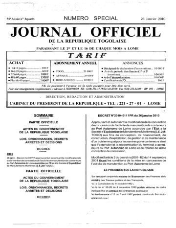 NUMERO SPECIAL 55eAnnAnnCe no 3quarto 26 Janvier 2010 JOURNAL OFFICIEL DE LA REPUBLIQUE TOGOLAISE PARAISSANT LE 1" ET LE 16 DE CHAQUE MOIS A LOME ACHAT ANNONCES . 1 i3 12 pages..................... 200 F 16 ii 28 pages .....................600 F 32 A 44 pages,................... 1000F 48A60pages ................... l5OOF Plus de 60 pages ............;2 000 F Recepissk de declaration d'associations .. 10 000 F Avis de perte de titxe foncier (la et 2" insertions) ............................................... 10000 F Avis d'~atricu1ation................................. 10 000 F Certification du JO ........................................ 500 F TOGO.............................20 000 F AFRIQUE........................28 000 F HORS AFRIQUE ...........40 000 F - - - - NB. Le paiement d l'avance est la seule garantie pour 6tre bien servi. Pour tout meignement mnpbnentaire, s'adwser d 1'EDmYXO Td : (228) 221-37-1&221-61-07/08 Fax (228) 222-14-89 - BP 891 - LOME . DIRECTION, REDACTION ET ADMINISTRATION 1 CABINET DU PRESIDENT DE LA REPUBLIQUE - TEL :221 - 27 - 01 - LOME 1) DECRE'T N02010- 011 1PR du 26 janvier 2010 AC'TES DU GOUVERNEMENT DE LA REPUBLIQUE TOGOLAISE - LOIS, ORDONNANCES, DECRETS ARRETES ET DECISIONS DECREE Approuvant et autorisant la modification de la convention de concession de I'activite de manutention de conteneurs au Port Autonome de Lome accordee par I'Etat a la Societe d'Exploitationde Manutentions Maritimes (S.E.2MTOGO) aux fins de conception, de financement, de construction, d'exploitation, de gestion et de maintenance d'un troisieme quai pour les navires porte conteneurs ainsi que I'extension et la modernisation du terminal a conteneurs au Port Autonome de Lome et de refonte de ladite convention de concession, 26 janv. - Decret noOll/PR approuvant et autorisant la modification de la convention de concession de I'activite de manutention de conteneurs au PortAutonomede Lome accordee par I'Etata la Societe dTExploitation de Manutentions Maritimes (S.E.2M-TOGO). Modifiant I'article 3 du decret no2001-162 du 14 septembre 2001 fixant les conditions de la mise en concession de I'activite de manutention au Port Autonome de Lome PARTIE OFFlClEbbE LE PRESIDENTDE LA REPUBLIQUE ACTES DU GOUVERNEMENT DE LA REPUWLIQUE TOGOLAISE Sur le rapport conjoint du ministre de I'Economie et des Finances et du LOIS, ORDONN/CNCES, BECRETS ARRETES ET DECISIONS Vu la loi n o 90-26 du 4 decembre 1990 portant reforme du cadre ministre des Travaux publics et des Transports, Vu l a Constitution du 14 octobre 1992 ; institutionnel et juridique des entreprises publiques ; 0 Vu I'ordonnance n 12 du 7 avril 1967 portant creation du Port Auto- DECREE nome de Lome ; - 2 -. I JOURNAL OFFICIEL DE LA REPUBLIQUE TOGOLAISE - r 26 Janvier 2010 - t Autonome de ~ o h pendant e la d u r b de la convention de concession qui hi a ete ac'cordee sur le perimetfe des emprises du domaineportuaire du Port Autonome de Lome tel que delimite sur leplan joint en annexe au pr6sent d&ret- o Vu I'ordonnance n 94-002 du 10 juin 1994 portant desengagement de I'Etat et d'autres personnes morales de droit public des entreprises ; Vu le decret n o 91-197 du 16 soot 1991 pris en application de la loi no 90-26 du 4 decembre 1990 susvisee ; Vu le d k r e t no91-0271PMRT du 02 octobre 1991 portant transformation du Port Autonome de Lome en societe d'Etat ; Art. 3 : Le ministre de I'Economie et des Finances et le ministredes Travaux publics et des Transports sont autorim ses 6 signer I'avenant 5 la oonvention de concession de I'activite de manutention de conteneurs au Port ~ u t o f l ~ ~ de Lome accordee par I'Etat 5 la Societe d'Exploitation de Manutentions Maritimes (S.E.2M-TOGO) le 29 aoOt 2Oo1 dont I'objet est specifie a I'article 1 ci--dessus. o Vu le decret n 94-038 du 10 juin 1994 pris en application de I'ordonnance no 94-002 du 10 juin 1994 susvisee ; Vu le decret n o 2001-162lPR du 14 septembre 2001 fixant les conditions de la mise en concession de I'activite de manutention au port Autonome de Lome ; Vu le decret no 2008-050lPR du 7 mai 2008 relatif aux attributions des Art. 4 : Aux fins d'application des dispositions de l'artide du present decret, I'article 3 du decret no2001-162lPR d" 14 septembre 2001 fixant les conditions de la mise en concession de I'activite de manutention au Port Autonome de Lome est remplace par les dispositions suivantes ministres d'Etat et ministres ; Vu le decret no 2008-121lPR du 8 septembre 2008 portant nomination du Premier ministre ; Vu le decret no 2008-1221PR du 15 septembre 2008 portant composition du gouvernernent, ensemble les textes qui I'ont modifie ; Vu la convention de concession de I'activite de manutention de conte- ((La concession pour I'activite de manutention de conteneurs au Port Autonome de Lome est accordee 8 exclusif a un unique operateur sur le perimetre des e?prises du domaine portuaire du Port Autonome de L o f l e tel que delimite sur le plan joint en annexe au present d8cret. neurs au Port Autonome de Lome conclue le 29 aoirt 2001 entre I'Etat et la Societe d'Exploitationde Manutentions Maritimes (S.E.2M-TOGO), filiale de la societe de droit espagnol Participaciones lbero Internationales S.A.U. elle-mbrne contr6lee par le Groupe Bollore ; Vu le protocole d'accord en date du 17 novembre 2004 sur la cons- La concession pour I'activite de manutention des marchandises diverses est accordee dans un cadre concurfentiel sans monopole. Le nombre d'operateurs est limite a deux (2) pour la manutention de marchandises diverses a l l Autonome de Lome, pour une periode de dix (10) ans->> truction I'exploitation et I'entretien des infrastructures pour la r6ception des navires porte conteneurs au Port de Lome entre la Republique Togolaise et la Societe d'lnvestissementdu Terminal Conteneurs (SITC TOGO), filiale de la societe de droit espagnol Participaciones lbero Internationales S.A.U, elle-rni5me contr6lee par le Groupe Bollore ; Vu I'avenant n 0 l en date du 10 septembre 2009 de la conventi
