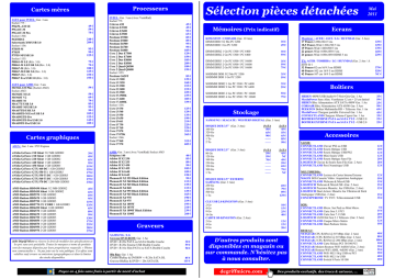 Processeurs Cartes mères ASUS pour INTEL: Gar. 3 ans Socket 775 : P5KPL-AM SE P5G41T-M P5G41T-M Pro Socket 1366: P6X58D-E Sabertooth X58/USB 3.0 Socket 1156: P7H55-M P7H55 P7P55-M/USB 3.0 Socket 1155: P8H61-M LE (Rév. 3.0) P8H61-M LE/USB 3.0 (Rév. 3.0) P8H67-M (Rév. 3.0) P8H67-M/USB 3.0 (Rév. 3.0) P8H67 (Rév. 3.0) P8H67 Evo/USB 3.0 (Rév. 3.0) 49 € 59 € 75 € 240 € 209 € 95 € 99 € 125 € 75 € 79 € 100 € 125 € 159 € 195 € ASUS pour AMD: Gar. 3 ans M2N68-AM Plus (Socket AM2) Socket AM3: M4N68T-M LE M4N68T V2 M4A88T-M M4A77T/USB 3.0 M4A88T-M/USB 3.0 M4A87TD/USB 3.0 M4A88TD-M Evo/USB 3.0 M4A89GTD Pro M4A89GTD Pro/USB 3.0 M4A89TD Pro/USB 3.0 59 € 59 € 69 € 79 € 85 € 95 € 99 € 105 € 125 € 145 € 189 € Cartes graphiques ASUS : Gar. 3 ans / PCI Express nVidia GeForce 210 Silent 512 MB GDDR2 nVidia GeForce 210 Silent 1 GB GDDR2 nVidia GeForce 220 Silent 1 GB GDDR2 nVidia GeForce 440 Silent 1 GB GDDR3 nVidia GeForce 450 Silent 1 GB GDDR5 nVidia GeForce GTX 460 DC 1 GB GDDR5 nVidia GeForce GTX 550 Ti 1 GB GDDR5 nVidia GeForce GTX 550 Ti DC 1 GB GDDR5 nVidia GeForce GTX 560 Ti DC 1 GB GDDR5 nVidia GeForce GTX 570 DC 1280 MB GDDR5 39 € 49 € 65 € 95 € 119 € 159 € 179 € 205 € 275 € 370 € AMD Radeon HD5450 Silent 512 MB GDDR2 AMD Radeon HD5450 Silent 1 GB GDDR2 AMD Radeon HD5570 1 GB GDDR2 AMD Radeon HD5670 1 GB GDDR5 AMD Radeon HD5750 1 GB GDDR5 AMD Radeon HD5770 CU CORE 1 GB GDDR5 AMD Radeon HD6450 Silent 1 GB GDDR3 AMD Radeon HD6570 1 GB GDDR3 AMD Radeon HD6670 1 GB GDDR5 AMD Radeon HD6750 1 GB GDDR5 AMD Radeon HD6850 1 GB GDDR5 AMD Radeon HD6870 1 GB GDDR5 AMD Radeon HD6950 2 GB GDDR5 AMD Radeon HD6970 2 GB GDDR5 45 € 65 € 69 € 95 € 119 € 135 € 65 € 89 € 99 € 130 € 175 € 235 € 285 € 379 € @lbi Dégriff Micro se réserve le droit de modifier des spécifications et les prix sans avis préalable. Toutes les marques et noms de produits sont des marques déposées par leurs propriétaires respectifs. « Photos non contractuelles ». Ne pas jeter sur la voie publique. Ces offres sont valables sauf erreurs ou omissions typographiques et dans la limites des stocks disponibles. INTEL: Gar. 3 ans (Avec VentiRad) Socket 775: Celeron 430 Celeron E3300 Celeron E3400 Celeron E3500 Pentium E5500 Pentium E5800 Pentium E6500 Pentium E6700 Pentium E6800 Core 2 Duo E7500 Core 2 Duo E7600 Core 2 Duo E8400 Core 2 Duo E8500 Core 2 Quad Q8300 Core 2 Quad Q8400 Socket 1155: Pentium G620T Core i3 2100 Core i3 2120 Core i5 2300 Core i5 2400 Core i5 2500 Core i5 2500K Core i7 2600 Core i7 2600K Socket 1156: Core i3 530 Core i3 540 Core i3 550 Core i5 650 Core i5 661 Core i5 750 Core i5 760 Core i7 870 Core i7 875K Socket 1366: Core i7 960 Core i7 970 AMD: Gar. 3 ans (Avec VentiRad) Socket AM3 Sempron 140 Athlon II X2 250 Athlon II X2 255 Athlon II X3 450 Athlon II X3 455 Athlon II X4 640 Athlon II X4 645 Phenom II X2 555 Black Edition Phenom II X2 560 Black Edition Phenom II X2 565 Black Edition Phenom II X4 840 Phenom II X4 955 Black Edition Phenom II X4 965 Black Edition Phenom II X4 970 Phenom II X4 975 Phenom II X6 1055T Phenom II X6 1075T Phenom II X6 1090T Black Edition Phenom II X6 1100T Sélection pièces détachées 45 € 49 € 55 € 65 € 85 € 89 € 95 € 99 € 105 € 129 € 159 € 185 € 209 € 189 € 199 € 85 € 129 € 160 € 215 € 219 € 229 € 235 € 305 € 339 € 125 € 129 € 135 € 199 € 219 € 225 € 229 € 319 € 365 € 315 € 605 € 40 € 85 € 89 € 99 € 105 € 109 € 120 € 99 € 115 € 135 € 115 € 129 € 165 € 190 € 219 € 195 € 210 € 239 € 260 € Graveurs SAMSUNG / LG Graveur DVD-ROM: Gar. 1 An DVD+/-R 20x PATA ou SATA Double Couche DVD+/-R 20x Externe USB Double Couche DVD+/-R 16x Slim PATA ou SATA Double Couche Blu Ray: Gar. 1 An Combo BluRay & DVDRW +/-R 20x SATA DL Graveur BluRay & DVD+/- 20x SATA DL Payez en 4 fois sans frais à partir de 200€ d’achat 30 € 59 € 50 € 85 € 115 € Mémoires (Prix indicatif) Ecrans KINGSTON / CORSAIR (Gar. 10 Ans) DIMM DDR 512 Mo PC 3200 DIMM DDR 1 Go PC 3200 35 € 49 € DIMM DDR2 1 Go PC 5300 / PC 6400 DIMM DDR2 2 Go PC 5300 / PC 6400 35 € 59 € DIMM DDR3 1 Go PC 8500 / PC 10600 DIMM DDR3 2 Go PC 8500 / PC 10600 DIMM DDR3 2 Go PC 8500 / PC 10600 35 € 59 € 79 € SODIMM DDR 512 Mo PC 3200 SODIMM DDR 1 Go PC 3200 35 € 59 € SODIMM DDR2 1 Go PC 5300 / PC 6400 SODIMM DDR2 2 Go PC 5300 / PC 6400 35 € 59 € SODIMM DDR3 2 Go PC 8500 / PC 10600 SODIMM DDR3 4 Go PC 8500 / PC 10600 59 € 79 € Stockage SAMSUNG / SEAGATE / WESTERN DIGITAL (Gar. 3 Ans) DISQUE DUR 3.5’’ (Gar. 3 Ans) 160 Go 320 Go 500 Go 1 To 2 To PATA 50 € 65 € 90 € —— —— SATA 45 € 55 € 65 € 85 € 99 € DISQUE DUR 2.5’’ (Gar. 3 Ans) 80 Go 120 Go 160 Go 250 Go 320 Go 500 Go 1 To PATA 59 € 59 € 70 € —— —— —— —— SATA 45 € NC 49 € 59 € 69 € 79 € NC DISQUE DUR 2.5’’ EXTERNE SAMSUNG (Gar. 3 Ans) 250 Go 320 Go 500 Go 1 To CLE USB 2.0 KINGSTON (Gar. 5 Ans) 2 Go 4 Go 8 Go 16 Go CARTE SD KINGSTON (Gar. 2 Ans) 2 Go 4 Go 8 Go 69 € 79 € 89 € 129 € 10 € 15 € 25 € 40 € 12 € 15 € 20 € D’autres produits sont disponibles en magasin ou sur commande. N’hésitez pas à nous consulter. degriffmicro.com Mai 2011 Moniteur : ACER / ASUS / LG / HUYNDAI (Gar. 3 Ans) 17 Pouces 1280x1024 5 ms 18,5 Pouces Wide 1366x768 5 ms 19 Pouces Wide 1440x900 5 ms 22 pouces Wide 1680x1050 5 ms 24 pouces Wide 1680x1050 HDMI 5 ms 129 € 129 € 139 € 169 € 229 € TV: ACER / TOSHIBA / LG / HUYNDAI (Gar. 2 Ans / A partir de ) 32 Pouces-82 cm 16/9 5 ms HDMI 40 Pouces-102 cm 16/9 5 ms HDMI 42 Pouces-107 cm 16/9 5 ms HDMI 379 € 529 € NC € Boîtiers HEDEN 480W/USB/Audio/4+7/Noir-Gris Gar. 1 An MaxInPower Sans Alim. Ventilateur 12 cm + 25 cm latéral HEDEN Bloc Alimentation ATX SATA 480W Gar. 1 An CORSAIR Bloc Alimentation ATX 650W Gar. 5 Ans PEEKTON Boîtier Multimé