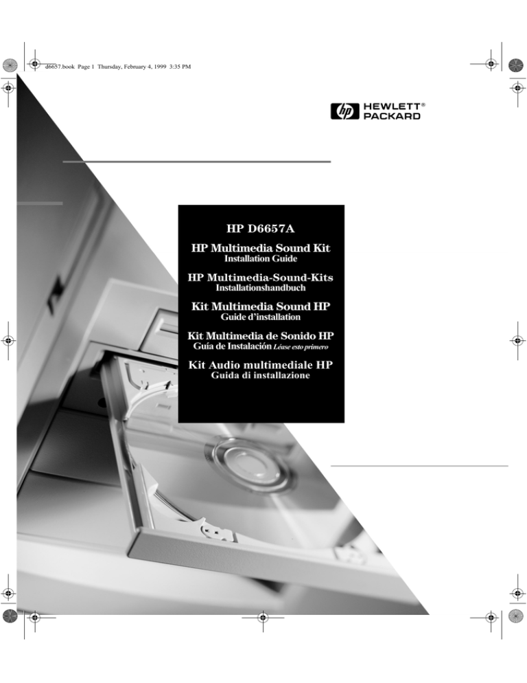 d6657.book Page 1 Thursday, February 4, 1999 3:35 PM HP D6657A HP Multimedia Sound Kit Installation Guide HP Multimedia-Sound-Kits Installationshandbuch Kit Multimedia Sound HP Guide d’installation Kit Multimedia de Sonido HP Guía de Instalación Léase esto primero Kit Audio multimediale HP Guida di installazione d6657.book Page 2 Thursday, February 4, 1999 3:35 PM Notice The information contained in this document is subject to change without notice. Hewlett-Packard makes no warranty of any kind with regard to this material, including, but not limited to, the implied warranties of merchantability and fitness for a particular purpose. Hewlett-Packard shall not be liable for errors contained herein or for incidental or consequential damages in connection with the furnishing, performance, or use of this material. Hewlett-Packard assumes no responsibility for the use or reliability of its hardware or software on equipment that is not furnished by Hewlett-Packard or equipment for which it is not intended. This document contains proprietary information that is protected by copyright. All rights are reserved. No part of this document may be photocopied, reproduced, or translated to another language without the prior written consent of Hewlett-Packard Company. Hinweis Inhaltliche Änderungen vorbehalten. Hewlett-Packard übernimmt keine Garantie welcher Art auch immer für diese Ausrüstung, einschließlich der (doch nicht begrenzt auf die) Qualitätsgarantie und die Garantie bezüglich Eignung für einen bestimmten Zweck. HewlettPackard haftet nicht für in dieser Dokumentation enthaltene Fehler oder für unbeabsichtigte oder indirekte Schäden in Verbindung mit der Lieferung, der Leistung oder der Benutzung der Ausrüstung. Hewlett-Packard übernimmt keine Verantwortung für die Verwendung und Zuverlässigkeit seiner Hardware und Software auf Geräten von Fremdherstellern oder auf Geräten, die hierfür nicht geeignet sind. Hewlett-Packard übernimmt keine Haftung fur den Betrieb oder die Zuverlässigkeit seiner Software, wenn diese auf Hardware benutzt wird, die nicht von Hewlett-Packard geliefert wurde. Dieses Dokument enthalt proprietäre Informationen, die durch das Copyright geschützt sind. Alle Rechte vorbehalten. Dieses Dokument darf ohne vorherige schriftliche Genehmigung der Hewlett-Packard Company weder ganz noch teilweise fotokopiert, reproduziert oder übersetzt werden. Avertissement Les informations contenues dans ce document peuvent être modifiées sans préavis. Hewlett-Packard ne donne aucune garantie de quelque sorte que ce soit concernant, sans que ce soit limitatif, les garanties implicites de qualité commerciale de ce matériel, ou la bonne adaptation de celui-ci à un usage particulier. Hewlett-Packard n’est pas responsable des erreurs pouvant apparaître dans ce manuel et n’est pas non plus responsable des dommages directs ou indirects résultant de l’équipement, des performances et de l’utilisation de ce matériel. Hewlett-Packard ne garantit ni la fiabilité ni les conséquences de l’utilisation de son matériel ou de ses logiciels lorsqu’ils ne sont pas exploités sur des équipements qui ne sont pas de marque Hewlett-Packard ou sur des équipements qui ne leur sont pas destinés. Hewlett-Packard ne saurait être tenu pour responsable de l’utilisation et de la fiabilité de son logiciel sur des matériels non fournis par Hewlett-Packard. Les informations contenues dans ce document sont originales et protégées par copyright. Tous droits réservés. L’acheteur s’interdit en conséquence de les photocopier, de les reproduire ou de les traduire dans toute autre langue, sauf accord préalable et écrit de Hewlett-Packard. Aviso La información contenida en este documento está sujeta a cambios sin previo aviso. Hewlett-Packard no ofrece ningún tipo de garantía con respecto a este material, incluyendo, pero sin limitarse a, las garantías implícitas de comerciabilidad e idoneidad para un fin determinado. Hewlett-Packard no asume responsabilidad alguna por los posibles errores contenidos o por los daños casuales o emergentes relacionados con el suministro, funcionamiento o uso de este material.Hewlett-Packard no asume responsabilidad alguna por el uso y fiabilidad de su hardware o software en equipos que no hayan sido creados por HP o equipos para los cuales no se haya probado. Hewlett-Packard no asume responsabilidad alguna por el uso o fiabilidad de su software en equipos que no hayan sido fabricados por Hewlett-Packard. Este documento contiene información patentada, protegida por las leyes del copyright. Reservados todos los derechos. Ninguna parte de este documento puede ser fotocopiada, reproducida o traducida a otro idioma sin la autorización previa y por escrito de Hewlett-Packard Company. Avviso Le informazioni contenute in questo documento sono soggette a cambiamento senza preavviso. Hewlett-Packard non rilascia garanzie di alcun tipo riguardo a questo materiale, comprese le garanzie implicite di commerciabilità e di idoneità per uno scopo particolare. Hewlett-Packard non sarà ritenuta responsabile per errori contenuti in questo documento, né per danni accidentali o conseguenti alla fornitura, alle prestazioni o all’uso di questo materiale. Hewlett-Packard non sarà ritenuta responsabile dell’uso o dell’affidabilità del suo hardware o software utilizzati su apparecchiature di altra marca o non esplicitamente indicate come adatte.Hewlett-Packard non si assume alcuna responsabilità riguardo all’uso o all’affidabilità del proprio software su apparecchiature di altri produttori. Questo documento contiene informazioni di proprietà protette da copyright. Tutti i diritti sono riservati. Nessuna parte di questo documento può essere fotocopiata, riprodotta o tradotta in un’altra lingua senza un precedente consenso scritto di Hewlett-Packard Company. Hewlett-Packard France 38053 Grenoble Cedex 9 France© 1999 Hewlett-Packa