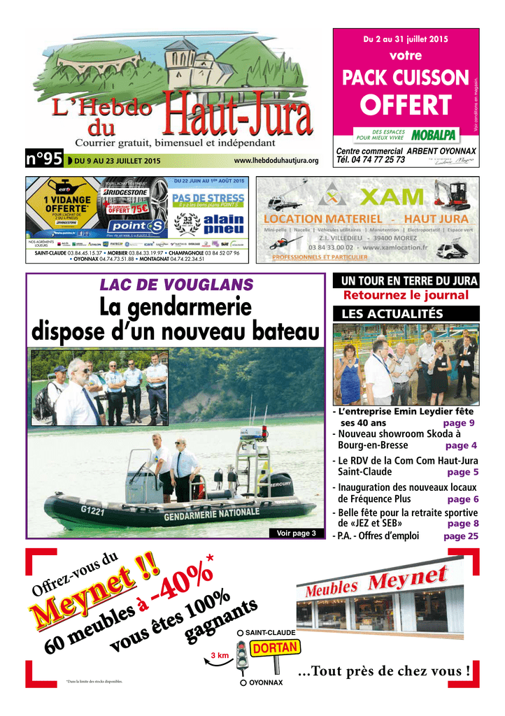 Du 2 au 31 juillet 2015 pack cuisson offert n°95 www.lhebdoduhautjura.org DU 9 AU 23 JUILLET 2015 Voir conditions en magasin. votre Centre commercial ARBENT OYONNAX Tél. 04 74 77 25 73 nos agréments loueurs SAINT-CLAUDE 03.84.45.15.37 • MORBIER 03.84.33.19.97 • CHAMPAGNOLE 03 84 52 07 96 • OYONNAX 04.74.73.51.88 • MONTAGNAT 04.74.22.34.51 LAC DE VOUGLANS La gendarmerie dispose d’un nouveau bateau UN TOUR EN TERRE DU JURA Retournez le journal LES ACTUALITÉS - L’entreprise Emin Leydier fête page 9 ses 40 ans Voir page 3 * ! ! % t 0 e 4 n % y 0 à e es 10 nts - Nouveau showroom Skoda à page 4 Bourg-en-Bresse - Le RDV de la Com Com Haut-Jura page 5 Saint-Claude - Inauguration des nouveaux locaux page 6 de Fréquence Plus - Belle fête pour la retraite sportive de «JEZ et SEB» page 8 - P.A. - Offres d’emploi page 25 O u d s u o v ze r ff M meubl 60 u o v s gna e t s ê ga *Dans la limite des stocks disponibles. 3 km SAINT-CLAUDE DOrTAN OYONNAX ...Tout près de chez vous ! 2 ACTUALITÉS L’Hebdo du Haut-Jura DU 9 AU 23 JUILLET 2015 Le commandant Philippe Bondi, Edito Les feux d’artifice… dans le feu de l’actualité Le château de Versailles, rappelons-nous notre histoire, château réalisé sous Louis XIV, la folie des grandeurs, alors que pendant ce temps les paysans dans les campagnes étaient dans la misère. Cette année pour les 300 ans un feu d’artifice monumental a été tiré dans les jardins du château. Une gabgie d’argent quand on sait que des communes en France, au Deschaux par exemple, ont décidé de mutualiser les feux d’artifice avec d’autres communes en vue de faire des économies, voir de supprimer ces feux, du fait de la baisse de dotation de l’état qui les obligent à revoir considérablement leur budget. Etonnant non ou plutôt … détonnant ! Dominique Piazzolla Directeur bénévole chef de l’Escadron départemental de la sécurité routière quitte le Jura Mardi 23 juin avait lieu au groupement de gendarmerie départemental du Jura à Lons-le-Saunier une réception à l’occasion du départ du commandant Philippe Bondi, chef de l’Escadron départemental de la sécurité routière du Jura (E.D.S.R.). En présence de M. le préfet du Jura, Jacques Quastana, de Mme la présidente du T.G.I. , Mme le substitut représentant le procureur, M. le directeur départemental de la sécurité publique, M. le commandant du S.D.I.S. , les chefs de services des différentes administrations, MM. les chefs de district d’A.P.R.R., officiers, sous-officiers et gendarmes, personnels civils de la gendarmerie et amis, le colonel Vincent Lamballe, 20 . 24 Le commandant Philippe Bondi, entouré de son épouse et ses enfants, M. Jacques Quastana, préfet du Jura, le colonel Vincent Lamballe, commandant du groupement de gendarmerie du Jura et le Major Gérald Michaud, commandant en second de l’EDSR. *Cotisations mensuelles 2015 commandant du Groupement de Gendarmerie du Jura, retraçait la carrière du commandant Philippe Bondi. «C’est un départ un peu particulier qui nous rassemble ici concernant le C.F.N. Bondi. S’il s’agit d’un départ après 4 ans de présence, ici dans le Jura, je dirais que cela marque plus encore la fin surtout de 8 années d’E.D.S.R., de 8 années de commandement de ce niveau départemental, dans ce domaine de spécialité. La fin d’un commandement de 2e niveau, c’est aussi pour un officier de gendarmerie, un tournant de carrière toujours important». En poste de commandant de l’E.D.S.R. de la Manche entre 2007 et 2011, Philippe Bondi a pris le commandement de l’E.D.S.R. du Jura le 1er août 2011. «Votre carrière, quand on l’observe par le détail impressionne déjà par la multitude de compétences et d’expériences dont elle recèle depuis votre intégration à 25 ans de l’école de sous-officier de Chaumont». Le commandant Bondi a acquis jusqu’à aujourd’hui des qualifications et des compétences dans différentes formations initiales et formations motocycliste. Jeune sous-officier, il eut l’expérience de la Corse, de la Polynésie Française, de SaintPierre et Miquelon, de la Martinique et de la Guadeloupe. Lors de son parcours, des lettres de félicitations ou de témoignages de satisfaction lui ont conduit à recevoir la Médaille de la Défense nationale échelon Or dès 2008 et en 2014, il est fait chevalier dans l’Ordre national du Mérite. Le commandant Philippe Bondi est un passionné du monde polaire et tout au long de son discours, il a fait un parallèle entre un musher qui conduit un attelage et sa mission à la tête de l’E.D.S.R. du Jura. «Si j’ai été un musher pendant ces 4 années à la tête de l’E.D.S.R., je ne l’ai été que pendant la moitié du temps, j’avais mon autre binôme de «mush», je veux parler du Major Michaud, de Gérald, mon fidèle adjoint, mon double sans qui jamais je n’aurais réussi aussi bien cette magnifique aventure». Le commandant Bondi rendait hommage à ses militaires de l’E.D.S.R., un personnel dévoué, conscencieux, compétent et professionnel, et profondément attaché à la lutte contre l’insécurité routière. Il terminait son discours et ses remerciements par une citation d’un écrivain qu’il admire beaucoup, Paul Emile Victor, figure emblématique du département du Jura. Elle peut s’appliquer à beaucoup de choses, aux raids, au dépassement de soi, au commandement, à la lutte contre l’insécurité routière mais aussi tout simplement à une philosophie de la vie. «La seule chose promise d’avance à l’échec, est celle que l’on ne tente pas» Paul Emile Victor. M. Quastana, préfet du Jura, félicitait le commandant Bondi pour les différentes actions menées. «Vous multipliez les contrôles sur la route, vous avez renforcé la communication, développé la présentation dans les écoles et sensibilisé le public vulnérable. Vous avez su faire des actions fortes contre l’insécurité routi