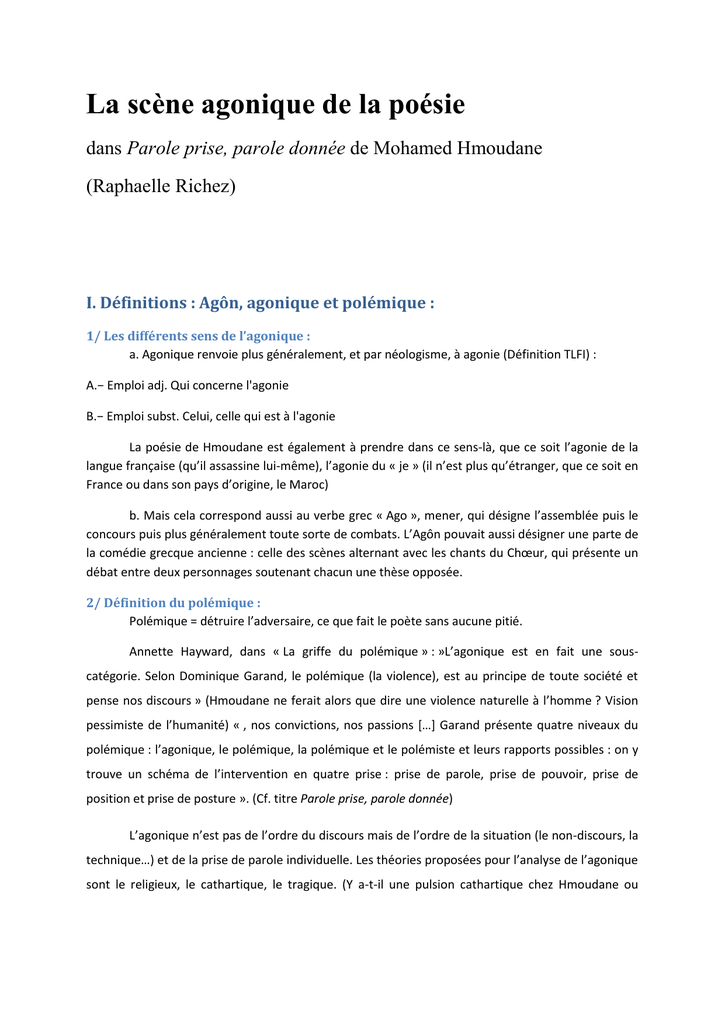 La scène agonique de la poésie dans Parole prise, parole donnée de Mohamed Hmoudane (Raphaelle Richez) I. Définitions : Agôn, agonique et polémique : 1/ Les différents sens de l’agonique : a. Agonique renvoie plus généralement, et par néologisme, à agonie (Définition TLFI) : A.− Emploi adj. Qui concerne l'agonie B.− Emploi subst. Celui, celle qui est à l'agonie La poésie de Hmoudane est également à prendre dans ce sens-là, que ce soit l’agonie de la langue française (qu’il assassine lui-même), l’agonie du « je » (il n’est plus qu’étranger, que ce soit en France ou dans son pays d’origine, le Maroc) b. Mais cela correspond aussi au verbe grec « Ago », mener, qui désigne l’assemblée puis le concours puis plus généralement toute sorte de combats. L’Agôn pouvait aussi désigner une parte de la comédie grecque ancienne : celle des scènes alternant avec les chants du Chœur, qui présente un débat entre deux personnages soutenant chacun une thèse opposée. 2/ Définition du polémique : Polémique = détruire l’adversaire, ce que fait le poète sans aucune pitié. Annette Hayward, dans « La griffe du polémique » : »L’agonique est en fait une souscatégorie. Selon Dominique Garand, le polémique (la violence), est au principe de toute société et pense nos discours » (Hmoudane ne ferait alors que dire une violence naturelle à l’homme ? Vision pessimiste de l’humanité) « , nos convictions, nos passions […] Garand présente quatre niveaux du polémique : l’agonique, le polémique, la polémique et le polémiste et leurs rapports possibles : on y trouve un schéma de l’intervention en quatre prise : prise de parole, prise de pouvoir, prise de position et prise de posture ». (Cf. titre Parole prise, parole donnée) L’agonique n’est pas de l’ordre du discours mais de l’ordre de la situation (le non-discours, la technique…) et de la prise de parole individuelle. Les théories proposées pour l’analyse de l’agonique sont le religieux, le cathartique, le tragique. (Y a-t-il une pulsion cathartique chez Hmoudane ou l’énoncé pur et simple de la violence sans justification ? Ambigüité quant à Hmoudane qui ne dit pas faire une « satire ». Serait-ce une simple dénonciation sans but précis sur le lecteur ?) Garand parle même d’un « art de la cruauté », que l’on retrouve bien ici : Hmoudane fait de la cruauté l’un des thèmes majeurs de son œuvre : de manière symbolique, il viole, tue, torture, insulte… D’après Foucault, l’agonique est « une émulation réciproque où l’on stimule l’autre et lutte avec lui dans une provocation permanente ». Le texte seul ne permet pas d’avoir la réponse de l’autre avec qui on se confronte donc devrait-on alors voir une autre subjectivité chez Hmoudane ? Y aurait-il un autre « Je » ? Foucault refuse l’emploi du terme « antagonique » (Chez Hmoudane, l’herméneutisme est bafoué), pour le terme d’« agonisme » : rapport à la fois d’incitation et de lutte, une provocation permanente. II. Parole prise, Parole donnée : théâtre de l’hybris confrontation violente et de la 1/ Le titre Se fonde sur une opposition, une addition, une accumulation, une énumération ou juste un parallélisme ? Titre très ambigu. « Prise » et « donnée » pouvant chacun avoir des sens différents. « Prise » est en tout cas très violent, dans l’idée d’une prise de possession non autorisée (et non pas la simple prise de parole), Hmoudane s’empare réellement de la parole (la langue française), la dénature, la maltraite, avant de la rendre. Le titre semble néanmoins faire office de proverbe « une parole prise est une parole donnée » : comme s’il prévenait le lecteur de quelque chose, de se méfier de la langue. 1/ Le poème comme théâtre Dans l’œuvre, si la forme est telle une pièce de théâtre maltraitée (numérotation mélangée ou répétée des actes), Hmoudane, ou plutôt la voix du poète, revendique cette espace théâtral : « j’orchestre des drames » (p.27), « Au tomber du rideau » (p. 28) Mais Hmoudane mélange les genres : il mêle du comique (par beaucoup d’humour, mais très majoritairement noir) à sa tragédie, mais également au niveau du langage, qu’il ne fait pas que maltraité mais qu’il mélange à d’autres, comme pour en faire une langue « bâtarde », ce qui renforce l’idée de violence. Mais également comme si, pour dire le réel, une langue au singulier ne suffisait pas, mais qu’il fallait une langue métissée, plurielle pour décrire le monde actuel. Les différentes religions également sont mêlées : le poème p. 21 se termine par « Pour mon Coran ! », celui p. 22 par « amen » et dans le suivant p. 23, il s’adonne à la religion juive ; cette « polygamie » religieuse est très ironique. 2/ « Je » et « Jeu » « Je » avec « Jeu » et « Je » contre « Jeu ». Herméneutisme bafoué, renversé dans le poème : bien contre mal mais sont alliés et détruisent ensemble : « Main contre main Dieu en personne et Satan réconciliés avaient donné les premiers coups de canon » (p11) Le poète maltraite la langue, « joue » son jeu cruel avec elle mais se retrouve mêlée à elle, comme s’il signifiait son attachement à la littérature malgré sa cruauté envers elle. « J’en suis le verbe suscité – j’en suis le verbe calciné – le verbe ressuscité ». Mais Hmoudane « joue » également avec les autres personnages de sa tragédie : il règle ses comptes avec des personnes qu’il a réellement rencontré (« Schérazade ») et est la plupart du temps agressifs envers eux ; seules les figures paternelle et maternelle semblent épargnées ; cependant ce qui semble être de doux souvenirs d’enfance sont irrémédiablement mêlés à cette violence. De plus, peut-on considérer l’œuvre comme un monologue ? La voix du poète n’estelle qu’une longue psal