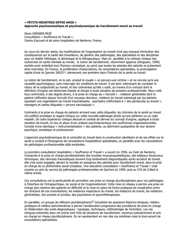 « PETITS MEURTRES ENTRE AMIS » Approche psychosomatique et psychodynamique du harcèlement moral au travail Marie GRENIER-PEZÉ Consultation « Souffrance et Travail ». Centre d’accueil et de soins hospitaliers de Nanterre, France. Au cours du dernier siècle, les modifications de l’organisation du travail n’ont pas manqué d’entraîner des conséquences sur la santé des travailleurs, de générer des pathologies, des spécialistes et des disciplines pour en établir l’étiologie, la sémiologie et la thérapeutique. Mais en parallèle à la richesse clinique des recherches en santé mentale au travail, la notion de harcèlement, récemment apparue (Hirigoyen, 1998) semble avoir embolisé tout l’horizon conceptuel, au point que toutes les plaintes des salariés se présentent ainsi nommées. En France, la prolifération d’associations, de consultations spécialisées, la promulgation rapide d’une loi (janvier 2002)[1], demeurent une première dans l’histoire de la santé au travail. La notion de harcèlement, on le sait, produit le couple « un pervers-une victime » et ne renvoie qu’à une causalité psychologique, sans interroger les conditions de travail. Il est donc intéressant de constater le retour de la subjectivité au travail, et des contraintes qu’elle y subit, au travers d’un concept dont la définition d’origine est désormais biaisée et élargie à toute situation de pression professionnelle. Nous voilà tous confrontés, à des degrés divers, à la prise en charge du « harcelé » : médecin généraliste dont le patient s’effondre depuis l’arrivée d’un nouveau directeur, médecin du travail submergé par les plaintes signalant une organisation du travail traumatisante, psychiatre s’affrontant à « des persécutés au travail », managers et cadres étiquetés « pervers narcissiques ». Contraints à la prise en charge de patients arrivant avec cette étiquette, les cliniciens de la santé au travail ont préféré privilégier le regard clinique sur cette nouvelle pathologie plutôt qu’une adhésion ou un rejet massifs. De cette expérience clinique découle le constat de dérives du concept d’origine, appliqué à toute situation de travail, en lieu et place d’une analyse psychodynamique des souffrances organisationnelles. Constat d’une identique « instrumentalisation » des patients, au détriment quelquefois de leur devenir psychique, somatique et professionnel. L’approche psychodynamique de la centralité du travail dans la construction identitaire et de ses effets sur la santé a conduit à l’émergence de consultations hospitalières spécialisées, en parallèle avec les consultations de pathologies professionnelles déjà existantes. La première consultation hospitalière « Souffrance et Travail » a ouvert en 1996, au Cash de Nanterre. Consacrée à la prise en charge pluridisciplinaire des troubles musculosquelettiques, des tableaux douloureux chroniques, des névroses traumatiques souvent trop tardivement diagnostiquées après accident de travail, elle s’est aussi engagée, devant la montée en puissance des plaintes pour harcèlement moral, dans la prise en charge de ce phénomène social complexe. Une deuxième consultation « Souffrance et Travail » s’est ouverte au sein du service de pathologies professionnelles de Garches en 1999, puis au CHI de Créteil la même année. Ces consultations ont la particularité de permettre une prise en charge pluridisciplinaire pour ces pathologies à l’interface de l’intrapsychique, du social et de l’organisationnel. Cette mise en réseau a permis une prise en charge plus réactive des patients en difficulté et la mise en place de fortes pratiques de coopération entre les cliniciens de ces consultations, les médecins inspecteurs du travail, les médecins du travail, les médecins généralistes, des avocats et juristes, des psychiatres et psychothérapeutes. En parallèle, un groupe de réflexion pluridisciplinaire[2] travaillant les questions théorico-cliniques, médicojuridiques et médico-administratives a permis l’amélioration progressive des procédures de prise en charge et l’élaboration des outils diagnostiques : typologie, techniques, méthodologie de l’entretien. Les cas cliniques présentés dans cet article sont tirés de situations de harcèlement, reconnus judiciairement et pris en charge en réseau pluridisciplinaire. Ils ne représentent en rien des cas extrêmes mais le tout-venant de consultations spécialisées. Le harcèlement moral, une contrainte par corps Comment comprendre la redoutable efficacité du harcèlement au travail sans faire retour sur la centralité des enjeux psychiques liés à la situation de travail? Ce qui confère au travail sa dimension proprement dramatique est son lien avec la construction identitaire. Il serait illusoire de penser que nous laissons notre histoire personnelle accrochée sur un cintre dans les vestiaires de notre lieu de travail. La plupart des salariés en bonne santé espèrent avoir l’occasion d’accéder à une reconnaissance de leur valeur dans le champ professionnel et d’y poursuivre, avec ses failles et ses impasses, la construction personnelle commencée dans l’enfance. Le travail reconnu comme œuvre personnelle permet de trouver dans le champ social une issue aux aspirations inconscientes. Bien qu’étrangère au corpus théorique de la psychanalyse, la notion de reconnaissance est parallèle à la conception freudienne de sublimation comme activité socialement valorisée, comme processus pulsionnel « réalisant une certaine sorte de modification de but et d’objet dans laquelle entre en considération notre évaluation sociale.[3] » En contrepartie de la contribution qu’il apporte à l’organisation du travail, le sujet attend une rétribution. Pas simplement un salaire, mais aussi une reconnaissance. La psychodynamique du travail souligne l’importance d