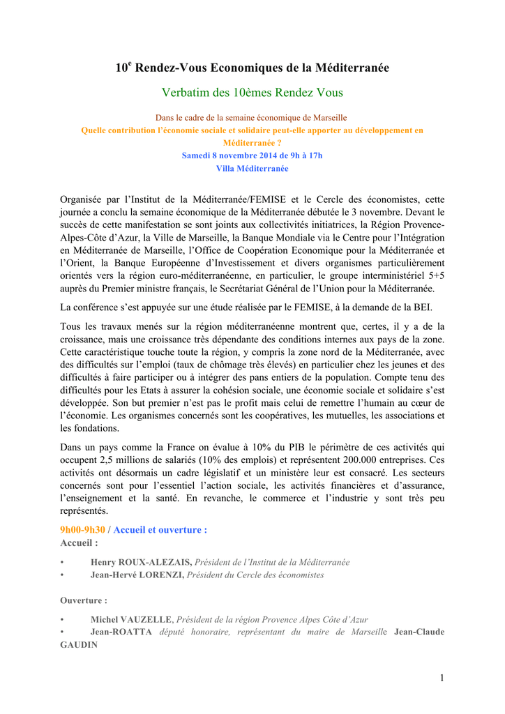 10e Rendez-Vous Economiques de la Méditerranée Verbatim des 10èmes Rendez Vous Dans le cadre de la semaine économique de Marseille Quelle contribution l’économie sociale et solidaire peut-elle apporter au développement en Méditerranée ? Samedi 8 novembre 2014 de 9h à 17h Villa Méditerranée Organisée par l’Institut de la Méditerranée/FEMISE et le Cercle des économistes, cette journée a conclu la semaine économique de la Méditerranée débutée le 3 novembre. Devant le succès de cette manifestation se sont joints aux collectivités initiatrices, la Région ProvenceAlpes-Côte d’Azur, la Ville de Marseille, la Banque Mondiale via le Centre pour l’Intégration en Méditerranée de Marseille, l’Office de Coopération Economique pour la Méditerranée et l’Orient, la Banque Européenne d’Investissement et divers organismes particulièrement orientés vers la région euro-méditerranéenne, en particulier, le groupe interministériel 5+5 auprès du Premier ministre français, le Secrétariat Général de l’Union pour la Méditerranée. La conférence s’est appuyée sur une étude réalisée par le FEMISE, à la demande de la BEI. Tous les travaux menés sur la région méditerranéenne montrent que, certes, il y a de la croissance, mais une croissance très dépendante des conditions internes aux pays de la zone. Cette caractéristique touche toute la région, y compris la zone nord de la Méditerranée, avec des difficultés sur l’emploi (taux de chômage très élevés) en particulier chez les jeunes et des difficultés à faire participer ou à intégrer des pans entiers de la population. Compte tenu des difficultés pour les Etats à assurer la cohésion sociale, une économie sociale et solidaire s’est développée. Son but premier n’est pas le profit mais celui de remettre l’humain au cœur de l’économie. Les organismes concernés sont les coopératives, les mutuelles, les associations et les fondations. Dans un pays comme la France on évalue à 10% du PIB le périmètre de ces activités qui occupent 2,5 millions de salariés (10% des emplois) et représentent 200.000 entreprises. Ces activités ont désormais un cadre législatif et un ministère leur est consacré. Les secteurs concernés sont pour l’essentiel l’action sociale, les activités financières et d’assurance, l’enseignement et la santé. En revanche, le commerce et l’industrie y sont très peu représentés. 9h00-9h30 / Accueil et ouverture : Accueil : • • Henry ROUX-ALEZAIS, Président de l’Institut de la Méditerranée Jean-Hervé LORENZI, Président du Cercle des économistes Ouverture : Michel VAUZELLE, Président de la région Provence Alpes Côte d’Azur • Jean-ROATTA député honoraire, représentant du maire de Marseille Jean-Claude GAUDIN • 1 9h30 / Session inaugurale : Henry ROUX-ALEZAIS, Président de l’Institut de la Méditerranée, dans son allocation d’ouverture souligne l’intérêt de l’Economie Sociale et Solidaire pour l ‘ouverture politique qu’elle permet aux jeunes. Ce doit être un élément important du nouveau contrat social qu’il faut offrir à la jeunesse. Les grands axes moteurs d’une nouvelle stratégie qui repose sur son développement sont : la culture numérique, une révolution pédagogique indispensable qui doit être fondée sur le développement des compétences en complément des diplômes qui n’ont pas le même objet car ils doivent d’abord socialiser par le niveau acquis dans un complexe de savoirs, la créativité, le tout dans le cadre d’un grand dessein méditerranéen à destination de la jeunesse fondé sur un héritage historique et orienté sur l’innovation. Michel VAUZELLE, Président de la Région Provence Alpes Côte d’Azur, souligne son bonheur à recevoir dans la villa Méditerranée qui est destinée, non pas à commémorer le passé, mais à penser l’avenir de la Méditerranée et de notre région. Il indique aussi la convergence qu’il y a entre les collectivités notamment, avec la ville, dans cette tâche. Par ailleurs, il souligne l’engagement de la région dans la coopération décentralisée et, notamment avec les régions de Kassérine en Tunisie et de Tanger au Maroc. Michel VAUZELLE fait part de son inquiétude au vu du déséquilibre de l’information entre les évènements qui sont rapportés sur les dissensions, la violence de la guerre, par rapport aux questions de fond qui sont traitées dans le présent colloque. Cela crée une caricature de l’Islam à travers le terrorisme, qui défigure l’identité des pays arabes et une religion. Dans la Région ProvenceAlpes-Côte d’Azur, c’est un sujet de préoccupation car si cette défiguration persiste il y a un danger profond pour que le racisme se développe dans la République « La politique méditerranéenne n’est pas une politique étrangère, les pays du Maghreb ne sont pas nos voisins nous sommes en cohabitation avec eux. C’est en pensant à nous que nous devons coopérer avec les pays méditerranéens dans un esprit de cohabitation. Nous ne sommes pas non plus le club méditerranéen ce qui est une véritable injure que j’ai vivement ressentie ». C’est aussi le seul moyen de s’opposer à l’idée de califat qui est en train de se développer. « Et je considère que c’est bien que la France ait fait son devoir en liaison avec les américains, un peu seule néanmoins en Europe. L’armée et la sécurité sont désormais indispensables mais la troisième dimension que vous représentez la société civile est également indispensable ». « La première question posée lorsque je rencontre les wallis et mes correspondants est comment améliorer la formation professionnelle pour donner des emplois aux jeunes. C’est là que nous devons agir et la région qui a la compétence sur la formation professionnelle doit jouer un rôle central. Cette communauté de fait qu’est la Méditerranée n