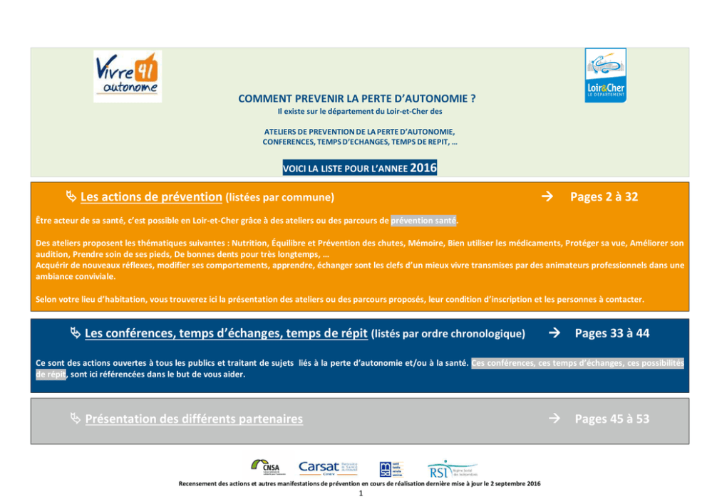 COMMENT PREVENIR LA PERTE D’AUTONOMIE ? Il existe sur le département du Loir-et-Cher des ATELIERS DE PREVENTION DE LA PERTE D’AUTONOMIE, CONFERENCES, TEMPS D’ECHANGES, TEMPS DE REPIT, … VOICI LA LISTE POUR L’ANNEE 2016 Les actions de prévention (listées par commune) Pages 2 à 32 Être acteur de sa santé, c’est possible en Loir-et-Cher grâce à des ateliers ou des parcours de prévention santé. Des ateliers proposent les thématiques suivantes : Nutrition, Équilibre et Prévention des chutes, Mémoire, Bien utiliser les médicaments, Protéger sa vue, Améliorer son audition, Prendre soin de ses pieds, De bonnes dents pour très longtemps, … Acquérir de nouveaux réflexes, modifier ses comportements, apprendre, échanger sont les clefs d’un mieux vivre transmises par des animateurs professionnels dans une ambiance conviviale. Selon votre lieu d’habitation, vous trouverez ici la présentation des ateliers ou des parcours proposés, leur condition d’inscription et les personnes à contacter. Les conférences, temps d’échanges, temps de répit (listés par ordre chronologique) Pages 33 à 44 Ce sont des actions ouvertes à tous les publics et traitant de sujets liés à la perte d’autonomie et/ou à la santé. Ces conférences, ces temps d’échanges, ces possibilités de répit, sont ici référencées dans le but de vous aider. Présentation des différents partenaires Pages 45 à 53 Recensement des actions et autres manifestations de prévention en cours de réalisation dernière mise à jour le 2 septembre 2016 1 ATELIERS OU PARCOURS DE PREVENTION SANTE LISTES PAR COMMUNE Lieu (commune) Ateliers/réunions Adresse SUR TOUT LE LOIR-ET-CHER Au domicile des personnes Atelier GYM Aidant/Aidé à domicile Public concerné Binôme Aidant / Aidé dont l’un est retraité GIR 5 ou 6 Dates (jour et horaire) A définir avec le binôme Nombre de séances 14 séances de 45 minutes Coût total par participant Informations et inscription auprès de : 20€ par binôme Groupe associatif Siel Bleu (Domisiel) Inscription et renseignement auprès de : Sophie BARBE Tél. 06 69 76 83 52 * Courriel. [email protected] BLOIS Maison Bleue 41 32.4 avenue Maunoury BLOIS Maison Bleue 41 32.4 avenue Maunoury Visite guidée du logement témoin présentant un panel de solutions pour le maintien à domicile / Salle de réunion prêtée gracieusement (25 personnes en table ronde) Gym Jardin Tout public et particulièrement les personnes de plus de 60 ans ou handicapées Tout public Ouvert du lundi au vendredi de 13h30 à 17h30. Visite sur rendezvous du lundi au vendredi de 9h00 à 12h30. Toute l'année Les mardis de 11h à 12h en juin 2016 Les mercredis de 11h à 12h en juillet 2016 Juin à juillet 2016 Gratuit Maison Bleue 41 32.4 avenue Maunoury Blois 02 45 50 55 25 http://www.lamaisonbleue41.fr/ 3€/personne et séance Groupe associatif Siel Bleu Inscription et renseignement auprès de : Sophie BARBE Tél. 06 69 76 83 52 * Courriel. [email protected] Recensement des actions et autres manifestations de prévention en cours de réalisation dernière mise à jour le 2 septembre 2016 2 BLOIS Maison Bleue 41 32.4 avenue Maunoury Aidant et en forme Aidant et serein Aidant mais pas seulement Les proches aidants c'est-àdire l’entourage des personnes en difficulté de vie du fait de l’âge, d’un handicap ou d’une maladie. Il peut s’agir d’un membre de la famille, d’amis, de voisins 4 octobre 2016 de 10h à 12h 1 séance collective (groupe de 15 personnes max) 1 séance collective (groupe de 15 personnes max) Gratuit sur inscription 18 octobre 2016 de 10h à 12h 1 séance collective (groupe de 15 personnes max) Gratuit sur inscription 11 octobre 2016 de 10h à 12h Gratuit sur inscription Inscription obligatoire auprès de la MFC, Céline GRANDJEAN par : - Tél. 02 54 70 59 81 - Courriel : [email protected] BLOIS Résidence Séniors 9 mail Pierre Charlot Ateliers Mémoire PAC Eurêka Personnes âgées de plus de 55 ans Du 28 septembre 2015 au 14 mars 2016 Les lundis de 15h à 17h Les lundis de 9h45 à 11h45 2 ateliers de 15 séances Coût par cycle d’ateliers 45€ par participant Inscription obligatoire auprès ASEPT Berry-Touraine 02 47 31 61 92 BLOIS Résidence Séniors 9 mail Pierre Charlot Ateliers du Bien vieillir Personnes âgées de plus de 55 ans Du 26 novembre 2015 au 4 février 2016 Les jeudis de 14h à 17h30 7 séances Coût par cycle d’ateliers 45€ par participant Inscription obligatoire auprès ASEPT Berry-Touraine 02 47 31 61 92 BLOIS Résidence Séniors 9 mail Pierre Charlot Ateliers du Bien vieillir Personnes âgées de plus de 55 ans Du 3 novembre 2016 au 26 janvier 2017 Les jeudis de 14h à 17h30 7 séances Coût par cycle d’ateliers 15€ par participant Inscription obligatoire auprès ASEPT Berry-Touraine 02 47 31 61 92 Atelier Activité physique adaptée Personnes atteintes d’une pathologie cancéreuse pendant et après le traitement A 14h30 les jeudis : 14 janvier 2016 28 janvier 2016 11 février 2016 25 février 2016 10 mars 2016 24 mais 2016 2 séances par mois Gratuit (financement par l’Agence Régionale de Santé) Inscription obligatoire ONCO 41 02 54 56 21 85 BLOIS Maison Begon rue Pierre et Marie Curie Recensement des actions et autres manifestations de prévention en cours de réalisation dernière mise à jour le 2 septembre 2016 3 BLOIS Centre de Gérontologie La Roselière Mail Pierre Charlot Les après-midis « Accueil » Personnes atteintes de la maladie Alzheimer et les aidants Tous les mercredis de 14h30 à 17h30 Toute l’année Gratuit BLOIS Centre de Gérontologie La Roselière Mail Pierre Charlot Groupe de parole Personnes atteintes de la maladie Alzheimer et les aidants Tous les 2ème vendredi du mois de 14h30 à 17h Toute l’année BLOIS La Roselière Mail Pierre Charlot Formation des aidants 5 modules sur : Connaître la maladie Les aides L’accompagnement Communiquer et comprendre Être aidant familial Aidants des pers