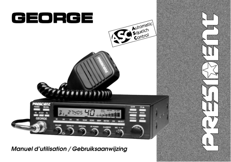 GEORGE Manuel d'utilisation / Gebruiksaanwijzing Votre PRESIDENT GEORGE en un coup d'oeil Uw PRESIDENT HARRY asc in een oogopslag SOMMAIRE is França INSTALLATION 5 UTILISATION 8 INHOUD INSTALLATIE lands Neder 19 HET GEBRUIK VAN DE CB RADIO 22 PROTECTION PAR CODE D’ACCÈS 15 BEVEILIGING DOOR TOEGANGSCODE 29 CARACTÉRISTIQUES TECHNIQUES 16 TECHNISCHE GEGEVENS 30 GUIDE DE DÉPANNAGE 16 TROUBLE-SHOOTING 30 COMMENT ÉMETTRE/RECEVOIR UN MESSAGE 17 HOE ZENDEN OF ONTVANGEN? 31 TABLEAU DES FRÉQUENCES 32 FREQUENTIES TABEL 32 3 ATTENTION ! Avant toute utilisation, prenez garde de ne jamais émettre sans avoir branché l'antenne (connecteur "B" situé sur la face arrière de l'appareil), ni réglé le TOS (Taux d'Ondes Stationnaires)! Sinon, vous risquez de détruire l'amplificateur de puissance, ce qui n'est pas couvert par la garantie. 4 Bienvenue dans le monde des émetteurs-récepteurs CB de la 3ème génération. Cette nouvelle gamme de postes INTERACTIFS vous fait accéder à la communication électronique la plus performante. Grâce à l’utilisation de technologies de pointe garantissant des qualités sans précédent, votre PRESIDENT GEORGE est un nouveau jalon dans la convivialité et la solution par excellence pour le pro de la CB le plus exigeant. Pour tirer le meilleur parti de toutes ses possibilités, nous vous conseillons de lire attentivement ce mode d’emploi avant d’installer et d’utiliser votre CB PRESIDENT GEORGE. f) Lors du montage, n’oubliez pas d’insérer les rondelles de caoutchouc (3) entre le poste et son support. Celles-ci jouent en effet un rôle «d’amortisseur» et permettent une orientation et un serrage en douceur du poste. g) Choisissez un emplacement pour le support du micro et prévoyez le passage de son cordon. - NOTA : Votre poste mobile possédant une prise micro en façade peut être encastré dans le tableau de bord. Dans ce cas, il est recommandé d’y adjoindre un haut-parleur externe pour une meilleure écoute des communications (connecteur EXT.SP situé sur la face arrière de l’appareil : D). Renseignez-vous auprès de votre revendeur Point Conseil le plus proche pour le montage de votre appareil. A) INSTALLATION : 1) CHOIX DE L’EMPLACEMENT ET MONTAGE DU POSTE MOBILE : a) Choisissez l’emplacement le plus approprié à une utilisation simple et pratique de votre poste mobile. b) Veillez à ce qu’il ne gêne pas le conducteur ni les passagers du véhicule. c) Tenez compte du fait que la lisibilité maximale de l’afficheur LCD se situe dans un angle de vision compris entre - 20° à + 60°. Angle de vision d) Prévoyez le passage et la protection des différents câbles, (alimentation, antenne, accessoires...) afin qu’ils ne viennent en aucun cas perturber la conduite du véhicule. e) Utilisez pour le montage le berceau (1) livré avec l’appareil, fixez-le solidement à l’aide des vis autotaraudeuses (2) fournies (diamètre de perçage 3,2 mm). Prenez garde de ne pas endommager le système électrique du véhicule lors du perçage du tableau de bord. SCHÉMA GÉNÉRAL DE MONTAGE 5 2) INSTALLATION DE L’ANTENNE : 3) CONNEXION DE L’ALIMENTATION : a) Choix de l’antenne : - En CB, plus une antenne est grande, meilleur est son rendement. Votre Point Conseil saura orienter votre choix. Votre PRESIDENT GEORGE est muni d’une protection contre les inversions de polarité. Néanmoins, avant tout branchement, vérifiez vos connexions. Votre poste doit être alimenté par une source de courant continu de 12 Volts (A). A l’heure actuelle, la plupart des voitures et des camions fonctionnent avec une mise à la masse négative. On peut s’en assurer en vérifiant que la borne (-) de la batterie soit bien connectée au bloc moteur ou au châssis. Dans le cas contraire, consultez votre revendeur. b) Antenne mobile : - Il faut l’installer à un endroit du véhicule où il y a un maximum de surface métallique (plan de masse), en s’éloignant des montants du pare-brise et de la lunette arrière. - Dans le cas où une antenne radiotéléphone est déjà installée, l’antenne CB doit être au-dessus de celle-ci. - Il existe 2 types d’antennes : les préréglées et les réglables. - Les préréglées s’utilisent de préférence avec un bon plan de masse (pavillon de toit ou malle arrière). - Les réglables offrent une plage d’utilisation beaucoup plus large et permettent de tirer parti de plans de masse moins importants (voir p 9 § 5 RÉGLAGE DU TOS) . - Pour une antenne à fixation par perçage, il est nécessaire d’avoir un excellent contact antenne/plan de masse ; pour cela, grattez légèrement la tôle au niveau de la vis et de l’étoile de serrage. - Lors du passage du câble coaxial, prenez garde de ne pas le pincer ou l’écraser (risque de rupture ou de court-circuit). - Branchez l’antenne (B). ATTENTION : Les camions possèdent généralement deux batteries et une installation électrique en 24 Volts. Il sera donc nécessaire d’intercaler dans le circuit électrique un convertisseur 24/12 Volts (Type PRESIDENT CV 24/12). Toutes les opérations de branchement suivantes doivent être effectuées cordon d’alimentation non raccordé au poste : a) Assurez-vous que l’alimentation soit bien de 12 Volts. b) Repérez les bornes (+) et (-) de la batterie (+ = rouge, - = noir). Dans le cas où il serait nécessaire de rallonger le cordon d’alimentation, utilisez un câble de section équivalente ou supérieure. c) Il est nécessaire de se connecter sur un (+) et un (-) permanents, afin de ne pas avoir à saisir le code d’accès (Security Code System) à chaque mise en route du véhicule. Nous vous conseillons donc de brancher directement le cordon d’alimentation sur la batterie (le branchement sur le cordon de l’auto-radio ou sur d’autres parties du circuit électrique pouvant dans certains cas favoriser la réception de signaux parasites). d) Branchez le fil rouge (+) à la borne positive de la batt