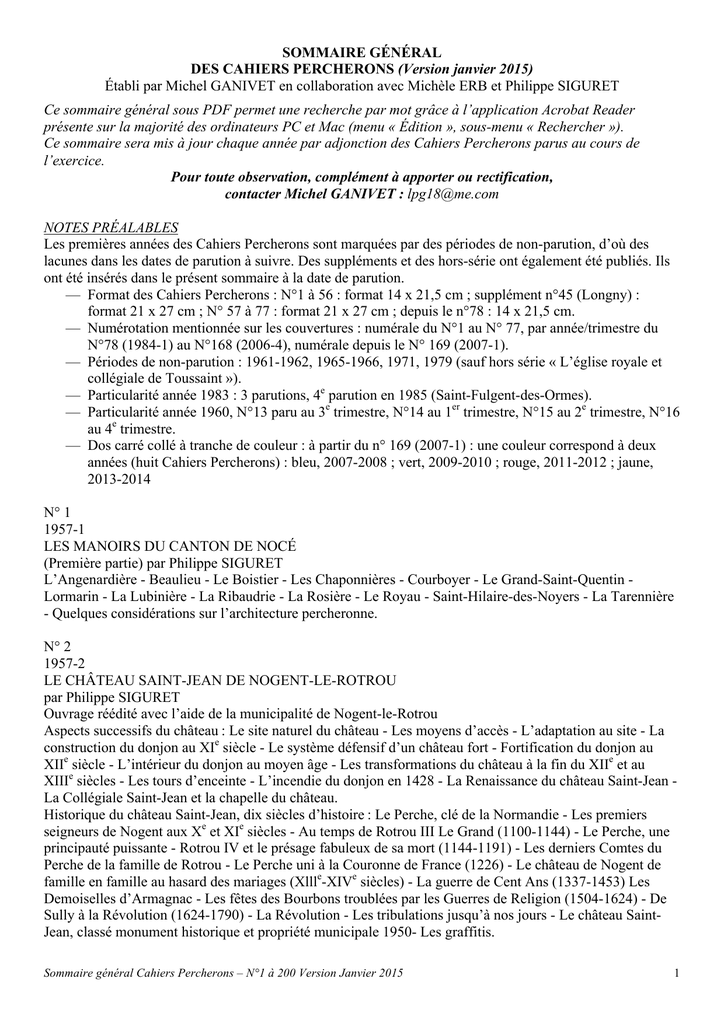 SOMMAIRE GÉNÉRAL DES CAHIERS PERCHERONS (Version janvier 2015) Établi par Michel GANIVET en collaboration avec Michèle ERB et Philippe SIGURET Ce sommaire général sous PDF permet une recherche par mot grâce à l’application Acrobat Reader présente sur la majorité des ordinateurs PC et Mac (menu « Édition », sous-menu « Rechercher »). Ce sommaire sera mis à jour chaque année par adjonction des Cahiers Percherons parus au cours de l’exercice. Pour toute observation, complément à apporter ou rectification, contacter Michel GANIVET : [email protected] NOTES PRÉALABLES Les premières années des Cahiers Percherons sont marquées par des périodes de non-parution, d’où des lacunes dans les dates de parution à suivre. Des suppléments et des hors-série ont également été publiés. Ils ont été insérés dans le présent sommaire à la date de parution. — Format des Cahiers Percherons : N°1 à 56 : format 14 x 21,5 cm ; supplément n°45 (Longny) : format 21 x 27 cm ; N° 57 à 77 : format 21 x 27 cm ; depuis le n°78 : 14 x 21,5 cm. — Numérotation mentionnée sur les couvertures : numérale du N°1 au N° 77, par année/trimestre du N°78 (1984-1) au N°168 (2006-4), numérale depuis le N° 169 (2007-1). — Périodes de non-parution : 1961-1962, 1965-1966, 1971, 1979 (sauf hors série « L’église royale et collégiale de Toussaint »). — Particularité année 1983 : 3 parutions, 4e parution en 1985 (Saint-Fulgent-des-Ormes). — Particularité année 1960, N°13 paru au 3e trimestre, N°14 au 1er trimestre, N°15 au 2e trimestre, N°16 au 4e trimestre. — Dos carré collé à tranche de couleur : à partir du n° 169 (2007-1) : une couleur correspond à deux années (huit Cahiers Percherons) : bleu, 2007-2008 ; vert, 2009-2010 ; rouge, 2011-2012 ; jaune, 2013-2014 N° 1 1957-1 LES MANOIRS DU CANTON DE NOCÉ (Première partie) par Philippe SIGURET L’Angenardière - Beaulieu - Le Boistier - Les Chaponnières - Courboyer - Le Grand-Saint-Quentin Lormarin - La Lubinière - La Ribaudrie - La Rosière - Le Royau - Saint-Hilaire-des-Noyers - La Tarennière - Quelques considérations sur l’architecture percheronne. N° 2 1957-2 LE CHÂTEAU SAINT-JEAN DE NOGENT-LE-ROTROU par Philippe SIGURET Ouvrage réédité avec l’aide de la municipalité de Nogent-le-Rotrou Aspects successifs du château : Le site naturel du château - Les moyens d’accès - L’adaptation au site - La construction du donjon au XIe siècle - Le système défensif d’un château fort - Fortification du donjon au XIIe siècle - L’intérieur du donjon au moyen âge - Les transformations du château à la fin du XIIe et au XIIIe siècles - Les tours d’enceinte - L’incendie du donjon en 1428 - La Renaissance du château Saint-Jean La Collégiale Saint-Jean et la chapelle du château. Historique du château Saint-Jean, dix siècles d’histoire : Le Perche, clé de la Normandie - Les premiers seigneurs de Nogent aux Xe et XIe siècles - Au temps de Rotrou III Le Grand (1100-1144) - Le Perche, une principauté puissante - Rotrou IV et le présage fabuleux de sa mort (1144-1191) - Les derniers Comtes du Perche de la famille de Rotrou - Le Perche uni à la Couronne de France (1226) - Le château de Nogent de famille en famille au hasard des mariages (Xllle-XIVe siècles) - La guerre de Cent Ans (1337-1453) Les Demoiselles d’Armagnac - Les fêtes des Bourbons troublées par les Guerres de Religion (1504-1624) - De Sully à la Révolution (1624-1790) - La Révolution - Les tribulations jusqu’à nos jours - Le château SaintJean, classé monument historique et propriété municipale 1950- Les graffitis. Sommaire général Cahiers Percherons – N°1 à 200 Version Janvier 2015 1 N° 3 1957-3 MORTAGNE-AU-PERCHE ET SES ENVIRONS (Première partie), par Philippe SIGURET (Cahier réalisé avec la revue Art de Basse-Normandie n°53 (1969), puis réédité sous le n° 68, en format 21x27 cm en 1981 et en 2000, voir ci-après). Les grandes heures de Mortagne-au-Perche : Des origines au Xe siècle - Le premier château de Mortagne Le Fort Toussaint, second château de Mortagne - La Collégiale de Toussaint - Chartrage - Mortagne, sous les Comtes d’Alençon et du Perche - Mortagne et la Guerre de Cent Ans - Vieilles maisons des XVe et XVIe siècles - Notre-Dame de Mortagne - Marguerite de Lorraine « en son séjour de Mortaigne » - L’Hôtel de Dieu et le couvent de Saint-François - Les Guerres de Religions - Mortagne, capitale administrative sous l’Ancien Régime - Perche et Canada - À la veille de la Révolution - La Révolution - Mortagne au siècle dernier. Chevaux et comices. Carte de la région de Mortagne. Environs de Mortagne : Saint-Germain de Loisé - Villiers, la romaine - Nonantel et sa légende - Feings et le Val-Dieu - En forêt de Réno - De l’Eglise au Collège de Courgeon - Loisail - En flânant de Mortagne à Mauves - Mauves et Catinat, maréchal de France - Le château de Landres - La Mare - Le Grand Cosnier et le Chauchis - Le Comté carolingien de Corbon - Le Manoir de Vove - La Chapelle-Montligeon - Les services administratifs sous la Monarchie. N° 4 1957-4 BELLÊME HISTOIRE ET TOURISME, par Philippe SIGURET Belisama, déesse gauloise - Bellême et l’histoire - Origine de la seigneurie de Bellême - Yves et la chapelle Saint-Santin - Guillaume et la collégiale Saint-Léonard - Le nouveau château de Bellême - L’expansion de la puissance des Bellême - Premières difficultés avec le Maine - Guillaume de Bellême au pays de Sées Humiliation en Normandie - Robert 1er de Bellême, assassiné dans sa prison - Guillaume II et son frère, Yves II - Vengeance de Guillaume contre Giroie - Yves de Bellême, évêque de Sées - Nouvelles rivalités aux confins du Maine - Bellême sous l’influence normande - Mabile de Bellême - Une empoisonneuse - Mabile et le comte de Mortagne - La fin tragique de Mabile - Robert II de Bellême, surnommé le Diable - Robert, in