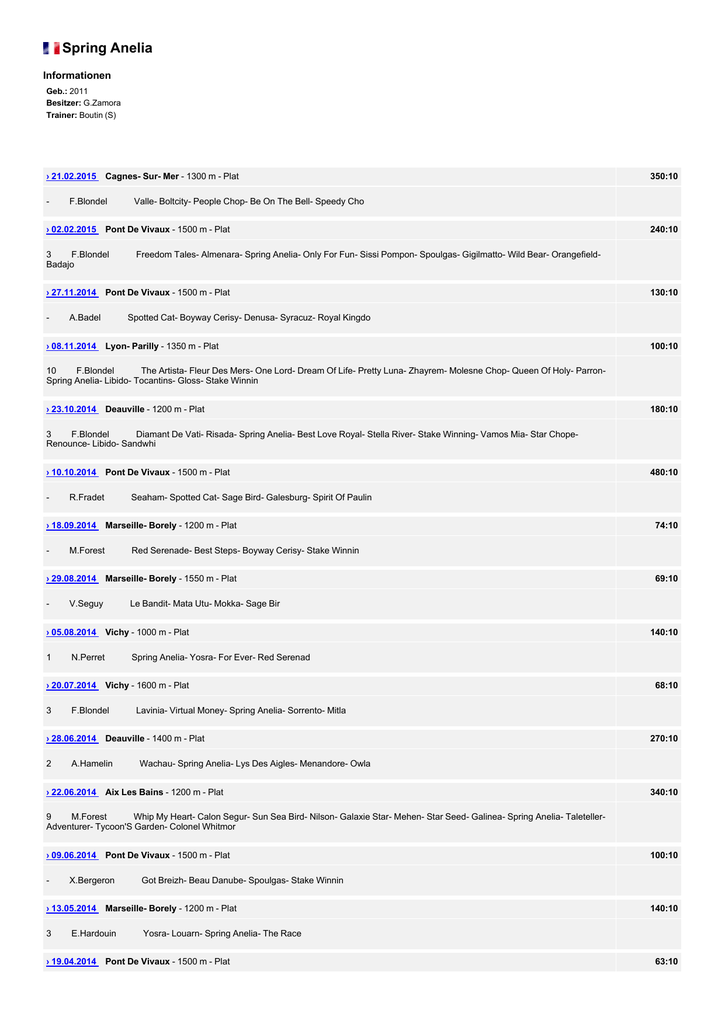Spring Anelia Informationen Geb.: 2011 Besitzer: G.Zamora Trainer: Boutin (S) › 21.02.2015 Cagnes- Sur- Mer - 1300 m - Plat 350:10 - F.Blondel Valle- Boltcity- People Chop- Be On The Bell- Speedy Cho › 02.02.2015 Pont De Vivaux - 1500 m - Plat 240:10 3 F.Blondel Freedom Tales- Almenara- Spring Anelia- Only For Fun- Sissi Pompon- Spoulgas- Gigilmatto- Wild Bear- OrangefieldBadajo › 27.11.2014 Pont De Vivaux - 1500 m - Plat 130:10 - A.Badel Spotted Cat- Boyway Cerisy- Denusa- Syracuz- Royal Kingdo › 08.11.2014 Lyon- Parilly - 1350 m - Plat 100:10 10 F.Blondel The Artista- Fleur Des Mers- One Lord- Dream Of Life- Pretty Luna- Zhayrem- Molesne Chop- Queen Of Holy- ParronSpring Anelia- Libido- Tocantins- Gloss- Stake Winnin › 23.10.2014 Deauville - 1200 m - Plat 180:10 3 F.Blondel Diamant De Vati- Risada- Spring Anelia- Best Love Royal- Stella River- Stake Winning- Vamos Mia- Star ChopeRenounce- Libido- Sandwhi › 10.10.2014 Pont De Vivaux - 1500 m - Plat 480:10 - R.Fradet Seaham- Spotted Cat- Sage Bird- Galesburg- Spirit Of Paulin › 18.09.2014 Marseille- Borely - 1200 m - Plat 74:10 - M.Forest Red Serenade- Best Steps- Boyway Cerisy- Stake Winnin › 29.08.2014 Marseille- Borely - 1550 m - Plat 69:10 - V.Seguy Le Bandit- Mata Utu- Mokka- Sage Bir › 05.08.2014 Vichy - 1000 m - Plat 140:10 1 N.Perret Spring Anelia- Yosra- For Ever- Red Serenad › 20.07.2014 Vichy - 1600 m - Plat 68:10 3 F.Blondel Lavinia- Virtual Money- Spring Anelia- Sorrento- Mitla › 28.06.2014 Deauville - 1400 m - Plat 270:10 2 A.Hamelin Wachau- Spring Anelia- Lys Des Aigles- Menandore- Owla › 22.06.2014 Aix Les Bains - 1200 m - Plat 340:10 9 M.Forest Whip My Heart- Calon Segur- Sun Sea Bird- Nilson- Galaxie Star- Mehen- Star Seed- Galinea- Spring Anelia- TaletellerAdventurer- Tycoon'S Garden- Colonel Whitmor › 09.06.2014 Pont De Vivaux - 1500 m - Plat 100:10 - X.Bergeron Got Breizh- Beau Danube- Spoulgas- Stake Winnin › 13.05.2014 Marseille- Borely - 1200 m - Plat 140:10 3 E.Hardouin Yosra- Louarn- Spring Anelia- The Race › 19.04.2014 Pont De Vivaux - 1500 m - Plat 63:10 - F.Blondel Biloka- Batori Maria- Ahouva- Gigilmatt › 28.03.2014 Pont De Vivaux - 2000 m - Plat 96:10 - F.Blondel Art Of Zapping- Polissonne- Madoka- Janaya- Les Yeux Revolver- Pump Pump Doll- Falkhair- Lady Surprise- OttomanDeco Baks › 13.03.2014 Pont De Vivaux - 1500 m - Plat 100:10 2 X.Bergeron Spoulgas- Spring Anelia- Stake Winning- Ceramick- In Love Kelty- Baia Chope- Deco Bakst- Sheridan Street- New Elite- Jolie Demoisell › 25.02.2014 Pont De Vivaux - 1500 m - Plat 540:10 3 F.Blondel Il Presuntuoso- Sissi Pompon- Spring Anelia- Le Virtuose- Spoulga › 13.02.2014 Pont De Vivaux - 2000 m - Plat 570:10 - F.Masse Horpensa- After Math- Butte Montmartre- Folkl › 30.01.2014 Cagnes- Sur- Mer - 1500 m - Plat 950:10 - S.Ruis Eba Chope- Gangnam Style- Koliakhova- Sweet Smoke- Princess Kiar › 12.10.2013 Pont De Vivaux - 1500 m - Plat 200:10 - F.Masse Milow- Biloka- Sting Chope- Doshermana › 24.09.2013 Nantes - 1600 m - Plat 110:10 - Alex.Roussel Kenzinga- My Dear Watson- La Goutte D'Or- One Peac › 08.09.2013 Dax - 1400 m - Plat 160:10 3 M.Lauron Quiaa Nominoor- Katz- Spring Anelia- Dolce La Hulpe- Sting Chop › 25.08.2013 Deauville - 1500 m - Plat 190:10 5 M.Guyon Easy De Glanville- Diamond Dust- Golden Surprise- Twombly- Spring Aneli › 12.08.2013 Le Lion D'Angers - 1400 m - Plat 260:10 - Alex.Roussel Mi Vida- My Sapphire- Gazon Maudi › 30.07.2013 La Teste De Buch - 1200 m - Plat 130:10 7 Fx.Bertras Tarnag- Lady Palace- Victorianvalentine- Loumaxaye- Larra Chope- Lavistahermosa- Spring Anelia- Levoil › 23.07.2013 Chantilly - 1200 m - Plat 420:10 - T.Piccone Victorianvalentine- Molesne Chop- Stella Indiana- Diamond Dus › 14.07.2013 Vichy - 1000 m - Plat 94:10 - T.Piccone Sud Tempete- La Goutte D'Or- Ile Aux Cygnes- Ponthie › 07.06.2013 Lyon- Parilly - 1200 m - Plat 23:10 - M.Guyon Dada Tzara- Deco Bakst- Brise Divine- Clara Bell › 31.05.2013 Marseille- Borely - 1200 m - Plat 33:10 3 T.Piccone Zylpha- Victorianvalentine- Spring Anelia- Secret Adevay › 20.05.2013 Salon- De- Provence - 1100 m - Plat 48:10 2 T.Piccone Winshine- Spring Anelia- Spirit Of Pauline- Unanimite- Maia Chop › 04.05.2013 Lyon La Soie - 950 m - Plat 42:10 1 T.Piccone Spring Anelia- Secret Adevayo- One Lord- Dix Neuf Six- Ponthieu- Lady Jamila- Kalimix De Latoue- Rumba Gitana- Deco Bakst- Islanzad › 13.04.2013 Marseille- Borely - 950 m - Plat 46:10 - A.Coutier Winshine- Avenue Raphael- Marie D'O- Lady Surpris › 07.04.2013 Lyon- Parilly - 1000 m - Plat 2 T.Piccone New Elite- Spring Anelia- Daram Beauty- Dada Tzar Stand: 30.09.2016 57:10