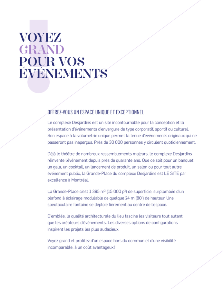 VOYEZ GRAND POUR VOS ÉVÉNEMENTS OFFREZ-VOUS UN ESPACE UNIQUE ET EXCEPTIONNEL Le complexe Desjardins est un site incontournable pour la conception et la présentation d’événements d’envergure de type corporatif, sportif ou culturel. Son espace à la volumétrie unique permet la tenue d’événements originaux qui ne passeront pas inaperçus. Près de 30 000 personnes y circulent quotidiennement. Déjà le théâtre de nombreux rassemblements majeurs, le complexe Desjardins réinvente l’événement depuis près de quarante ans. Que ce soit pour un banquet, un gala, un cocktail, un lancement de produit, un salon ou pour tout autre événement public, la Grande-Place du complexe Desjardins est LE SITE par excellence à Montréal. La Grande-Place c’est 1 395 m2 (15 000 p2) de superficie, surplombée d’un plafond à éclairage modulable de quelque 24 m (80’) de hauteur. Une spectaculaire fontaine se déploie fièrement au centre de l’espace. D’emblée, la qualité architecturale du lieu fascine les visiteurs tout autant que les créateurs d’événements. Les diverses options de configurations inspirent les projets les plus audacieux. Voyez grand et profitez d’un espace hors du commun et d’une visibilité incomparable, à un coût avantageux ! DES SERVICES DE HAUT NIVEAU Le complexe Desjardins offre des services de gestion et de production de haut niveau. Notre équipe dédiée et expérimentée saura vous guider avec aisance dans la planification et la réalisation de votre événement, afin d’en faire un succès assuré. Tant le personnel de gestion et de coordination, que les services techniques et logistiques vous accorderont toute la disponibilité et l’attention nécessaires pour que votre événement se réalise dans les meilleures conditions et à un coût fort compétitif. Nous prenons les grands moyens pour élever haut la barre de vos projets afin d’en faire des évènements mémorables. Notre équipe d’experts : : : : : : : : : : : : : : : : : : : : : : : Gestionnaire de projets Chargé de projets Directeur technique Scénographe et dessins CAD Régisseur Chefs de départements (son, éclairage, vidéo, gréage, machinistes) Sonorisateur, éclairagiste, projection, Menuisier, peintre scénique Personnel d’accueil Valet parking Sécurité DES ÉQUIPEMENTS POLYVALENTS Le complexe Desjardins met à votre disposition une gamme complète d’équipements professionnels pour vos évènements, salons et expositions : équipement scénique et d’exposition, sonorisation, éclairage, etc. qui vous permettront de sauver temps et argent. La Grande-Place du complexe Desjardins est également munie de circuits électriques au plancher, d’un réseau WI-FI, d’un local d’appoint multifonctionnel et d’un réseau téléphonique dédiés aux événements. Le complexe Desjardins dispose d’un vaste quai de livraison et d’équipements de transport pour faciliter le montage et le démontage des événements. Un stationnement intérieur de 1100 places avec service de valet constitue une valeur ajoutée pour la clientèle. LISTE DÉTAILLÉE DES ÉQUIPEMENTS Équipement scénique comprenant entre autres : : : : : : : : : Module de scène 4’ X 8’ à hauteur variable, avec jupes de scène Fond de scène en rideaux noirs Cadre de scène en ponts d’éclairage Lutrin en plexiglas transparent Équipement de sonorisation comprenant entre autres : : : : : : : : : : : Console audio MIDAS - Venice 320 Console d’effets complète, SPX 900, Roland dep-5, Klark Teckmic 30 Micros sans fil et filaires Moniteurs de scène Haut-parleur EAW modèle jf-260 avec sub hoofer EAW sb-250 et moniteurs AEW sm-122 : : Système de son périphérique BOSE Équipement d’éclairage comprenant entre autres : : : : : : : : : : : : : : : Console d’éclairage Leprecon 624 Gradateur (24X2.4 KVA Strand lighting 80 cd) Barres à 6 par 1000 watts Manfrotto Par 1000 watts Stainless U-Ground Par LED Transformateur 75 KVA/600 volt/600 amp/3 phases sortie Hubell 120/208 ou Camlock 100 ampères : : Boîtes électriques 12 circuits 15 ampères : : Transformateur 150 KVA/600 volt/400amp/3phases/sortie Camlock Éclairage de la fontaine et du plafond du complexe Desjardins Nous avons aussi la possibilité d’utiliser les lampes motorisées qui sont accrochées au plafond, ainsi que les plafonniers : : : 19 effets de plafond prédéfinis avec un choix de couleurs séparé pour la fontaine et le plafond : : 16 Clay Paky Alpha Spot HPE 1500 watts : : 24 Mac 101 : : Ces appareils d’éclairage sont disponibles à la demande et selon leur bon fonctionnement au moment de la réservation. Projection sur les colonnes En plus de l’équipement d’éclairage, les quatre colonnes de la Grande-Place sont équipées de projecteurs — plus spécifiquement, quatre groupes de quatre projecteurs Christie 10K. : : Couleurs et animations prédéfinies : : Service d’intégration de votre logo et de vos animations : : Service de conception d’animation sur mesure Équipements d’exposition et salon comprenant en autres : : : : : : : : : : : : : : : : : Table de 6’ avec nappes et jupes Chaises pliantes Système d’exposition Illico avec vitrine Bollard Structure d’affichage Chariots plateformes Vestiaires portatifs Boîtes de tirage Autres équipements : : : : : : : : : : : : : : : Loge équipée avec salle de bain et douche Prises de courant au plancher 20 ampères Internet haute vitesse Téléphonie Monte-charge Point d’accrochage au plafond Machinerie (nacelle, chariot élévateur) AU COEUR DU QUARTIER DES SPECTACLES Le complexe Desjardins bénéficie d’un emplacement privilégié au cœur du nouveau centre-ville et au carrefour des grands sites culturels de Montréal. La présence de prestigieux voisins comme la Place-des-Arts, la place des Festivals, le Musée d’art contemporain et le Palais des congrès ajoutent à une situation géographique des plus avantageuses. Situé dans l’axe évén