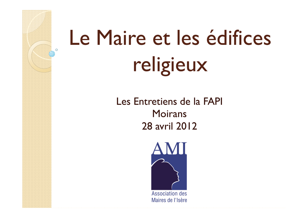 Le Maire et les édifices religieux Les Entretiens de la FAPI Moirans 28 avril 2012 A qui appartient l’église ? En général à la commune, si elle a été construite avant 1905 (domaine public, à la différence des presbytères qui font partie du domaine privé). Tous les objets présents dans l’église avant 1905 appartiennent à la commune, sauf preuve du contraire. Acquis ou construits après 1905, la propriété des églises et des objets mobiliers revient à l’association diocésaine ou à la personne physique ou morale qui les a financés. Dans le cas des églises antérieures à 1905, la commune, bien que propriétaire, n’a pas la jouissance de son bien : - il est mis à disposition du clergé et des fidèles, - il est affecté au culte (il s’agit d’une affectation légale, gratuite, perpétuelle et exclusive), L’intérêt de connaître le classement de son église,,, Une église peut être classée “monuments historiques” ou simplement “inscrite à l’inventaire supplémentaire des monuments historiques” : Église classée (partiellement ou en totalité) Église inscrite (partiellement ou en totalité) Église non protégée Non protégée, elle peut être soumise à une réglementation particulière : abords des monuments historiques, ZPPAUP (Zone de Protection du Patrimoine Architectural, Urbain et Paysager), site naturel protégé. En fonction de son degré de protection, procédures et financements seront différents. Connaître le statut de son église est donc essentiel. ,,, pour mieux la protéger Les procédures, les interlocuteurs et les financements sont fonction : ◦ ◦ ◦ ◦ de la nature de la protection (inscription ou classement), de la nature du projet (aménagement ou restauration), du statut du projet (immeuble ou objet mobilier), du montant des travaux (gros travaux en investissement ou travaux d’entretien) ◦ de la maîtrise d’ouvrage (commune propriétaire ou État). Quelles sont les responsabilités de la commune ? La responsabilité de l’entretien de l’église incombe à la commune et à l’affectataire (le clergé et les fidèles), Le nettoyage de l’église et le petit entretien est pris en charge par l’affectataire. La commune est responsable des dommages causés par le mauvais entretien et l’absence de travaux, même lorsque l’église est protégée au titre des Monuments Historiques. La décision d’entreprendre les travaux ne constitue pas une obligation, mais tout dommage résultant de l’absence de travaux engage sa responsabilité. La commune, propriétaire, est responsable du bâtiment et de son entretien. Jusqu’où peut ou doit aller le maire ? La commune propriétaire ne peut disposer de l’église de sa seule initiative, La commune assure l’entretien du clos et du couvert, les réparations peuvent être entreprises contre l’avis de l’affectataire si la commune les estime nécessaires à la conservation de l’édifice qui lui appartient, Les travaux de mise en valeur ou de décoration intérieure nécessitent l’accord de l’affectataire, Une commune a l’obligation d’effectuer les travaux si une offre de concours organisée par des paroissiens permet de récolter des financements qui peuvent être complétés par des subventions, Obligations réglementaires en matière de sécurité et d’accessibilité Obligations en matière de sécurité : Rappel : Les établissements recevant du public sont classés en types et en catégories, en fonction de leur utilisation et de leur capacité d’accueil. • Si l’église peut accueillir 300 personnes et plus, ce sera un édifice de catégorie 1, 2 ou 3 : - Une visite de la commission de sécurité est obligatoire tous les 5 ans. - La commune doit tenir et mettre à jour un registre de sécurité. • Si l’église peut accueillir moins de 300 personnes, ce sera un édifice de catégorie 5 : - La visite de la commission de sécurité n’est pas obligatoire, mais le maire peut faire une demande motivée de visite auprès de la commission locale de sécurité, s’il estime que le bâtiment présente un risque. - Même en 5è catégorie, l’église reste soumise aux obligations de sécurité des ERP : l’absence d’obligation de visite n’exonère pas la commune des contrôles et vérifications prévus par la loi. Obligations réglementaires en matière de sécurité et d’accessibilité Obligations en matière d’accessibilité : La loi du 11 février 2005 impose à chaque propriétaire d’établissement recevant du public la réalisation d’un diagnostic technique et financier des travaux à entreprendre pour assurer l’accès de l’édifice aux personnes handicapées. Les travaux seront à réaliser d’ici 2015. Les églises devront se conformer à cette obligation. Trois dérogations sont permises : ◦ en cas d’impossibilité technique, ◦ en cas de contraintes liées à la conservation du patrimoine, ◦ en cas de disproportion manifeste entre les améliorations apportées et leurs conséquences. (Conseil auprès du Service Départemental de l’Architecture et du Patrimoine ou auprès de l’Agence Technique Départementale. Obligations réglementaires en matière de sécurité et d’accessibilité Protection contre la foudre et l’incendie: L’installation d’un parafoudre pour l’installation électrique en complément du paratonnerre est recommandée. Un éclairage de sécurité (veilleuse indiquant les sorties) est obligatoire. Nécessité de vérifier la présence d’extincteurs : attention : les types d’extincteurs diffèrent selon la source potentielle d’incendie (se renseigner auprès du Service Départemental d’Incendie et de Secours). Validation que le local électrique et/ou la chaufferie ne servent pas de lieu de rangement. Pour un édifice cultuels normal de type V, il est conseillé d’avoir 2 extincteurs à eau pulvérisée de 6 l, 1 extincteur au CO2 de 2 kg près du tableau électrique, et