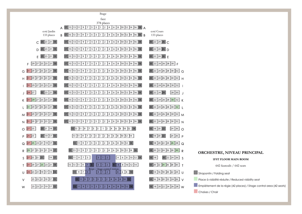 Stage face 378 places 17 15 13 11 9 7 5 3 1 2 4 6 8 10 12 14 16 18 coté Jardin 133 places 17 15 13 11 9 7 5 3 1 2 4 6 8 10 12 14 16 18 coté Cours 133 places 25 23 21 19 17 15 13 11 9 7 5 3 1 2 4 6 8 10 12 14 16 18 20 22 24 26 25 23 21 19 17 15 13 11 9 7 5 3 1 2 4 6 8 10 12 14 16 18 20 22 24 26 25 23 21 19 17 15 13 11 9 7 5 3 1 2 4 6 8 10 12 14 16 18 20 22 24 26 29 27 25 23 21 19 17 15 13 11 9 7 5 3 1 2 4 6 8 10 12 14 16 18 20 22 24 26 28 30 31 29 27 25 23 21 19 17 15 13 11 9 7 5 3 1 2 4 6 8 10 12 14 16 18 20 22 24 26 28 30 32 31 29 27 25 23 21 19 17 15 13 11 9 7 5 3 1 2 4 6 8 10 12 14 16 18 20 22 24 26 28 30 32 31 29 27 25 23 21 19 17 15 13 11 9 7 5 3 1 2 4 6 8 10 12 14 16 18 20 22 24 26 28 30 32 29 27 25 23 21 19 17 15 13 11 9 7 5 3 1 2 4 6 8 10 12 14 16 18 20 22 24 26 31 29 27 25 23 21 19 17 15 13 11 9 7 5 3 1 2 4 6 8 10 12 14 16 18 20 22 24 26 28 30 32 31 29 27 25 23 21 19 17 15 13 11 9 7 5 3 1 2 4 6 8 10 12 14 16 18 20 22 24 26 28 30 32 31 29 27 25 23 21 19 17 15 13 11 9 7 5 3 1 2 4 6 8 10 12 14 16 18 20 22 24 26 28 30 32 31 29 27 25 23 21 19 17 15 13 11 9 7 5 3 1 2 4 6 8 10 12 14 16 18 20 22 24 26 28 30 32 1 2 27 25 23 21 19 17 15 13 11 25 23 21 19 17 15 13 11 9 7 5 3 1 2 4 6 27 25 23 21 19 17 15 13 11 9 7 5 3 1 2 4 29 27 25 23 21 19 17 15 13 11 9 7 5 3 1 2 4 27 25 23 21 13 11 9 7 5 15 13 11 9 7 19 17 31 29 27 25 23 21 19 25 23 21 19 17 15 13 27 25 23 21 19 17 15 27 25 23 21 19 17 15 11 9 9 7 7 5 13 11 9 13 11 9 5 5 3 1 2 3 1 2 4 6 16 18 20 22 24 26 8 10 12 14 16 18 20 22 24 26 6 8 10 12 14 16 18 20 22 24 26 28 6 8 10 12 14 16 18 20 22 24 26 28 30 4 6 16 18 6 8 10 12 14 18 20 22 24 26 28 30 6 12 14 16 18 20 22 24 Strapontin / Folding seat 8 10 12 14 16 18 20 22 24 26 Place à visibilité réduite / Reduced visibility seat 8 10 12 14 16 18 20 22 24 26 28 Empiétement de la régie (42 places) / Stage control area (42 seats) 4 8 10 12 Régie / Stage control station 7 7 3 5 5 3 3 1 2 3 1 2 1 2 4 4 4 6 6 14 28 30 8 10 12 14 8 10 20 22 24 26 orchestre, niveau principal 1fst Floor Main Room 642 fauteuils / 642 seats Chaises / Chair coté Jardin 59 places coté Cours 59 places Stage (Vide sur Foyer) face 77 places 1er Balcon 1st BalconY 195 fauteuils / 195 seats Places Médecin / Medical care reserved seats coté Jardin 31 places Stage coté Cours 31 places (Vide sur Foyer) Face 200 places 2eme BALCON 2nd BalconY 262 Fauteuils / 262 Seats