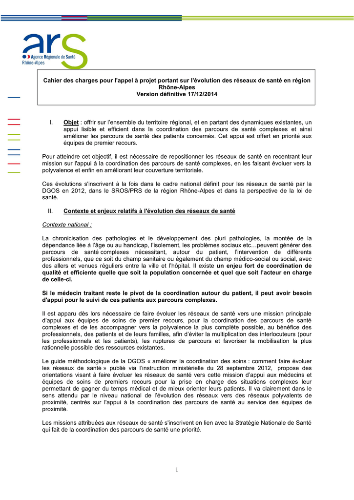 Cahier des charges pour l'appel à projet portant sur l'évolution des réseaux de santé en région