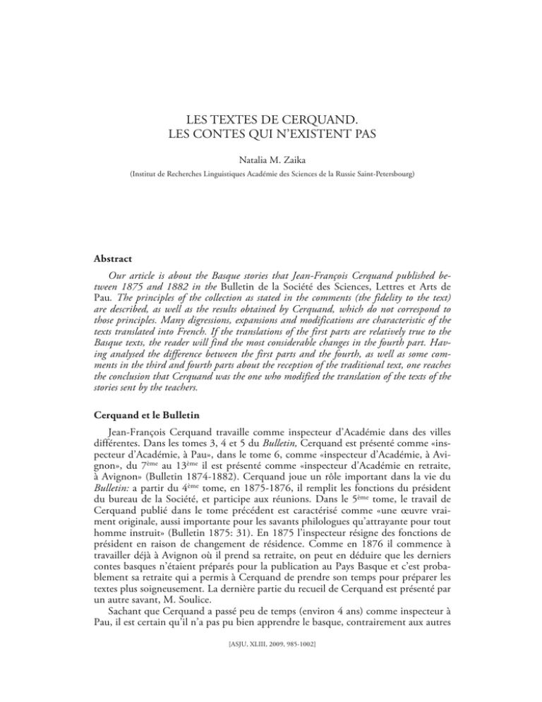 LES TEXTES DE CERQUAND. LES CONTES QUI N’EXISTENT PAS Natalia M. Zaika (Institut de Recherches Linguistiques Académie des Sciences de la Russie Saint-Petersbourg) Abstract Our article is about the Basque stories that Jean-François Cerquand published between 1875 and 1882 in the Bulletin de la Société des Sciences, Lettres et Arts de Pau. The principles of the collection as stated in the comments (the fidelity to the text) are described, as well as the results obtained by Cerquand, which do not correspond to those principles. Many digressions, expansions and modifications are characteristic of the texts translated into French. If the translations of the first parts are relatively true to the Basque texts, the reader will find the most considerable changes in the fourth part. Having analysed the difference between the first parts and the fourth, as well as some comments in the third and fourth parts about the reception of the traditional text, one reaches the conclusion that Cerquand was the one who modified the translation of the texts of the stories sent by the teachers. Cerquand et le Bulletin Jean-François Cerquand travaille comme inspecteur d’Académie dans des villes différentes. Dans les tomes 3, 4 et 5 du Bulletin, Cerquand est présenté comme «inspecteur d’Académie, à Pau», dans le tome 6, comme «inspecteur d’Académie, à Avignon», du 7ème au 13ème il est présenté comme «inspecteur d’Académie en retraite, à Avignon» (Bulletin 1874-1882). Cerquand joue un rôle important dans la vie du Bulletin: a partir du 4ème tome, en 1875-1876, il remplit les fonctions du président du bureau de la Société, et participe aux réunions. Dans le 5ème tome, le travail de Cerquand publié dans le tome précédent est caractérisé comme «une œuvre vraiment originale, aussi importante pour les savants philologues qu’attrayante pour tout homme instruit» (Bulletin 1875: 31). En 1875 l’inspecteur résigne des fonctions de président en raison de changement de résidence. Comme en 1876 il commence à travailler déjà à Avignon où il prend sa retraite, on peut en déduire que les derniers contes basques n’étaient préparés pour la publication au Pays Basque et c’est probablement sa retraite qui a permis à Cerquand de prendre son temps pour préparer les textes plus soigneusement. La dernière partie du recueil de Cerquand est présenté par un autre savant, M. Soulice. Sachant que Cerquand a passé peu de temps (environ 4 ans) comme inspecteur à Pau, il est certain qu’il n’a pas pu bien apprendre le basque, contrairement aux autres [ASJU, XLIII, 2009, 985-1002] 986 NATALIA M. ZAIKA folkloristes basques (Barandiaran et Azkue, Barbier étaient bascophones et Webster a appris le basque assez bien pour comprendre les contes, probablement, à l’aide de Vinson). Il est remarquable que l’un des recueils les plus connus et qu’on croit les plus authentiques a été fait par une personne qui ne parlait pas basque. Contrairement aux autres folkloristes, pour Cerquand, qui était plutôt fonctionnaire, les contes basques n’étaient qu’une œuvre publiée dans une revue locale. Les buts Les principes de la collecte et la publication Les folkloristes basques et étrangers envisageaient depuis longtemps le problème du fonctionnement et de la collecte des textes des contes. Selon Cerquand, le folkloriste ne doit rien changer dans les contes recueillis. Cette approche nous semble extrêmement honnête, bien qu’elle ne soit pas toujours suivie par les folkloristes. Mais comment ce principe s’applique-t-il dans les publications de Cerquand? Les textes de Cerquand avec leur traduction ont été recueillis par les instituteurs de Soule et de Basse-Navarre que l’inspecteur a choisi pour leurs connaissances de la langue basque, qu’ils parlaient et entendaient «sans finesse, comme leurs voisins» (Cerquand 1874: 237). Dans la collecte des contes, beaucoup dépend des personnes qui ont recueilli les textes. Cependant, il existe aussi des principes communs, selon lesquels étaient supposés de travailler les assistants de Cerquand («…j’ai recommandé à mes collaborateurs de transcrire les récits avec la fidélité qu’ils mettraient à reproduire une réponse du catéchisme ou une définition de mathématiques et de conserver précisément les idées, les faits, les mots qui leurs paraîtraient le plus étranges. Je leur ai défendu de rien ajouter, de changer rien sous prétexte d’élégance et de clarté […] En ce qui concerne la traduction, je demandais qu’elle fût plus littérale que grammaticale, c’est-à-dire, plus fidèle qu’élégante»; Cerquand 1874: 236). Cerquand voit son travail comme le premier abord aux contes basques qui mérite d’être poursuivi, tout en espérant qu’il sera complété «dans le Labourd, la Basse-Navarre et dans les provinces basques de l’Espagne» (Cerquand 1874: 244). Il y a une grande différence entre les recueils de Cerquand et ceux des autres folkloristes célèbres basques: Webster, Azkue et Barbier ont été publié leurs recueils en tant que livres (bien que certains contes de Barbier et Azkue aient paru plus tôt), tandis que celui de Cerquand a paru dans quelques numéros d’un bulletin. Le folkloriste en donne des raisons: «J’aurais voulu réviser toutes les traductions avec un basquisant habile, mais il m’a semblé qu’avant tout il fallait constater avec les premiers résultats obtenus, la possibilité d’en obtenir davantage» (Cerquand 1874: 237). Cerquand nous laisse peu de remarques sur sa méthode de collecte des contes. Pourtant, on peut en savoir quelque chose, en analysant les revues Bulletin de la société Sciences, lettres et arts de Pau où les résultats de sa collecte ont paru. Cerquand fait publier les textes du folklore basque en quatre parties: tome 4, tome 5, tome 6 et après, six ans plus tard, tome 11. Dans les trois premiers tomes, les textes sont plus c
