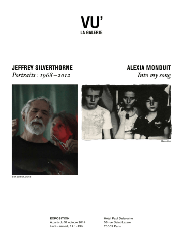 LA GALERIE JEFFREY SILVERTHORNE Portraits : 1968 – 2012 ALEXIA MONDUIT Into my song Sans titre Self portrait, 2012 EXPOSITION À partir du 31 octobre 2014 lundi – samedi, 14 h –19 h Hôtel Paul Delaroche 58 rue Saint-Lazare 75009 Paris Galerie VU’ Jeffrey Silverthorne & Alexia Monduit 2 Jeffrey Silverthorne & Alexia Monduit Jeffrey Silverthorne Présentée dans le cadre du Mois de la Photo à Paris 2014, cette exposition propose la rencontre de deux écritures photographiques singulières : celle de Jeffrey Silverthorne, artiste majeur de la scène photographique contemporaine auquel le Musée Niépce consacre, du 18 octobre 2014 au 18 janvier 2015, sa première rétrospective européenne, et celle d'une jeune photographe, Alexia Monduit, que la Galerie VU’ a décidé de révéler et d'accompagner. Ainsi, la Galerie VU’ présente une sélection de tirages de Jeffrey Silverthorne, dont l’œuvre explore depuis plus de quarante ans les questions du sexe et de la mort, comme celles de la transgression, de la transcendance et de la métamorphose tout en expérimentant le champ des possibles du médium photographique. Cette sélection vient dialoguer avec l’univers emprunt d’étrangeté d’Alexia Monduit. Sur le fil du regard, son travail oscille entre instinct et introspection. Elle construit souvent ses images sur un mode séquentiel, qui, s’il n’est pas intrinsèquement narratif, palpite, sous couvert d’une douce violence, d’un rythme singulier. « Entre mes mains, l'appareil photo agit comme le sismographe. Enregistreur d'un tremblement, il donne à voir une onde qui traverse mon regard depuis l'enfance. » Cette exposition donne à voir la croisée des regards de deux artistes qui, s’ils ont des expressions très différentes, se rejoignent en ce qu’ils envisagent la photographie comme une prise de risque, avec l’intensité d’une expérience aussi bien physique, psychique qu’émotionnelle. Waitress, 2004 Alexia Monduit Sans titre Galerie VU’ Jeffrey Silverthorne & Alexia Monduit 3 Jeffrey Silverthorne Portraits : 1968 —2012 High Lake, 1998 « Les photos des gens qui participent à la conception de leur image sont au cœur de mon travail. Un portrait implique une présentation et le choix du lieu et du moment. J’ignore quelle part du modèle est visible. Je crois que l’image obtenue correspond plutôt à ce à quoi je tente de répondre. Regarder et enregistrer, ce sont des moyens de mesurer et d’évaluer ce qui est important et ce qui ne l’est pas. Les stéréotypes et les normes sociales, ce à quoi ressemble une personne, ce à quoi peut ressembler une image — tout cela, ce sont des considérations qui influencent la prise de vue. Mes autoportraits sont un prolongement de ce travail, l’artiste au travail, l’artiste en tant que modèle ; ils sont les outils de base qui permettent de réfléchir aux relations entre individualité et communauté, aux frontières de ce qui est et de ce qui pourrait être. » Jeffrey Silverthorne At the river, 1998 Galerie VU’ 4 Jeffrey Silverthorne & Alexia Monduit « Ames sensibles s'abstenir. Les photos de Jeffrey Silverthorne peuvent vous révulser, vous intriguer, vous emporter, elles ne vous laisseront jamais indifférent. » Claire Guillot Le Monde « Actif depuis la fin des années 1660, Jeffrey Silverthorne multiplie les séries sur des sujets hors-normes : un abattoir, une morgue, des bordels ou une communauté de travestis et de transsexuels. Il partage ainsi l’attirance des autres photographes américains de sa génération pour les sujets extrêmes [...] Il transgresse volontiers les limites du visible pour mieux nous faire sentir la vie. » Étienne Hatt Art Press « Robert Frank a dit des photos de Jeffrey Silverthorne : Ce n’est pas de l’art – quelle horreur si c’en était – mais il se peut que ses photos me [nous ?] rappellent à quel point c’est merveilleux d’être en vie. De fait, cet Américain méconnu s’est surtout singularisé pour ses reportages à la morgue de New York, suite au défi lancée par Diane Arbus, qui estimait qu’il n’y avait rien qui puisse y être photographié. Ce fut la série Morgue Work (1972-1974), « scandaleuse » tant les morts y paraissent vivants. A découvrir l’hommage bien venu que la Galerie VU’ lui rend à Arles [en 2009], on testera que le cousinage avec le style d’Arbus est encore plus flagrant dans les nombreux portraits réalisés de 1971 à 2006 : putes, travestis, transsexuels, taulards, immigrants clandestins. Tous les figurants d’une Amérique monstre comme l’entendait Tod Browning dans sont définitif Freaks : humains, si humains. » Gérard Lefort Libération « Ni divertissement ni gratuité spectaculaire n’entachent les images de Silverthorne, qui ne s’effacent pas de la mémoire. Il se situe dans le champ de l’autobiographie photographique et sa pratique s’appuie sur une connaissance impressionnante et totalement transcendée de l’Histoire de l’Art. [...] Sa vision me semble proche tant des textes de Georges Bataille, que de l’esthétique baudelairienne de la « beauté interlope ». La beauté n’est plus une idole muette, inatteignable, indéchiffrable, mais le fruit vénéneux de l’ennui, de la désespérance, le produit d’un écart et d’une vacuité. La photographie, par sa nature singulière, offre une possibilité de prise sur un monde sans qualités, d’émergence d’une beauté dissimulée dans les choses triviales. Elle sait débusquer l’étrange, l’exotique et le sacré dans le banal, donner à l’ennui et à la déréliction une grandeur foudroyante. » Anne Biroleau Conservateur en chef au département des Estampes et de la photographie de la BnF Haiden reading, Tucson, 2013 Galerie VU’ Jeffrey Silverthorne & Alexia Monduit 5 Jeffrey Silverthorne Biographie Américain. Né en 1946 à Honolulu. Vit et travaille à Cranston, Rhode Island. Son travail, récompensé en