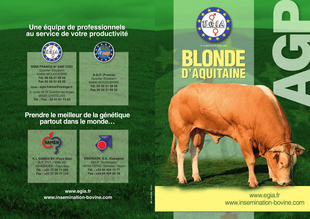 Une équipe de professionnels au service de votre productivité EGIA FRANCE N° EMP C002 Quartier Elizaberri 64990 MOUGUERRE Tél. 05 59 31 58 58 Fax 05 59 31 69 20 Email : [email protected] 6, route de St Quentin les Anges 49520 CHATELAIS Tél. / Fax : 02 41 61 73 65 A.G.P. (France) Quartier Elizaberri 64990 MOUGUERRE Tél. 05 59 31 58 58 Fax 05 59 31 69 20 Prendre le meilleur de la génétique partout dans le monde… ABEREKIN, S.A. (Espagne) 600 P. Tecnológico 48160 DERIO (Bizkaia) - Spain Tél. : +34 94 454 15 77 Fax : +34 94 454 08 78 www.egia.fr www.insemination-bovine.com IMP. 3 VALLÉES • Bardos K.I. SAMEN BV (Pays-Bas) B.P. 7171 • 5980 AD GRASHOEK - Pays-Bas Tél. : +31 77 30 71 592 Fax : +31 77 30 77 133 Mesdames, Messieurs, Lʼéquipe dʼAGP / EGIA vous invite à découvrir le nouveau catalogue Blonde dʼAquitaine dans lequel vous est présenté le panel des taureaux que nous mettons à votre disposition. Vous y trouverez des taureaux convenant pour : ● lʼélevage de femelles de renouvellement, ● lʼélevage de veaux sous la mère, ● lʼélevage de veaux destinés à lʼexportation et pour faire du taurillon. Le choix de ces taureaux est issu dʼune recherche génétique pointue. Toutes les semences sont agréées européenne. La diversité des souches vous permettra aussi dʼéviter les inconvénients de la consanguinité. Cette méthode de sélection des reproducteurs a pour but de faire évoluer le niveau des performances de vos élevages. Les index Iboval combinés aux indications observées sur le terrain traduisent un testage fiable puisque réalisé dans de nombreux élevages. “Bikini” Vache fille de herin” ac “V de et sa fille dart Bi l ce Élevage Mar A C N BA 0 43 64 Guide d’utilisation FACILITÉ DE VÊLAGE ÉPAISSEUR MUSCULAIRE VALEX PAGE 9 ULLOTI PAGE 6 BIDABE PAGE 17 UNIFER PAGE 3 CALIFORNIA ULTRA TEXAN UMPIRE PAGE 10 VACHERIN PAGE 11 CALIFORNIA PAGE 2 DÉVELOPPEMENT SQUELETTIQUE PAGE 4 PAGE 10 CAPACITÉ LAITIÈRE PAGE 1 PIERRE, VD PAGE 7 BOUNTY PAGE 13 TALABOUNGA PAGE 5 TABALOUNGA TEXAN TEXAN PAGE 8 UNIFER PAGE 5 ULTRA PAGE 2 TRIPLE PLUS (Épaisseur musculaire, développement squelettique, Capacité laitière) VACHERIN PAGE 1 UNIFER PAGE 3 TEXAN UMPIRE Fils de “Cacao e Dom ” in Gaec A ique Sallabe rry rh anta 64130 MONC bia AYOLL E Élevag PAGE 1 VACHERIN HUSSARD Vache Fille de “Flic” et sa fille de “C alifornia” Élevage Miche l Dolhagaray 64480 LARRES SORE PAGE 2 PAGE 4 PAGE 2 Fille de “Ulloti” Élevage Françoise Labandibar 64990 VILLEFRANQUE PAGE 3 PAGE 11 Fille de “California” Élevage David Larreguy 64240 BRISCOUS Vache fille de “Talaboung Élevage Phi lippe Alzumar a” et sa fille de “Sombr ero” - 40390 STE MARIE DE G OSS E VACHERIN Numéro : FR 6503504517 Code d’I.A : A-42-027 Naisseur : Marc LAGARRUE - 65700 MADIRAN Date de naissance : 2 novembre 2004 Éleveur : Thierry Ticoulet 64150 VIELLESEGURE VACHERIN 6503504517 SATURNIN Monte 6503041048 Naturelle IFFORT 6593003559 MAJESTEE 65960020050 MIXTE ÉLEVAGE STARLETTE 6503071324 ORIENT 6464045317 LIBERTY 6595002856 GUIDE D'UTILISATION Facilité de naissance Vêlage Normal Développement squelettique ++ Épaisseur musculaire ++ Capacité Laitière =+ Indice de croissance Développement musculaire Développement squelettique indice de sevrage 80 90 100 110 120 130 Index IBOVAL / Qualité de race : 41/50 COMMENTAIRE PRODUCTION VACHERIN a un très bon équilibre entre développement squelettique et développement musculaire. Sa couleur est froment. Il est rustique avec des onglons courts et très solides. Très bon tempérament transmis à ses produits, il a obtenu le 3ème PRIX au salon de Paris en 2006 et le prix bœuf blond au Space à Rennes. Les filles de VACHERIN expriment une importante rusticité. Elles sont élégantes avec une tête fine. Petit cornage blond. Leurs lignes de dos et les aplombs avant sont parfaitement droits et les jarrets sont excellents. Le muscle du dos est puissant à 6 mois et est maintenu à 2 ans ainsi que la largeur de cuisse. La croissance est constante et l’ampleur du bassin remarquable. Les mâles sont vendus en broutards dès l’âge de 4 mois grâce à leur croissance importante. VACHERIN est un taureau améliorateur d'excellence. Une de ses filles ESQUIRE a obtenu le 1er PRIX au concours national en 2010. Élevage Thierry TICOULET - 64150 VIELLESEGURE Présentation du “Prix de Famille” de Vacherin au Concours National 2010 en Vendée 1 TEXAN Numéro : FR 3202763902 Code d’I.A : 82094 Date de naissance : 5 août 2002 Naisseur : Jean-Louis DUBOSC 32400 VIELLA Éleveur : Spekenrink - 7443 SL NIJVERDAL - PAYS-BAS MIXTE ÉLEVAGE TEXAN 3202763902 OGRE 4098012305 GOLDORAK 4091011305 GENETTE 4091010477 ICELLE 3293132822 GAMBETTA 3191091201 NARCISSE 3277130431 GUIDE D'UTILISATION COMMENTAIRE Vêlage Facile à normal Épaisseur musculaire + Développement squelettique Capacité Laitière PRODUCTION + ++ La facilité de naissance des produits de TEXAN est un de ses points forts. Père à femelles de très hautes qualités, TEXAN produit des génisses exceptionnelles : elles sont élégantes, puissantes, longues et laitières avec un développement musculaire affirmé et un éclatement au bassin remarquable. Elles affirment leur supériorité morphologique en avançant dans l’âge. TEXAN est fortement conseillé pour le renouvellement. TEXAN, digne héritier de lignées prestigieuses, s’est illustré sur tous les concours hollandais. C’est un taureau très harmonieux, fin de cuir, cumulant à la fois le développement squelettique et musculaire. “CHAMPIONNE” Élevage Yvonne PECASTAING 40390 ST MARTIN DE SEIGNANX Élevage Philippe ALSUMARD 40390 STE MARIE DE GOSSE 2 UNIFER Numéro : NL 000355001916 Code d’I.A : 36571 Date de naissance : 6 avril 2003 Naisseur : Neerinck - Hendriks 6661 NL EST ELST PAYS-BAS MIXTE ÉLEVAGE UNIFER 000355001916 ORTENSIA 3298038261 LION 2895100822 JACINTHE 4694132251 CAPUCINE 3287131983