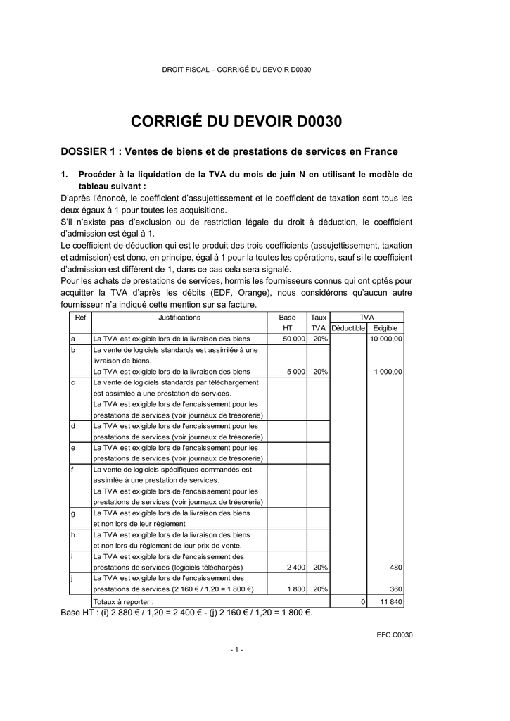 DROIT FISCAL – CORRIGÉ DU DEVOIR D0030 CORRIGÉ DU DEVOIR D0030 DOSSIER 1 : Ventes de biens et de prestations de services en France 1. Procéder à la liquidation de la TVA du mois de juin N en utilisant le modèle de tableau suivant : D’après l’énoncé, le coefficient d’assujettissement et le coefficient de taxation sont tous les deux égaux à 1 pour toutes les acquisitions. S’il n’existe pas d’exclusion ou de restriction légale du droit à déduction, le coefficient d’admission est égal à 1. Le coefficient de déduction qui est le produit des trois coefficients (assujettissement, taxation et admission) est donc, en principe, égal à 1 pour la toutes les opérations, sauf si le coefficient d’admission est différent de 1, dans ce cas cela sera signalé. Pour les achats de prestations de services, hormis les fournisseurs connus qui ont optés pour acquitter la TVA d’après les débits (EDF, Orange), nous considérons qu’aucun autre fournisseur n’a indiqué cette mention sur sa facture. Réf Justifications Base a La TVA est exigible lors de la livraison des biens b La vente de logiciels standards est assimilée à une Taux TVA HT TVA Déductible 50 000 20% 10 000,00 Exigible 5 000 20% 1 000,00 2 400 20% 480 1 800 20% 360 livraison de biens. La TVA est exigible lors de la livraison des biens c La vente de logiciels standards par téléchargement est assimilée à une prestation de services. La TVA est exigible lors de l'encaissement pour les prestations de services (voir journaux de trésorerie) d La TVA est exigible lors de l'encaissement pour les prestations de services (voir journaux de trésorerie) e La TVA est exigible lors de l'encaissement pour les prestations de services (voir journaux de trésorerie) f La vente de logiciels spécifiques commandés est assimilée à une prestation de services. La TVA est exigible lors de l'encaissement pour les prestations de services (voir journaux de trésorerie) g La TVA est exigible lors de la livraison des biens et non lors de leur règlement h La TVA est exigible lors de la livraison des biens et non lors du règlement de leur prix de vente. i La TVA est exigible lors de l'encaissement des prestations de services (logiciels téléchargés) j La TVA est exigible lors de l'encaissement des prestations de services (2 160 € / 1,20 = 1 800 €) Totaux à reporter : 0 11 840 Base HT : (i) 2 880 € / 1,20 = 2 400 € - (j) 2 160 € / 1,20 = 1 800 €. EFC C0030 -1- DROIT FISCAL – CORRIGÉ DU DEVOIR D0030 Réf Justifications Base Taux HT TVA TVA Déductible Reports k 9 600 20% 1 920 12 000 20% 2400 3 600 20% 720 10 20% 2 10 20% 2 40 000 20% 8 000 10 000 20% 2 000 4 000 20% 800 1 000 20% 200 La TVA est exigible lors de l'encaissement pour les prestations de services (logiciel spécifique). m 11 840 La TVA est exigible lors de l'encaissement pour les prestations de services (11 520 € / 1,20 = 9 600 €) l Exigible La TVA est exigible lors de la livraison pour les biens et non lors de l'encaissement des avances. n La TVA est exigible lors de l'encaissement des avances pour les prestations de services. o La TVA est exigible lors de la livraison pour les biens. La remise à l'escompte de l'effet de commerce correspondant est sans rapport avec l'exigibilité de la TVA. La TVA est déductible lors du paiement des prestations de services (commissions) Les intérêts bancaires sont exonérés de TVA sans possibilité d'option. p La TVA est exigible lors de l'encaissement pour les prestations de services. La remise à l'escompte de l'effet de commerce correspondant est une opération de financement sans rapport avec l'exigibilité de la TVA. La TVA sera exigible à la date d'échéance de l'effet le 31 juillet si l'effet est payé par le client. La TVA est déductible lors du paiement des prestations de services (commissions) Les intérêts bancaires sont exonérés de TVA sans possibilité d'option. q La TVA est déductible lors de la livraison (facturée) des biens. r La TVA est déductible lors de la livraison (facturée) des biens (logiciels standards) s La TVA est déductible lors de la livraison (facturée) des biens. t La TVA est déductible sur les débits pour EDF (lors de la facture) Totaux à reporter : 11 004 16 880 Base HT: (k) 11 520 € / 1,20 = 9 600 € - (l) 14 400 € / 1,20 = 12 000 € - (n) 4 320 € / 1,20 = 3 600 €. EFC C0030 -2- DROIT FISCAL – CORRIGÉ DU DEVOIR D0030 Réf Justifications Base HT Taux Reports u 11 004 Exigible 16 880 La TVA est déductible sur les débits pour Orange (lors de la facture) v TVA TVA Déductible 3 000 20% 600 30 000 20% 6 000 La TVA n'est pas, en principe, déductible sur l'achat de véhicules de tourisme. Le coefficient d'admission est égal à 0. Le coefficient de déduction est donc aussi égal à 0. w Il n'existe pas d'exclusion ou de restriction du droit à déduction pour les camionnettes. La TVA est déductible lors de la livraison (facturée) des biens. x La TVA est déductible lors du paiement pour les prestations de services (facturées). Voir journaux de trésorerie. y La TVA n'est pas déductible sur le transport de personnes. Le coefficient d'admission est égal à 0. z La TVA n'est pas déductible sur le transport de personnes. Le coefficient d'admission est égal à 0. aa La TVA sur les frais d'hôtel des salariés n'est pas déductible. Le coefficient d'admission est égal à 0. bb Il n'existe pas d'exclusion ou de restriction du droit à déduction pour les frais d'hôtel des clients. La TVA est déductible lors du paiement des prestations de services (facturées). Voir journaux de trésorerie. cc Il n'existe pas d'exclusion ou de restriction du droit à déduction pour les frais de restaurant engagés pour les besoins d'une opération imposable ouvrant droit à déduction (activité de l'entreprise). La TVA est déductible lors du paiement des prestations de services (facturées). Voir journaux de trésorerie. dd même justification que "cc" Tot