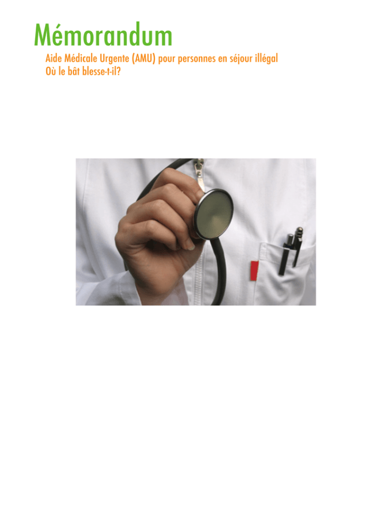 Mémorandum Aide Médicale Urgente (AMU) pour personnes en séjour illégal Où le bât blesse-t-il? 2 Table des matières Avant-propos.......................................................................................................................................................................................... 4 Qu’est-ce que la procédure d’Aide Médicale Urgente (AMU)?................................................................................................................... 6 OBSTACLE 1: Manque d’informations et de communication...................................................................................................................... 7 OBSTACLE 2: Seuils d’accueil dans les CPAS............................................................................................................................................. 9 OBSTACLE 3: Pas d’accès direct aux soins médicaux................................................................................................................................10 3.1. Inaccessibilité de la première consultation d’un prestataire de soins......................................................................................10 3.2. Accès difficile aux urgences des hôpitaux..............................................................................................................................10 3.3. Pleins feux sur deux des recommandations visant à améliorer structurellement l’accès aux soins médicaux...........................11 OBSTACLE 4: Les sans-abris face à la procédure d’AMU..........................................................................................................................14 CONCLUSION GÉNÉRALE.........................................................................................................................................................................15 ANNEXE I: Proposition de brochure informative adaptée au groupe-cible.................................................................................................. 1 ANNEXE II: Chiffres relatifs à l’AMU à Bruxelles....................................................................................................................................... 5 Editeur responsable: Karen De Clercq, Rue Marcq 25, 1000 Bruxelles Mémorandum Aide Médicale Urgente (AMU) pour personnes en séjour illégal Où le bât blesse-t-il? Avril 2012 3 4 Avant-propos La santé considérée comme un état global de bien-être physique, mental et social est un droit fondamental, qui doit du même fait être garanti à tous. Or, nous constatons que si ce droit existe dans notre législation, certains groupes y ont en réalité très difficilement accès. De nombreuses études dénonçant les inégalités sociales dans le domaine de la santé démontrent que plus la position socioéconomique d’un individu est basse, plus il a de chances d’être en mauvaise santé. Cette inégalité sociale est essentiellement due à une accessibilité des services caractérisée par 5 types de seuils: l’inégalité physique, psychologique, administrative, financière et informative entre les diverses classes socioéconomiques. Ceci est certainement le cas pour les personnes en séjour illégal qui se trouvent souvent au plus bas de l’échelle sociale. L’ « Annuaire 2011 pauvreté et exclusion sociale» d’OASES constate que 50% des personnes en séjour illégal ne connaissent pas la procédure de l’Aide Médicale Urgente (AMU)1. En Belgique, cette procédure leur garantit pourtant le droit aux soins de santé. Ce pourcentage est une première indication que l’accès aux soins de santé est insuffisamment garanti à ce groupe de personnes. De plus, celles qui connaissent ce droit ne parviennent pas toujours à le faire valoir. Dans ce mémorandum, le Groupe de Travail AMU2 décrit certains obstacles à Bruxelles et formule des recommandations concrètes afin de favoriser pour ce groupe l’accès aux soins de santé. Nous renvoyons là où c’est possible à de bonnes pratiques. Les quatre grands obstacles sont les informations et la communication fragmentaires (obstacle 1), les seuils d’accueil dans les CPAS bruxellois (obstacle 2), l’absence d’accès direct aux soins médicaux (obstacle 3) et la procédure difficilement accessible aux personnes en séjour illégal (obstacle 4). Nous attirons également l’attention sur l’accès difficile aux services d’urgence et sur la problématique de la première consultation. La conclusion générale explique de quelle façon les diverses recommandations forment un ensemble cohérent et formule une solution pour les obstacles signalés. L’annexe 1 propose quant à elle une brochure d’information pour les CPAS, alors que l’annexe 2 contient des chiffres relatifs à la procédure d’AMU. Les chiffres de 2009 fournis par le SPP Intégration Sociale, également en annexe, révèlent entre autres qu’un certain nombre de CPAS traitent plus de demandes d’aide de personnes en séjour illégal que d’autres CPAS. Le groupe de travail qui a rédigé le présent mémorandum a constaté que l’application de cette procédure dans la Région de Bruxelles-Capitale diffère considérablement selon la commune dans laquelle le demandeur d’aide se présente. Les obstacles et les recommandations s’adressent donc plus particulièrement à certains CPAS qu’à d’autres. Le groupe de travail constate par ailleurs qu’un bon bout de chemin a déjà été parcouru; certaines pratiques des CPAS bruxellois méritent ainsi d’être encouragées. Force est pourtant de constater que plusieurs anciens obstacles sont encore d’actualité. Le groupe de travail espère que les 19 CPAS bruxellois soumettront individuellement, mais aussi conjointement à travers la Conférence des présidents et des secrétaires des CPAS bruxellois, leur méthode de travail à une analyse critique et examiner