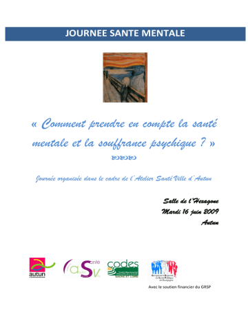 JOURNEE SANTE MENTALE « Comment prendre en compte la santé mentale et la souffrance psychique ? » Journée organisée dans le cadre de l’Atelier Santé Ville d’Autun Salle de l’Hexagone Mardi 16 juin 2009 Autun Avec le soutien financier du GRSP Programme de la journée 09h00 Accueil autour d’un café par les membres du groupe de travail « santé mentale » de l’ASV. 09h30 Ouverture de la journée par Mr REBEYROTTE (Maire d’AUTUN) 10h00-11h Conférence donnée par Christis DEMETRIADES, psychologue clinicien et maitre de conférence (Université de Lyon II) sur le thème : « précarité, souffrance psychique et exclusion, enjeux de conceptualisation, enjeux d’intervention ». 11h00-12h intervention de Jean Jacques TABARY, psychiatre, directeur de la structure : « carrefour santé mentale précarité » (Bourg en Bresse) et de Jacqueline Michelin, Assistante sociale (centre psychothérapique de l’Ain) sur le thème : «une expérience de travail en réseau « aléatoire » dans la réinsertion sociale et dans la souffrance liée à la précarité » 12h30-13h30 Repas (préparé par Autun Morvan Insertion) 13h45-15h00 Ateliers Atelier 1 : Comment prendre en compte les conduites addictives ? Animé par le docteur Prudhomme. Rapporteur : Claire De Ganay Atelier 2 : Comment répondre à l’urgence en matière de santé mentale ? Animé par Marc Vignal psychosociologue. Rapporteur : Pierre-Jacques Mathieu Atelier 3 : Comment prendre en charge la santé mentale des jeunes ? Animé par André Reboux (psychothérapeute). Rapporteur : Thida Phan Atelier 4 : Comment prendre en compte la santé mentale des personnes âgées ? Animé par Mme Leïla El Asri psychologue au réseau gérontologique. Rapporteur : Frédéric Langlois 15h00-15h30 Pause 15h30-16h45 Restitution des ateliers par les animateurs et échange avec la salle 16h45 Intervention de Jean François NICOLAS (médecin et vice-président du GRSP) 17h00 Clôture de la journée Monique GATIER Adjointe au Maire chargée des solidarités, du logement, de la famille et de la politique de la ville d’Autun 1 Actes de la journée « Santé mentale » INTRODUCTION Mme Monique Gatier, adjointe chargée des solidarités, du logement, de la famille et de la politique de la ville d’Autun : C’est à moi que reviens l’immense plaisir de vous accueillir tous, nous ne sommes pas tous arrivés puisque Pierre Jacques Mathieu me disait que nous sommes 120 ou 130 inscrits à cette journée. Nous allons commencer quand même pour ne pas prendre trop de retard. Je vous accueille au nom de Mr le Maire, Mr Rebeyrotte qui ne peut pas être là ce matin, car il a un programme très chargé, je pense qu’il nous rejoindra à midi ou plus tard en fin de journée. Pour commencer je voudrais vous redire un petit mot sur le cadre de l’ASV. L’Atelier Santé Ville est un dispositif qui a été créé par une circulaire IGS/DIV du 13 juin 2001. L’objectif est de réduire les inégalités territoriales de santé. Il y a actuellement 150, 160 Ateliers Santé Ville en France et 5,6 en Bourgogne. D’une manière générale les ASV ciblent leurs actions sur les quartiers prioritaires dans le cadre du CUCS (contrat urbain de cohésion social) mais il est bien évident que l’ASV étend ses actions au-delà de ces quartiers On verra cet après midi que la volonté locale est d’étendre cet ASV à une dimension qui serait le pays. Les personnes les plus vulnérables se trouvent sur ce territoire. A Autun la création de l’ASV a été décidée en septembre 2007 suite au diagnostic global qui a été réalisé dans le cadre du CUCS. L’Atelier Santé Ville fait partie des préconisations concernant le volet santé afin d’assurer une animation, une coordination globale sur le territoire. Notre ASV d’Autun a ceci de spécifique que c’est sans doute le plus petit de France. Je vous rappelle aussi que l’association « le Pont » a porté le diagnostic par l’intermédiaire d’un consultant extérieur qui est juste à côté de moi : Marc Vignal, psychosociologue ; qui a non seulement réalisé le diagnostic mais qui a également assuré l’accompagnement méthodologique au développement de cet atelier. Il s’agissait de réaliser un état des lieux de l’offre, des besoins, des demandes mais aussi des priorités en matière de santé. Etat des lieux des quartiers prioritaires mais aussi de la ville. Au-delà de cet état des lieux il s’agissait d’impulser une démarche participative et consultative locale, cette démarche a été menée tant au niveau des acteurs de santé que des habitants des quartiers. Le principe directeur se définissant donc comme une approche de santé globale. Je vous rappelle la définition de l’OMS « un état de bien être mentale, physique et sociale ». Ce diagnostic a fait émerger un consensus au niveau des problématiques de santé de notre territoire et a permis de commencer de développer l’atelier santé ville en prenant en compte son contexte particulier : un caractère urbain dans un environnement essentiellement rural. Le diagnostic a préconisé de renforcer les ressources locales certes bien limitées, en développant le travail en réseau. Des orientations prioritaires ont été 2 Actes de la journée « Santé mentale » retenues, les thématiques issues du diagnostic a donné lieu à la création de groupes de travail : ces trois groupes sont « promotion de la santé », « accès aux soins » et « santé mentale et souffrance psychosociale ». Ce troisième groupe en mars 2008 a inauguré la première thématique historique de notre ASV, en effet un sentiment d’urgence a été perçu et souligné par Marc dans la phase de diagnostic mené auprès des professionnels, des associations et des bénévoles. A la même période s’est construit une volonté politique et municipale de réagir rapidement et de manière constructive face à l’expression de cette souffrance psychos