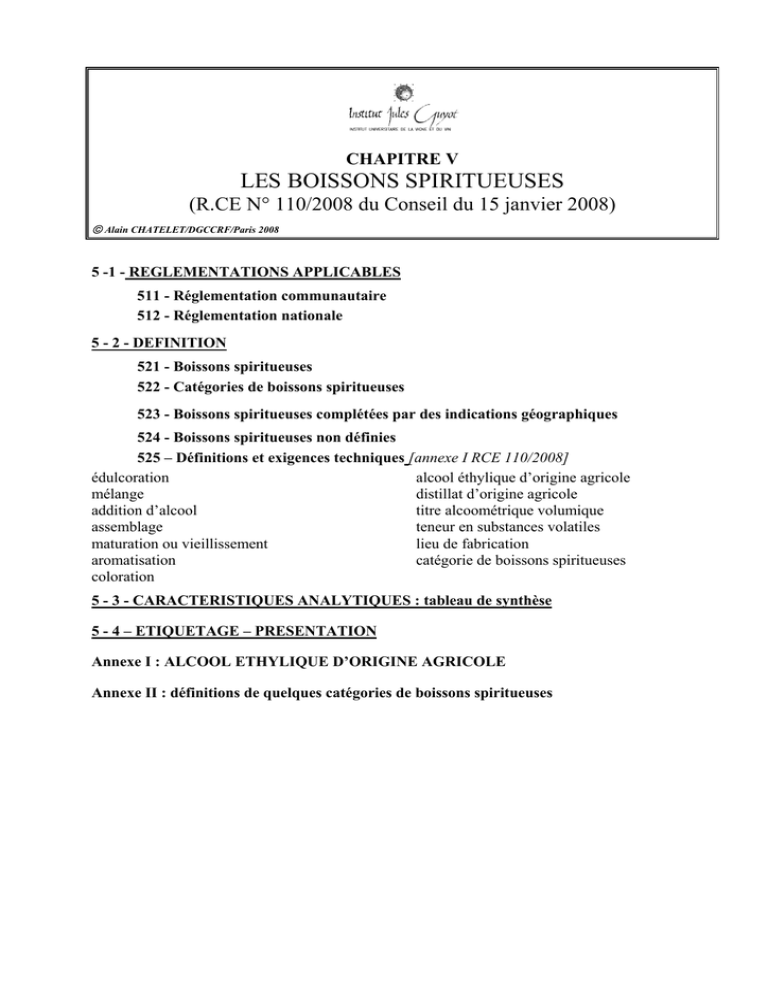 CHAPITRE V LES BOISSONS SPIRITUEUSES (R.CE N° 110/2008 du Conseil du 15 janvier 2008) Alain CHATELET/DGCCRF/Paris 2008 5 -1 - REGLEMENTATIONS APPLICABLES 511 - Réglementation communautaire 512 - Réglementation nationale 5 - 2 - DEFINITION 521 - Boissons spiritueuses 522 - Catégories de boissons spiritueuses 523 - Boissons spiritueuses complétées par des indications géographiques 524 - Boissons spiritueuses non définies 525 – Définitions et exigences techniques [annexe I RCE 110/2008] édulcoration alcool éthylique d’origine agricole mélange distillat d’origine agricole addition d’alcool titre alcoométrique volumique assemblage teneur en substances volatiles maturation ou vieillissement lieu de fabrication aromatisation catégorie de boissons spiritueuses coloration 5 - 3 - CARACTERISTIQUES ANALYTIQUES : tableau de synthèse 5 - 4 – ETIQUETAGE – PRESENTATION Annexe I : ALCOOL ETHYLIQUE D’ORIGINE AGRICOLE Annexe II : définitions de quelques catégories de boissons spiritueuses DNO-08_ch5_spiritueux REGLEMENTATION VITI-VINICOLE – DNO2008 – IUVV Dijon mise à jour : 07/06/08 Chapitre V : LES BOISSONS SPIRITUEUSES 5 - 1 - REGLEMENTATIONS APPLICABLES 511 - Réglementation communautaire Règlement (CE) n° 110/2008 du Parlement européen et du Conseil du 15 janvier 2008 concernant la définition, la désignation, la présentation, l'étiquetage et la protection des indications géographiques des boissons spiritueuses et abrogeant le règlement (CEE) n° 1576/89 du Conseil Règlement (CEE) no 2009/92 de la Commission du 20 juillet 1992 déterminant les méthodes d'analyse communautaires de l'alcool éthylique d'origine agricole utilisé pour l'élaboration des boissons spiritueuses, des vins aromatisés, des boissons aromatisées à base de vin et des cocktails aromatisés de produits vitivinicoles. Règlement (CE) no 1267/94 de la Commission du 1er juin 1994 portant application des accords entre l'Union européenne et des pays tiers concernant la reconnaissance mutuelle de certaines boissons spiritueuses (JO L 138 du 2.6.1994, p. 7). Règlement modifié par le règlement (CE) no 1434/97. Règlement (CE) no 2870/2000 de la Commission du 19 décembre 2000 établissant des méthodes d'analyse communautaires de référence applicables dans le secteur des boissons spiritueuses, modifié par le règlement (CE) no 2091/2002. 512 - Réglementation nationale - Décret n° 93-363 du 11 Mars 1993 : intégration dans droit français - Arrêté du 19 Février 1991 relatif au T.A.V. acquis dans étiquetage - Décret du 21 Juillet 1908 : « liqueur de cassis » - Décret N° 88-416 du 22 Avril 1988 sur les rhums et tafias - Décret N° 63-765 du 25 Juillet 1963 : « rhums vieux » - Articles R.641-99 à R.641-107 du code rural sur l’agrément des rhums bénéficiant d’une appellation d’origine contrôlée - Loi du 16 mars 1945 et décret N° 88-1024 du 2 Novembre 1988 : interdiction « absinthe » et similaire 5 - 2 - DEFINITIONS Contrairement aux produits viti-vinicoles définis par le R(CE) 479/2008, les spiritueux, comme les boissons aromatisées à base de vin décrites au chapitre VI, ne relèvent pas de l’organisation commune de marché (OCM) : chacun peut donc les produire librement sans limitation, sous réserve des dispositions régissant leur fabrication du point des vue des Contributions Indirectes. Toutefois deux facteurs doivent être pris en compte avant de se lancer dans ce type de production : - des taxes élevées qui grèvent considérablement leur prix de revient dans la plupart des pays, et handicapent la commercialisation - un marché saturé, dans un contexte (lutte anti-alcoolique, changement des habitudes de consommation) de consommation décroissante. C’est pourquoi toute nouvelle fabrication de ce type doit faire l’objet d’une étude approfondie sur ces points avant de se lancer dans des essais techniques (ingrédients, étiquetage, etc) qui risquent d’être sans avenir économique. 2/13 DNO-08_ch5_spiritueux REGLEMENTATION VITI-VINICOLE – DNO2008 – IUVV Dijon mise à jour : 07/06/08 521 - Boissons spiritueuses Ces produits sont définis au niveau communautaire par le R.CE 110/2008 du 15 janvier 2008 qui a remplacé le RCE1576/89 du 29 Mai 1989, notamment pour tenir compte de l’entrée dans la Communauté européenne de 12 nouveaux pays de l’Est de l’Europe, grands producteurs de ce type de boisson. Il s’agit d’une définition extrêmement large qui permet de regrouper des produits très différents, des eaux-de-vie aux liqueurs à base d’oeufs en passant par les whiskies, les pastis le rhum et la vodka ; ces produits sont définis individuellement, chaque pays ayant voulu protéger très précisément ses productions traditionnelles contre des imitations. On peut dire que le règlement a principalement consisté à établir une collection de définitions plutôt qu’à imposer une définition unique qui ne rend que très imparfaitement compte de la diversité des produits réunis sous le nom de « boissons spiritueuses ». La définition des boissons spiritueuses est très générale : Définition [article 2 RCE 110/2008] : « (…) on entend par « boisson spiritueuse », (...), la boisson alcoolique : a) destiné à la consommation humaine b) dotée de qualités organoleptiques particulières c) ayant un titre alcoométrique minimal de 15 % vol. (sauf liqueur à base d’œuf, ou « advocaat », 14%vol) d) ayant été produite : i. soit directement − par distillation, en présence ou non d’arômes, de produits fermentés naturels et/ou − par macération ou par un traitement similaire de matériels végétaux dans de l’alcool éthylique d’origine agricole (AEOA) et/ou des distillats d’origine agricole et/ou des boissons spiritueuses au sens du présent règlement, et/ou ii. − par addition d’arômes, de sucre ou d’autres produits édulcorants et/ou d’autres produits agricoles à de l’alcool éthyli