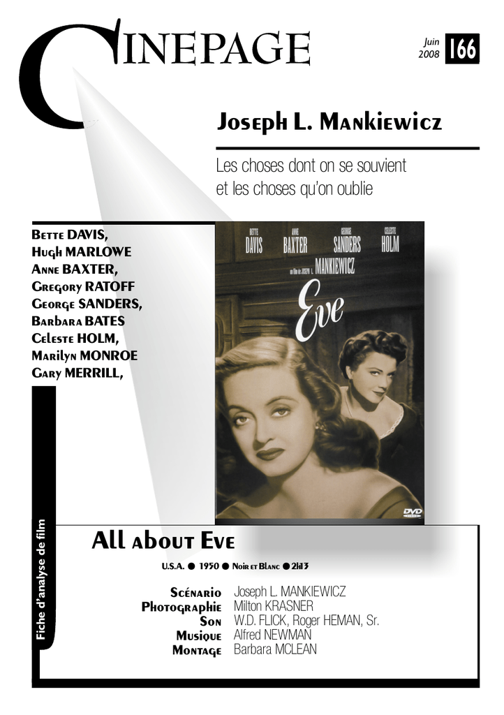 Juin 2008 Joseph L. Mankiewicz Les choses dont on se souvient et les choses qu’on oublie Fiche d’analyse de film Bette DAVIS, Hugh MARLOWE Anne BAXTER, Gregory RATOFF George SANDERS, Barbara BATES Celeste HOLM, Marilyn MONROE Gary MERRILL, All about Eve U.S.A. • 1950 • Noir et Blanc •2h13 Scénario Photographie Son Musique Montage Joseph L. MANKIEWICZ Milton KRASNER W.D. FLICK, Roger HEMAN, Sr. Alfred NEWMAN Barbara MCLEAN 166 L’histoire Histoire Le prix Sarah Siddons, récompensant la meilleure actrice de théâtre de l’année, est sur le point d’être attribué. La petite statuette est posée là, devant toute une assemblée qui connaît déjà le nom de l’heureuse élue, et qui attend poliment que quelqu’un le prononce : Eve Harrington. La raison pour laquelle Eve Harrington se retrouve au centre de toute cette attention, il faut la chercher dans les rapports qu’elle a entretenus avec certains personnages de cette assemblée. Le fait qu’Eve ait rencontré un soir dans sa loge, Margo Channing, une légende de la scène new-yorkaise, n’est peutêtre pas étranger à ce destin. A moins que ce soit la rencontre avec la meilleure amie de Margo, Karen. Comment tout cela a-t-il commencé ? Karen se souvient. Flash-back. Karen est l’épouse dévouée d’un jeune auteur de théâtre à succès, Llyod Richards. La star, Margo Channing, triomphe dans l’une de ses pièces, « La force de l’âge ». Karen a remarqué qu’une jeune femme, dans un imperméable improbable, assiste à toutes les représentations. C’est Eve Harrington. Tous les soirs, elle se cache sous un porche pour voir sortir Margo Channing de sa loge. Emue par tant de dévouement, Karen décide de présenter cette jeune admiratrice à Margo, qui accepte de la recevoir dans sa loge, en compagnie de son amant et metteur en scène Bill Sampson, du mari de Karen, et de sa fidèle assistante, Birdie. Sous le regard attendri de la star, la jeune admiratrice raconte son passé tragique, puis sa rencontre miraculeuse avec le théâtre, avec cette pièce, avec le personnage Margo, qui sont devenus son unique raison de vivre. La larme à l’œil, Margo décide de garder Eve auprès d’elle comme secrétaire particulière. Eve se révèle aussi efficace comme secrétaire que comme raconteuse d’histoire. Tellement efficace, qu’elle en devient presque menaçante. C’est Birdie qui le fait remarquer à Margo. Puis c’est Margo qui le réalise elle-même, lorsqu’elle découvre qu’Eve écrit régulièrement à Bill depuis qu’il est parti à Hollywood, et qu’elle a pris seule l’initiative d’organiser une réception pour son anniversaire. La réception a lieu et Margo est d’une humeur assassine. Piquée dans son orgueil par la place que prend Eve auprès de Bill, jalouse de la jeunesse et de la fraîcheur de celle qu’elle considère comme une rivale, Margo lance à ses amis en guise d’avertissements : « Attachez vos ceintures, ça va être une soirée agitée ». Tellement agitée que Margo se fâche avec Karen, avec Lloyd, avec Bill et la terre entière. Excédée par les humeurs de Margo, Karen décide de lui jouer un tour : au retour d’un weekend, Margo va rater son train et ne pourra pas jouer au théâtre. Et c’est Eve qui la remplacera. Ce que n’avait pas prévu Karen dans son plan, c’est qu’Eve, la jeune et innocente Eve, allait profiter de cette soirée pour convoquer toute la presse et utiliser sa relation naissante avec le critique Addison DeWitt pour faire publier une interview. Une interview dans laquelle elle critique ces actrices plus âgées qui continuent à vouloir se cantonner dans des rôles de jeunes premières. Actrices, dans lesquelles, personne n’aura de mal à classer Margo Channing. La guerre est déclarée. Eve ne tarde pas à utiliser l’arme du chantage contre Karen : ou bien elle obtient le premier rôle, celui de Cora, dans la nouvelle pièce de Lloyd, ou bien elle révèle comment Margo a raté son train ce soir-là… Ce rôle qui était destiné à Margo, Margo n’en veut plus. Cet affrontement avec Eve l’a fait mûrir, et a renforcé ses liens avec Bill. Elle ne veut plus jouer les femmes de vingt ans. Elle assume désormais la force de son âge. Eve aura donc le rôle de Cora. Comme si cela ne suffisait pas, elle essaiera d’avoir l’auteur aussi. Mais DeWitt, qui a enquêté sur le véritable passé de Eve et mis en lumière sa nature manipulatrice, empêche ce projet de mariage avec Lloyd, en faisant comprendre à Eve que sa carrière désormais lui appartient. Sa carrière qui commencera par un triomphe dans le rôle de Cora, couronnée par la remise du prix Sarah Siddons. Fin du flash-back. Eve gagne donc le prix Sarah Siddons. Elle remercie. Elle sourit. Elle dit qu’elle va partir pour Hollywood. Elle dit qu’elle reviendra pour le théâtre. Après la cérémonie, DeWitt la raccompagne en taxi à son hôtel le soir même, car elle part à Hollywood le lendemain. Dans sa chambre, l’attend une jeune admiratrice, Phoebe. On sonne à la porte. Phoebe va ouvrir. C’est DeWitt qui rapporte la statuette oubliée dans le taxi. Il la confie à la jeune femme qui porte sur l’objet un regard qui en dit long. « -Phoebe, ça vous dirait d’avoir un jour un prix semblable ? - Plus que tout au monde - Demandez à Mlle Harrington comment faire. Mlle Harrington sait tout à ce sujet. » Ce que Mlle Harrington ne sait pas, c’est qu’en rapportant la statuette dans sa chambre, Phoebe ne résiste pas à la tentation de se parer de son manteau, et de faire mine de saluer, la statuette dans les mains, devant un miroir qui renvoie son image démultipliée à l’infini. Ou plutôt si, Mlle Harrington le sait. Elle le sait depuis le premier instant. Pistes de réflexion Pistes de réflexion « Pour ceux qui ne lisent pas, qui ne vont pas au théâtre ou écoutent peu la radio, ceux qui ignorent ce qui se passe dans le monde, il faut peut-