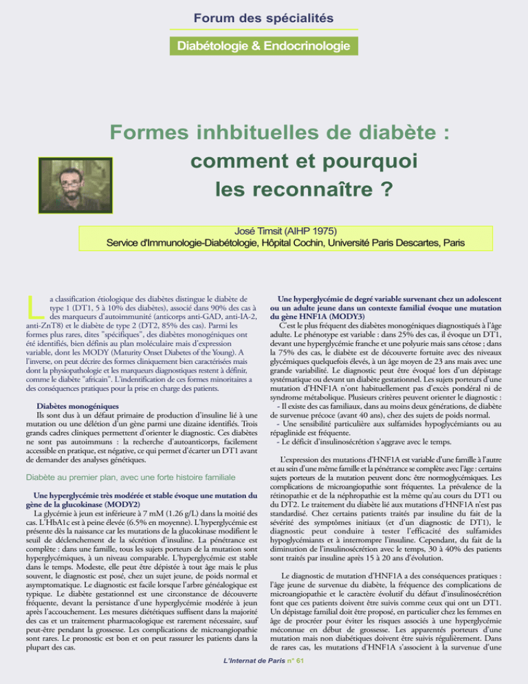 Forum des spécialités Diabétologie & Endocrinologie Formes inhbituelles de diabète : comment et pourquoi les reconnaître ? José Timsit (AIHP 1975) Service d'Immunologie-Diabétologie, Hôpital Cochin, Université Paris Descartes, Paris L a classification étiologique des diabètes distingue le diabète de type 1 (DT1, 5 à 10% des diabètes), associé dans 90% des cas à des marqueurs d'autoimmunité (anticorps anti-GAD, anti-IA-2, anti-ZnT8) et le diabète de type 2 (DT2, 85% des cas). Parmi les formes plus rares, dites "spécifiques", des diabètes monogéniques ont été identifiés, bien définis au plan moléculaire mais d'expression variable, dont les MODY (Maturity Onset Diabetes of the Young). A l'inverse, on peut décrire des formes cliniquement bien caractérisées mais dont la physiopathologie et les marqueurs diagnostiques restent à définir, comme le diabète "africain". L'indentification de ces formes minoritaires a des conséquences pratiques pour la prise en charge des patients. Diabètes monogéniques Ils sont dus à un défaut primaire de production d'insuline lié à une mutation ou une délétion d'un gène parmi une dizaine identifiés. Trois grands cadres cliniques permettent d'orienter le diagnostic. Ces diabètes ne sont pas autoimmuns : la recherche d'autoanticorps, facilement accessible en pratique, est négative, ce qui permet d'écarter un DT1 avant de demander des analyses génétiques. Diabète au premier plan, avec une forte histoire familiale Une hyperglycémie très modérée et stable évoque une mutation du gène de la glucokinase (MODY2) La glycémie à jeun est inférieure à 7 mM (1.26 g/L) dans la moitié des cas. L'HbA1c est à peine élevée (6.5% en moyenne). L'hyperglycémie est présente dès la naissance car les mutations de la glucokinase modifient le seuil de déclenchement de la sécrétion d'insuline. La pénétrance est complète : dans une famille, tous les sujets porteurs de la mutation sont hyperglycémiques, à un niveau comparable. L'hyperglycémie est stable dans le temps. Modeste, elle peut être dépistée à tout âge mais le plus souvent, le diagnostic est posé, chez un sujet jeune, de poids normal et asymptomatique. Le diagnostic est facile lorsque l'arbre généalogique est typique. Le diabète gestationnel est une circonstance de découverte fréquente, devant la persistance d'une hyperglycémie modérée à jeun après l'accouchement. Les mesures diététiques suffisent dans la majorité des cas et un traitement pharmacologique est rarement nécessaire, sauf peut-être pendant la grossesse. Les complications de microangiopathie sont rares. Le pronostic est bon et on peut rassurer les patients dans la plupart des cas. Une hyperglycémie de degré variable survenant chez un adolescent ou un adulte jeune dans un contexte familial évoque une mutation du gène HNF1A (MODY3) C'est le plus fréquent des diabètes monogéniques diagnostiqués à l'âge adulte. Le phénotype est variable : dans 25% des cas, il évoque un DT1, devant une hyperglycémie franche et une polyurie mais sans cétose ; dans la 75% des cas, le diabète est de découverte fortuite avec des niveaux glycémiques quelquefois élevés, à un âge moyen de 23 ans mais avec une grande variabilité. Le diagnostic peut être évoqué lors d'un dépistage systématique ou devant un diabète gestationnel. Les sujets porteurs d'une mutation d'HNF1A n'ont habituellement pas d'excès pondéral ni de syndrome métabolique. Plusieurs critères peuvent orienter le diagnostic : - Il existe des cas familiaux, dans au moins deux générations, de diabète de survenue précoce (avant 40 ans), chez des sujets de poids normal. - Une sensibilité particulière aux sulfamides hypoglycémiants ou au répaglinide est fréquente. - Le déficit d'insulinosécrétion s'aggrave avec le temps. L’expression des mutations d'HNF1A est variable d’une famille à l’autre et au sein d’une même famille et la pénétrance se complète avec l'âge : certains sujets porteurs de la mutation peuvent donc être normoglycémiques. Les complications de microangiopathie sont fréquentes. La prévalence de la rétinopathie et de la néphropathie est la même qu’au cours du DT1 ou du DT2. Le traitement du diabète lié aux mutations d'HNF1A n’est pas standardisé. Chez certains patients traités par insuline du fait de la sévérité des symptômes initiaux (et d'un diagnostic de DT1), le diagnostic peut conduire à tester l’efficacité des sulfamides hypoglycémiants et à interrompre l’insuline. Cependant, du fait de la diminution de l’insulinosécrétion avec le temps, 30 à 40% des patients sont traités par insuline après 15 à 20 ans d’évolution. Le diagnostic de mutation d'HNF1A a des conséquences pratiques : l’âge jeune de survenue du diabète, la fréquence des complications de microangiopathie et le caractère évolutif du défaut d'insulinosécrétion font que ces patients doivent être suivis comme ceux qui ont un DT1. Un dépistage familial doit être proposé, en particulier chez les femmes en âge de procréer pour éviter les risques associés à une hyperglycémie méconnue en début de grossesse. Les apparentés porteurs d’une mutation mais non diabétiques doivent être suivis régulièrement. Dans de rares cas, les mutations d'HNF1A s'associent à la survenue d'une L’Internat de Paris n° 61 Forum des spécialités Diabétologie & Endocrinologie adénomatose hépatique, justifiant un dépistage par échographie. Chez certains patients ayant un phénotype très évocateur on ne trouve pas de mutation du gène HNF1A mais d'un autre facteur de transcription, HNF4A. Antécédents personnels ou familiaux de diabète de la petite enfance Des mutations des deux gènes (KCNJ11 et ABCC8) codant les sousunités du canal potassique de la cellule beta et du gène de l'insuline (INS) ellemême ont été associées à la survenue de diabètes néonatals ou de l'en