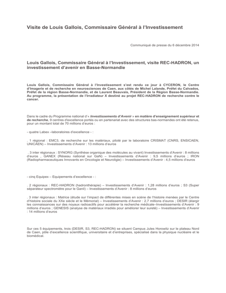 Visite de Louis Gallois, Commissaire Général à l’Investissement Communiqué de presse du 6 décembre 2014 Louis Gallois, Commissaire Général à l’Investissement, visite REC-HADRON, un investissement d’avenir en Basse-Normandie Louis Gallois, Commissaire Général à l’Investissement s’est rendu ce jour à CYCERON, le Centre d’Imagerie et de recherche en neurosciences de Caen, aux côtés de Michel Lalande, Préfet du Calvados, Préfet de la région Basse-Normandie, et de Laurent Beauvais, Président de la Région Basse-Normandie. Au programme, la présentation de l’Irradiateur X destiné au projet REC-HADRON de recherche contre le cancer. Dans le cadre du Programme national d’« Investissements d’Avenir » en matière d’enseignement supérieur et de recherche, 9 centres d'excellence portés ou en partenariat avec des structures bas-normandes ont été retenus, pour un montant total de 70 millions d’euros : - quatre Labex –laboratoires d’excellence - : . 1 régional : EMC3, de recherche sur les matériaux, piloté par le laboratoire CRISMAT (CNRS, ENSICAEN, UNICAEN) – Investissements d’Avenir : 13 millions d’euros . 3 inter régionaux : SYNORG (Synthèse organique des molécules au vivant) Investissements d’Avenir : 8 millions d’euros , GANEX (Réseau national sur GaN) – Investissements d’Avenir : 9,5 millions d’euros ; IRON (Radiopharmaceutiques Innovants en Oncologie et Neuroligie) – Investissements d’Avenir : 4,5 millions d’euros - cinq Equipex – Equipements d’excellence - : . 2 régionaux : REC-HADRON (hadronthérapie) – Investissements d’Avenir : 1,28 millions d’euros ; S3 (Super séparateur spectromètre pour le Ganil) – Investissements d’Avenir : 8 millions d’euros . 3 inter régionaux : Matrice (étude sur l’impact de différentes mises en scène de l’histoire menées par le Centre d’histoire sociale du XXe siècle et le Mémorial) – Investissements d’Avenir : 2,7 millions d’euros ; DESIR (élargir les connaissances sur des noyaux radioactifs pour accélérer la recherche médicale–Investissements d’Avenir : 9 millions d’euros ; GENESIS (analyse de matériaux irradiés pour améliorer leur sureté) – Investissements d’Avenir : 14 millions d’euros Sur ces 5 équipements, trois (DESIR, S3, REC-HADRON) se situent Campus Jules Horowitz sur le plateau Nord de Caen, pôle d’excellence scientifique, universitaire et d’entreprises, spécialisé dans la physique nucléaire et le biomédical. Le projet REC-HADRON, RECherche fondamentale et appliquée en HADRONthérapie, est la première étape dans l’équipement d’ARCHADE, le futur centre européen sur la recherche en hadronthérapie destiné au traitement des cancers, créé en Basse-Normandie sous l’impulsion de la Région. L’hadronthérapie est une nouvelle forme de radiothérapie pour le traitement de cancers inopérables, chimio ou radiorésistants, qui permet d’irradier la tumeur, tout en épargnant au mieux les tissus sains du patient. Les traitements par protons (protonthérapie) et encore plus récemment par ions carbone (hadronthérapie), sont prometteurs et les besoins en recherche, abondants. Implanté sur le Plateau Nord de Caen, près du GANIL, le projet Archade devra mobiliser 130 millions d’euros auxquels la Région a déjà apporté 29,5 millions d’euros, aux côtés du FEDER. Les premiers patients pourraient être traités au plus tôt à partir de 2016. ARCHADE fait partie du projet interrégional d’infrastructures en santé et biotechnologies France Hadron, financé à hauteur de 15 millions d’euros par les investissements d’avenir. Dans ce cadre, l’Irradiateur X permettra de comparer l’efficacité biologique des faisceaux de protons et d’ions carbone par rapport aux rayons X. Il a été financé à hauteur de 1,28 millions d’euros dans le cadre des Investissements d’Avenir. Une chambre à vide, dans laquelle seront disposés les détecteurs de particules d’ions carbone afin de mesurer leur efficacité, viendra compléter le volet recherche d’ARCHADE. L’irradiateur X est installé et hébergé au sein de la plateforme d’imagerie biomédicale CYCERON (CEA / CNRS / INSERM / Université de Caen/BACLESSE/CHU). Les travaux de recherche seront conduits par les équipes du Laboratoire de Physique Corpusculaire de CAEN – LPC (CNRS / IN2P3 / ENSICAEN / Université de Caen), du Laboratoire Accueil en Radiobiologie avec des IonsAccélérés – LARIA (CEA / DSV / IRCM), et de l’équipe CERVOxy du ICTCT (CNRS / CEA / Université de Caen). Plus largement, le GIP Cyceron travaille sur des demandes sociétales majeures que sont le développement des connaissances sur le cerveau normal et ses fonctions cognitives, notamment la mémoire, le langage, le raisonnement, la cognition sociale, ainsi que sur ses dysfonctionnements au cours de diverses pathologies neurologiques et psychiatriques : maladie d’Alzheimer et autres maladies neurodégénératives, accidents vasculaires cérébraux, schizophrénie, autisme, addictions et les tumeurs cérébrales. Au cœur des priorités régionales en matière de recherche et d’innovation, les travaux de CYCERON ont été accompagnés par la Région à hauteur de plus de 10 millions d’euros depuis 2007. Pour Laurent Beauvais, Président de la Région Basse-Normandie « La visite de Louis Gallois permet de mettre en avant l’excellence des équipes de recherche, des organismes de tutelle, des établissements d’enseignement et de recherche et des entreprises bas-normandes. Je ne peux m’empêcher de faire le lien avec le colloque Recherche et Innovation qui se tiendra à Caen dans quelques jours dans le cadre de la Vallée de Seine. L'objectif est de montrer le potentiel de recherche et d'innovation dont dispose cet espace stratégique, et le rôle que peuvent jouer les entreprises, les centres de R&D, les Universités et les acteurs publics pour redynamiser