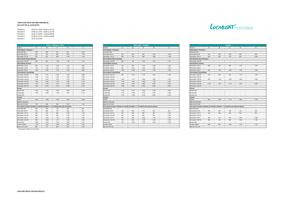 TARIFS'2016'POUR'UNE'MINI'SEMAINE'(€) (du'lundi'14h'au'vendredi'9h) Période(A(: Période(B(: Période(C(: Période(D(: Période(E(: 18.03(au(22.04(4(24.09(au(31.10 23.04(au(13.05(4(10.09(au(23.09 14.05(au(24.06(4(27.08(au(09.09 25.06(au(15.07(4(13.08(au(26.08 16.07(au(12.08 France'G'Hollande'G'Italie Période A B C Allemagne'G'Pologne D E Pénichettes® "Classique" Période Pénichette 935 520 688 816 944 1 048 Pénichette 935 Pénichette 935 W 560 752 880 1 004 1 108 Pénichette 1107 W 604 812 960 1 108 1 196 900 1 028 1 152 1 276 Pénichettes® Flying Classique Pénichette 1106 FB A B C Irlande D E Pénichettes® "Classique" A B C D - - - - E Pénichettes® "Classique" - - - - - Pénichette 935 W 540 668 880 1 004 1 068 Pénichette 935 W 440 568 648 836 944 Pénichette 1107 W 584 752 960 1 068 1 168 Pénichette 1107 W 500 628 732 920 1 028 620 788 1 000 1 128 1 216 776 984 1 216 1 364 1 464 Pénichette 1120 R Pénichettes® Flying Classique 684 Pénichettes® Terrasse Période Pénichette 1106 FB Pénichette 935 - Pénichettes® Flying Classique Pénichettes® Terrasse Pénichette 1106 FB - - - - - 608 816 860 1 132 1 216 Pénichettes® Terrasse Pénichette 1120 R 920 1 128 1 296 1 444 1 592 Pénichette 1120 R Pénichette 1260 R 1 216 1 424 1 572 1 740 1 884 Pénichette 1260 R 900 1 216 1 424 1 552 1 672 Pénichette 1260 R - - - - - Pénichette 1500 R 1 344 1 596 1 764 1 924 2 092 Pénichette 1500 R 1 056 1 368 1 616 1 764 1 884 Pénichette 1500 R 964 1 340 1 552 1 760 1 884 984 1 172 1 256 Pénichettes® Flying Bridge Pénichettes® Flying Bridge Pénichettes® Flying Bridge Pénichette 1020 FB 1 028 1 216 1 384 1 532 1 696 Pénichette 1020 FB 1 552 Pénichette 1020 FB Pénichette 1160 FB 1 128 1 316 1 504 1 632 1 780 Pénichette 1160 FB - - - - - Pénichette 1160 FB - - - - - Pénichette 1165 FB 1 216 1 404 1 572 1 716 1 864 Pénichette 1165 FB 1 004 1 172 1 384 1 552 1 672 Pénichette 1165 FB 836 1 152 1 256 1 504 1 592 Pénichette 1180 FB 1 384 1 592 1 760 1 968 2 132 Pénichette 1180 FB 1 132 1 340 1 592 1 736 1 924 Pénichette 1180 FB - - - - - Pénichette 1400 FB 1 512 1 700 1 972 2 156 2 320 Pénichette 1400 FB 1 348 1 616 1 884 2 072 2 240 Pénichette 1400 FB 1 048 1 464 1 612 1 904 2 008 Pénichette 1500 FB 1 804 2 072 2 320 2 508 2 756 Pénichette 1500 FB 1 596 1 904 2 240 2 424 2 652 Pénichette 1500 FB - - - - - Europa 400 1 236 1 444 1 612 1 800 1 948 Europa 400 1 076 1 216 1 528 1 652 1 800 Europa 400 - - - - - Europa 600 1 384 1 596 1 764 1 972 2 132 Europa 600 1 152 1 368 1 616 1 764 1 952 Europa 600 - - - - - Europa 700 - - - - - Europa 700 1 572 1 780 2 132 2 200 2 340 Europa 700 - - - - - 980 1 052 1 176 1 304 1 464 - - - - - Europa 1 240 1 468 1 652 1 820 1 988 716 828 920 1 012 1 104 1 424 349GS Pénichette 935 460 608 716 Pénichette 935 W 500 668 776 Pénichette 1107 W 564 752 880 Pénichette 1106 FB 608 796 900 Pénichette 1120 R 796 1 004 1 152 836 New Con Fly First* Pénichette 935 880 964 1 000 1 108 1 028 1 256 - - - - - - - - - - 349GS New Con Fly First New Con Fly First* Prix spécial Couple (2 adultes) ou Famille (2 adultes + 1 à 4 enfants selon type de bateau) - - - - - Pénichette 935 - - - - Pénichette 935 W 480 608 776 860 944 Pénichette 1107 W 524 668 860 964 1 028 - Pénichette 935 W 380 500 588 736 836 Pénichette 1107 W 440 568 648 836 944 1 132 Pénichette 1106 FB 564 692 880 984 1 068 Pénichette 1106 FB - - - - - 1 404 Pénichette 1120 R 668 836 1 068 1 196 1 296 Pénichette 1120 R 528 716 756 1 004 1 068 568 736 860 1 028 1 108 900 1 088 1 216 1 384 1 484 Pénichette 1020 FB 732 880 1 108 1 236 1 364 Pénichette 1020 FB Europa 400 1 088 1 276 1 444 1 592 1 716 Europa 400 916 1 048 1 316 1 464 1 572 Europa 400 Linssen 349GS 1 120 1 324 1 488 1 652 1 780 Linssen 349GS - - - - - Linssen 349GS 668 772 852 944 1 024 New Con Fly First - - - - - New Con Fly First New Con Fly First * uniquement en Italie et sur demande 2016'HIRE'PRICES'FOR'MID'WEEK'(€) 836 Linssen Prix spécial Couple (2 adultes) ou Famille (2 adultes + 1 à 4 enfants selon type de bateau) 924 648 Europa New Con Fly First Prix spécial Couple (2 adultes) ou Famille (2 adultes + 1 à 4 enfants selon type de bateau) Pénichette 1020 FB 1 276 Linssen New Con Fly First New Con Fly First* 1 048 Europa Linssen 349GS 900 - - - - - 888 948 1 060 1 180 1 316 - - - - -