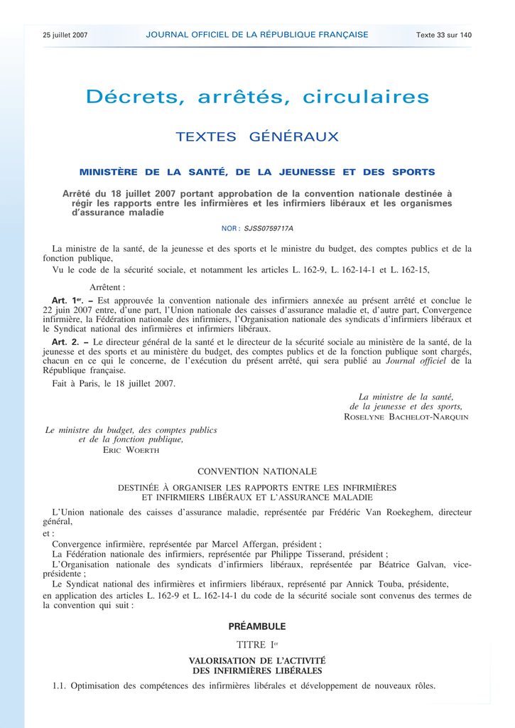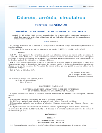 . 25 juillet 2007 JOURNAL OFFICIEL DE LA RÉPUBLIQUE FRANÇAISE Texte 33 sur 140 Décrets, arrêtés, circulaires TEXTES GÉNÉRAUX MINISTÈRE DE LA SANTÉ, DE LA JEUNESSE ET DES SPORTS Arrêté du 18 juillet 2007 portant approbation de la convention nationale destinée à régir les rapports entre les infirmières et les infirmiers libéraux et les organismes d’assurance maladie NOR : SJSS0759717A La ministre de la santé, de la jeunesse et des sports et le ministre du budget, des comptes publics et de la fonction publique, Vu le code de la sécurité sociale, et notamment les articles L. 162-9, L. 162-14-1 et L. 162-15, Arrêtent : Art. 1er. − Est approuvée la convention nationale des infirmiers annexée au présent arrêté et conclue le 22 juin 2007 entre, d’une part, l’Union nationale des caisses d’assurance maladie et, d’autre part, Convergence infirmière, la Fédération nationale des infirmiers, l’Organisation nationale des syndicats d’infirmiers libéraux et le Syndicat national des infirmières et infirmiers libéraux. Art. 2. − Le directeur général de la santé et le directeur de la sécurité sociale au ministère de la santé, de la jeunesse et des sports et au ministère du budget, des comptes publics et de la fonction publique sont chargés, chacun en ce qui le concerne, de l’exécution du présent arrêté, qui sera publié au Journal officiel de la République française. Fait à Paris, le 18 juillet 2007. La ministre de la santé, de la jeunesse et des sports, ROSELYNE BACHELOT-NARQUIN Le ministre du budget, des comptes publics et de la fonction publique, ERIC WOERTH CONVENTION NATIONALE DESTINÉE À ORGANISER LES RAPPORTS ENTRE LES INFIRMIÈRES ET INFIRMIERS LIBÉRAUX ET L’ASSURANCE MALADIE L’Union nationale des caisses d’assurance maladie, représentée par Frédéric Van Roekeghem, directeur général, et : Convergence infirmière, représentée par Marcel Affergan, président ; La Fédération nationale des infirmiers, représentée par Philippe Tisserand, président ; L’Organisation nationale des syndicats d’infirmiers libéraux, représentée par Béatrice Galvan, viceprésidente ; Le Syndicat national des infirmières et infirmiers libéraux, représenté par Annick Touba, présidente, en application des articles L. 162-9 et L. 162-14-1 du code de la sécurité sociale sont convenus des termes de la convention qui suit : PRÉAMBULE TITRE Ier VALORISATION DE L’ACTIVITÉ DES INFIRMIÈRES LIBÉRALES 1.1. Optimisation des compétences des infirmières libérales et développement de nouveaux rôles. . . 25 juillet 2007 JOURNAL OFFICIEL DE LA RÉPUBLIQUE FRANÇAISE Texte 33 sur 140 1.1.1. L’implication des infirmières libérales dans la prise en charge, la surveillance et le suivi des patients atteints de pathologies chroniques. 1.1.2. La participation à des actions d’éducation, de prévention et de promotion de la santé. 1.1.3. L’accompagnement de la prescription de dispositifs médicaux par les infirmières et engagements de maîtrise médicalisée. 1.2. Valorisation de l’activité. TITRE II ACCÈS ET QUALITÉ DES SOINS INFIRMIERS 2.1. Préserver et améliorer l’accès aux soins infirmiers. 2.2. Qualité des soins. TITRE III COORDINATION DES SOINS 3.1. L’infirmière et le parcours coordonné. 3.2. L’infirmière libérale et l’offre en structure. TITRE IV ÉVALUATION ET SUIVI TITRE V MODALITÉS D’EXERCICE CONVENTIONNEL 5.1. Champ d’application de la convention. 5.2. Délivrance des soins aux assurés. 5.2.1. Modalités pratiques liées à l’activité du professionnel. 5.2.2. Conditions d’installation en exercice libéral sous convention. 5.2.3. Conditions d’exercice des remplaçantes. 5.2.4. Documents ouvrant droit au remboursement des prestations. 5.2.5. Rédaction des ordonnances. 5.2.6. Facturation des honoraires. 5.2.7. Modalités de paiement des honoraires. 5.3. Télétransmission des documents nécessaires au remboursement. 5.3.1. Télétransmission des feuilles de soins électroniques par les infirmières et infirmiers libéraux. 5.3.2. Maintenance et évolution du système SESAM-Vitale. 5.3.3. Aides à la télétransmission. 5.3.4. Comité technique paritaire permanent. 5.4. Cotation et hiérarchisation des actes. 5.4.1. Cotation et codage des actes. 5.4.2. Commission de hiérarchisation des actes infirmiers. 5.5. Honoraires. 5.5.1. Fixation des honoraires. 5.5.2. Dépassements. TITRE VI DISPOSITIONS SOCIALES TITRE VII VIE CONVENTIONNELLE 7.1. Durée et résiliation de la convention. 7.1.1. Durée de la convention. . . 25 juillet 2007 JOURNAL OFFICIEL DE LA RÉPUBLIQUE FRANÇAISE Texte 33 sur 140 7.1.2. Résiliation de la convention. 7.2. Modalités de notification et d’adhésion des praticiens. 7.2.1. Notification. 7.2.2. Modalités d’adhésion. 7.3. Instances conventionnelles. 7.3.1. Commission paritaire nationale (CPN). 7.3.2. Commission paritaire régionale (CPR). 7.3.3. Commission paritaire départementale (CPD). 7.3.4. Dispositions communes aux instances. 7.4. Mesures conventionnelles. 7.4.1. Non-respect des dispositions de la présente convention. 7.4.2. Condamnation par une instance ordinale ou judiciaire. TITRE VIII FORMATION CONTINUE CONVENTIONNELLE 8.1. Principes. 8.2. Instances de la formation continue conventionnelle. 8.3. Modalités de gestion et de mise en œuvre de la formation continue conventionnelle. 8.3.1. Thèmes de formation. 8.3.2. Choix des formations. 8.3.3. Financement des formations relevant de la formation continue conventionnelle. 8.3.4. Indemnisation pour perte de ressources de l’infirmier formé dans le cadre du dispositif de la formation continue conventionnelle. 8.3.5. Actions de formation conventionnelle interprofessionnelle. 8.3.6. Gestion des actions de formation. 8.3.7. Evaluation de la formation continue conventionnelle. TITRE IX ANNEXES 9.1. 9.2. 9.3. 9.4. Tarifs des honoraires et frais accessoires. Règlements intérieurs types des instances convent