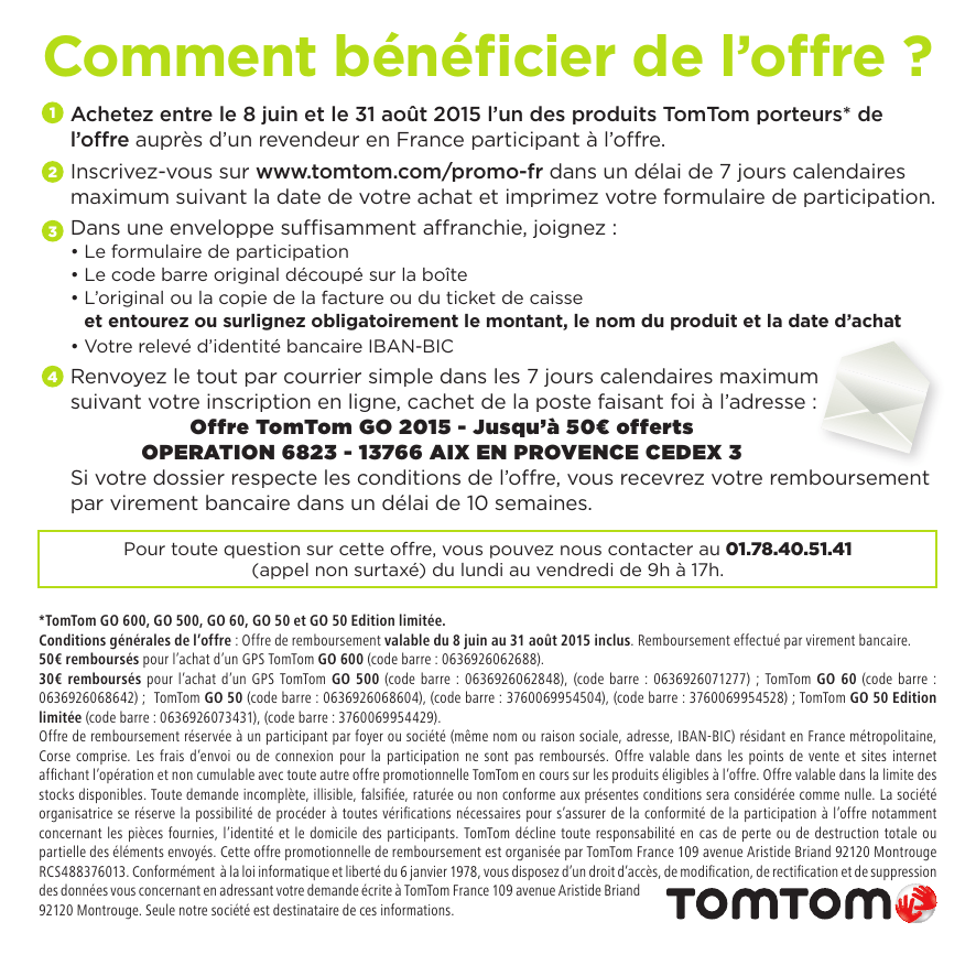Comment bénéficier de l’offre ? 1 Achetez entre le 8 juin et le 31 août 2015 l’un des produits TomTom porteurs* de l’offre auprès d’un revendeur en France participant à l’offre. 2 Inscrivez-vous sur www.tomtom.com/promo-fr dans un délai de 7 jours calendaires maximum suivant la date de votre achat et imprimez votre formulaire de participation. 3 Dans une enveloppe suffisamment affranchie, joignez : 4 Renvoyez le tout par courrier simple dans les 7 jours calendaires maximum suivant votre inscription en ligne, cachet de la poste faisant foi à l’adresse : Offre TomTom GO 2015 - Jusqu’à 50€ offerts OPERATION 6823 - 13766 AIX EN PROVENCE CEDEX 3 Si votre dossier respecte les conditions de l’offre, vous recevrez votre remboursement par virement bancaire dans un délai de 10 semaines. • Le formulaire de participation • Le code barre original découpé sur la boîte • L’original ou la copie de la facture ou du ticket de caisse et entourez ou surlignez obligatoirement le montant, le nom du produit et la date d’achat • Votre relevé d’identité bancaire IBAN-BIC Pour toute question sur cette offre, vous pouvez nous contacter au 01.78.40.51.41 (appel non surtaxé) du lundi au vendredi de 9h à 17h. *TomTom GO 600, GO 500, GO 60, GO 50 et GO 50 Edition limitée. Conditions générales de l’offre : Offre de remboursement valable du 8 juin au 31 août 2015 inclus. Remboursement effectué par virement bancaire. 50€ remboursés pour l’achat d’un GPS TomTom GO 600 (code barre : 0636926062688). 30€ remboursés pour l’achat d’un GPS TomTom GO 500 (code barre : 0636926062848), (code barre : 0636926071277) ; TomTom GO 60 (code barre : 0636926068642) ; TomTom GO 50 (code barre : 0636926068604), (code barre : 3760069954504), (code barre : 3760069954528) ; TomTom GO 50 Edition limitée (code barre : 0636926073431), (code barre : 3760069954429). Offre de remboursement réservée à un participant par foyer ou société (même nom ou raison sociale, adresse, IBAN-BIC) résidant en France métropolitaine, Corse comprise. Les frais d’envoi ou de connexion pour la participation ne sont pas remboursés. Offre valable dans les points de vente et sites internet affichant l’opération et non cumulable avec toute autre offre promotionnelle TomTom en cours sur les produits éligibles à l’offre. Offre valable dans la limite des stocks disponibles. Toute demande incomplète, illisible, falsifiée, raturée ou non conforme aux présentes conditions sera considérée comme nulle. La société organisatrice se réserve la possibilité de procéder à toutes vérifications nécessaires pour s’assurer de la conformité de la participation à l’offre notamment concernant les pièces fournies, l’identité et le domicile des participants. TomTom décline toute responsabilité en cas de perte ou de destruction totale ou partielle des éléments envoyés. Cette offre promotionnelle de remboursement est organisée par TomTom France 109 avenue Aristide Briand 92120 Montrouge RCS488376013. Conformément à la loi informatique et liberté du 6 janvier 1978, vous disposez d’un droit d’accès, de modification, de rectification et de suppression des données vous concernant en adressant votre demande écrite à TomTom France 109 avenue Aristide Briand 92120 Montrouge. Seule notre société est destinataire de ces informations.