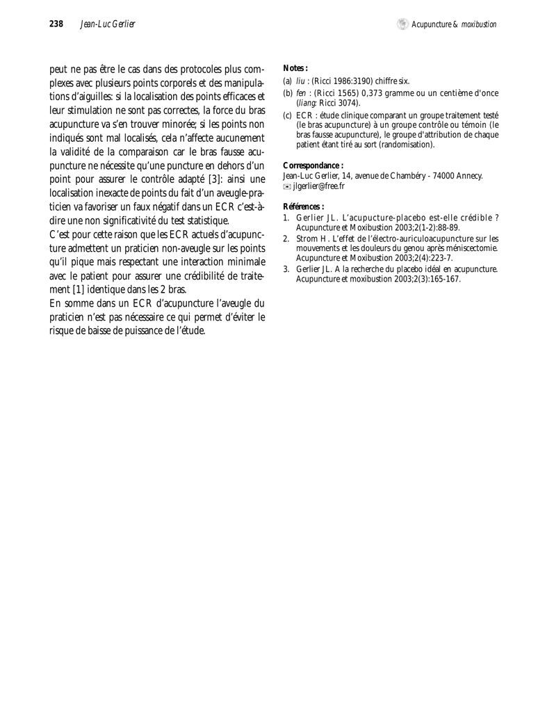 238 Jean-Luc Gerlier peut ne pas être le cas dans des protocoles plus complexes avec plusieurs points corporels et des manipulations d’aiguilles: si la localisation des points efficaces et leur stimulation ne sont pas correctes, la force du bras acupuncture va s’en trouver minorée; si les points non indiqués sont mal localisés, cela n’affecte aucunement la validité de la comparaison car le bras fausse acupuncture ne nécessite qu’une puncture en dehors d’un point pour assurer le contrôle adapté [3]: ainsi une localisation inexacte de points du fait d’un aveugle-praticien va favoriser un faux négatif dans un ECR c’est-àdire une non significativité du test statistique. C’est pour cette raison que les ECR actuels d’acupuncture admettent un praticien non-aveugle sur les points qu’il pique mais respectant une interaction minimale avec le patient pour assurer une crédibilité de traitement [1] identique dans les 2 bras. En somme dans un ECR d’acupuncture l’aveugle du praticien n’est pas nécessaire ce qui permet d’éviter le risque de baisse de puissance de l’étude. Acupuncture & moxibustion Notes : (a) liu : (Ricci 1986:3190) chiffre six. (b) fen : (Ricci 1565) 0,373 gramme ou un centième d'once (liang: Ricci 3074). (c) ECR : étude clinique comparant un groupe traitement testé (le bras acupuncture) à un groupe contrôle ou témoin (le bras fausse acupuncture), le groupe d'attribution de chaque patient étant tiré au sort (randomisation). Correspondance : Jean-Luc Gerlier, 14, avenue de Chambéry - 74000 Annecy. ✉ [email protected] Références : 1. Ger lier JL. L’ a c u p u c t u re-plac ebo e st-e lle crédible ? Acupuncture et Moxibustion 2003;2(1-2):88-89. 2. St rom H. L’effet de l’ é l e c t ro - a u r i c u l o a c u p u n c t u re sur les mouvements et les douleurs du genou après méniscectomie. Acupuncture et Moxibustion 2003;2(4):223-7. 3. Gerlier JL. A la recherche du placebo idéal en acupuncture. Acupuncture et moxibustion 2003;2(3):165-167. 239 2003, 2 (4) Evaluation de l’acupuncture Johan Nguyen, Jean-Luc Gerlier Une méta-analyse chinoise positive sur les céphalées La méta-analyse de Linde publiée en 2001 portant sur l’évaluation de l’acupuncture dans le traitement des céphalées avait conclu que les données scientifiques vont dans le sens d’un intérêt de l’acupuncture mais que la qualité et le niveau de preuve ne sont pas convaincants. Une méta-analyse quantitative portant sur 9 essais cliniques chinois (917 patients) dans le domaine des migraines vient d’être publiée (fig. 1). Elle montre la supériorité de l’acupuncture sur le groupe de contrôle OR 3.03 [2.12-4.35]. La méta-analyse reste positive en n’incluant que les 8 essais randomisés (OR 3.22 [2.10-4.95]). Les auteurs concluent que l’acupuncture est efficace sur les migraines mais que l’effet thérapeutique sur les autres formes de céphalées reste indéterminé sur la base des données chinoises. Zhang Lu, Liu Ba oyan, Jin Z higa o. [ Eva luation of the literature about a c u p u n c t u re an d m ox i b u s t i o n treatment of headache at home]. Chinese Ac u p u n c t u re and Mox i b u s t i o n 2 0 0 3 ; 2 3 ( 1 1 ) : 6 3 3 - 3 6 . Instit ute of Ac u p u n c t u re & Moxibus ti on, China Academy of TCM, Beijing. Une méta-analyse sino-japonaise positive sur les lombalgies Les données des synthèses méthodiques et méta-analyses sur les lombalgies sont discordantes. Une équipe sino-japonaise vient de publier une méta-analyse quantitative positive. La méta-analyse regroupe 8 ECR (394 patients) étudiant l’ ac u p u n c t u re dans les lombalgies et utilisant comme critère l’évaluation de la douleur sur échelle visuelle analogique (EVA) de 10 cm. L’acupuncture apparaît supérieure aux interventions de contrôle (différence de 0,33 cm 95 % CI: 0,11-0,54 cm). L’étude comporte 4 ECR anglo-saxons et 4 ECR japonais. L’analyse en sousg roupes montre une efficacité de l’acupuncture pour les ECR anglo-saxons, mais non pour les ECR japonais. Les auteurs soulignent le faible effectif total, nécessitant la conduite d’essais plus importants. La validité est surtout limitée par la non prise en compte de la qualité des ECR inclus dans la méta-analyse. Zhu Yanbo, Hideki Origasa, Qi Wa n g . [Meta-analysis of acupuncture therapy f or relieving low b ack p ain on the visual analog scale]. Jpn Pharmacol Ther 2002;30(12):997-1002. School of Public Health, Beijing Un i versity of Chinese Pharmacy and Division of Bi o s t a t i s t i c s , Toyama Me dical an d Ph a r m a c e u t i c a l University. 240 Johan Nguyen, Jean-Luc Gerlier Acupuncture & moxibustion Méta-analyse en obstétrique : précisions Dans le dernier numéro d’Acupuncture et Moxibustion, nous avons publié un tableau récapitulatif des synthèses et méta-analyses en mentionnant la publication de Smith (2001) portant sur l’obstétrique. La publication porte en fait plus précisément sur la maturation et l’induction du travail. Deux ECR ont Revues méthodiques et méta-analyses : mise à jour Dans le tableau récapitulatif des synthèses et métaanalyses sur l'acupuncture, il convient d’ajouter trois nbre ECR inclus été identifiés par les auteurs mais exclus du fait des critères retenus. Signalons qu’à ce jour Acudoc2 ECR comporte 17 ECR comparant l’acupuncture à un groupe de contrôle sur la maturation, l'induction et l’accélération du travail. Smith CA, Crowther CA. Ac u p u n c t u re for induction of labour (Cochrane Re v i ew). In: The Cochrane Li b ra ry, Is s u e 2,2001. Oxford: Update Software. publications de la Cochrane sur les dysménorrhées (Proctor 2001), la polyarthrite rhumatoïde (Casimiro 2002) et l’épicondylite (Green 2001). Situation auteurs Conclusions Dysménorrhées Proctor ML et al 2001 2 Les preuves sont insuffisantes pour déterminer l’efficacité de l’acupuncture pour diminuer la dysménorrhée 