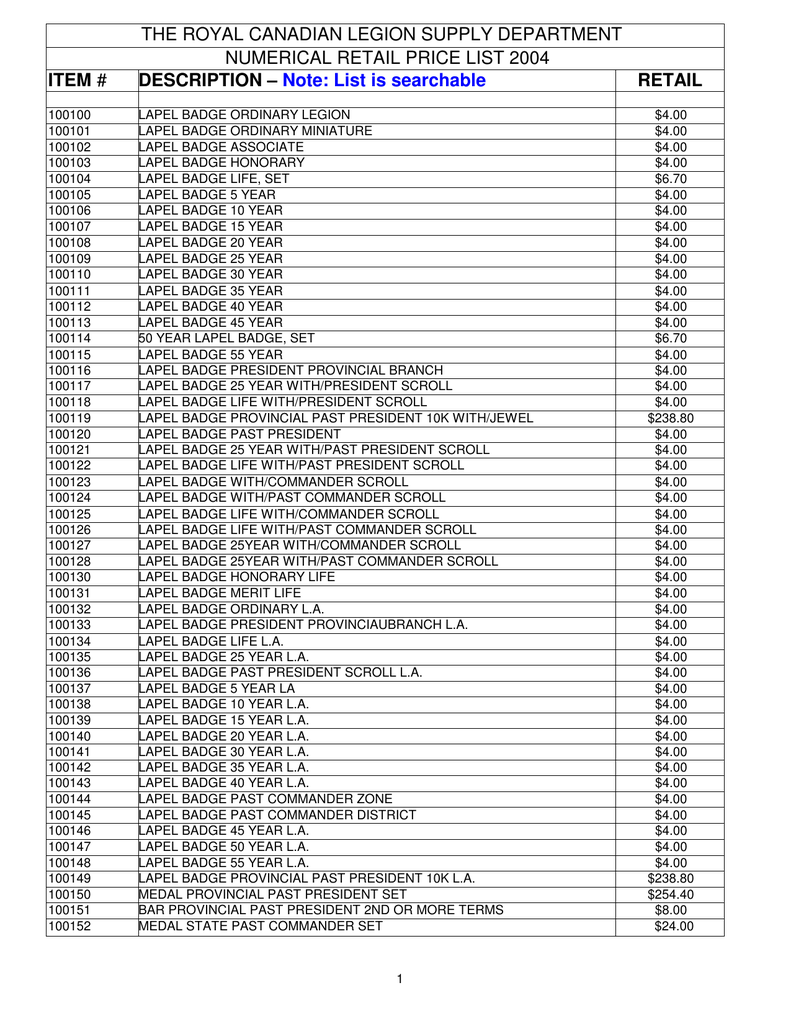 ITEM # THE ROYAL CANADIAN LEGION SUPPLY DEPARTMENT NUMERICAL RETAIL PRICE LIST 2004 DESCRIPTION – Note: List is searchable RETAIL 100100 100101 100102 100103 100104 100105 100106 100107 100108 100109 100110 100111 100112 100113 100114 100115 100116 100117 100118 100119 100120 100121 100122 100123 100124 100125 100126 100127 100128 100130 100131 100132 100133 100134 100135 100136 100137 100138 100139 100140 100141 100142 100143 100144 100145 100146 100147 100148 100149 100150 100151 100152 LAPEL BADGE ORDINARY LEGION LAPEL BADGE ORDINARY MINIATURE LAPEL BADGE ASSOCIATE LAPEL BADGE HONORARY LAPEL BADGE LIFE, SET LAPEL BADGE 5 YEAR LAPEL BADGE 10 YEAR LAPEL BADGE 15 YEAR LAPEL BADGE 20 YEAR LAPEL BADGE 25 YEAR LAPEL BADGE 30 YEAR LAPEL BADGE 35 YEAR LAPEL BADGE 40 YEAR LAPEL BADGE 45 YEAR 50 YEAR LAPEL BADGE, SET LAPEL BADGE 55 YEAR LAPEL BADGE PRESIDENT PROVINCIAL BRANCH LAPEL BADGE 25 YEAR WITH/PRESIDENT SCROLL LAPEL BADGE LIFE WITH/PRESIDENT SCROLL LAPEL BADGE PROVINCIAL PAST PRESIDENT 10K WITH/JEWEL LAPEL BADGE PAST PRESIDENT LAPEL BADGE 25 YEAR WITH/PAST PRESIDENT SCROLL LAPEL BADGE LIFE WITH/PAST PRESIDENT SCROLL LAPEL BADGE WITH/COMMANDER SCROLL LAPEL BADGE WITH/PAST COMMANDER SCROLL LAPEL BADGE LIFE WITH/COMMANDER SCROLL LAPEL BADGE LIFE WITH/PAST COMMANDER SCROLL LAPEL BADGE 25YEAR WITH/COMMANDER SCROLL LAPEL BADGE 25YEAR WITH/PAST COMMANDER SCROLL LAPEL BADGE HONORARY LIFE LAPEL BADGE MERIT LIFE LAPEL BADGE ORDINARY L.A. LAPEL BADGE PRESIDENT PROVINCIAUBRANCH L.A. LAPEL BADGE LIFE L.A. LAPEL BADGE 25 YEAR L.A. LAPEL BADGE PAST PRESIDENT SCROLL L.A. LAPEL BADGE 5 YEAR LA LAPEL BADGE 10 YEAR L.A. LAPEL BADGE 15 YEAR L.A. LAPEL BADGE 20 YEAR L.A. LAPEL BADGE 30 YEAR L.A. LAPEL BADGE 35 YEAR L.A. LAPEL BADGE 40 YEAR L.A. LAPEL BADGE PAST COMMANDER ZONE LAPEL BADGE PAST COMMANDER DISTRICT LAPEL BADGE 45 YEAR L.A. LAPEL BADGE 50 YEAR L.A. LAPEL BADGE 55 YEAR L.A. LAPEL BADGE PROVINCIAL PAST PRESIDENT 10K L.A. MEDAL PROVINCIAL PAST PRESIDENT SET BAR PROVINCIAL PAST PRESIDENT 2ND OR MORE TERMS MEDAL STATE PAST COMMANDER SET 1 $4.00 $4.00 $4.00 $4.00 $6.70 $4.00 $4.00 $4.00 $4.00 $4.00 $4.00 $4.00 $4.00 $4.00 $6.70 $4.00 $4.00 $4.00 $4.00 $238.80 $4.00 $4.00 $4.00 $4.00 $4.00 $4.00 $4.00 $4.00 $4.00 $4.00 $4.00 $4.00 $4.00 $4.00 $4.00 $4.00 $4.00 $4.00 $4.00 $4.00 $4.00 $4.00 $4.00 $4.00 $4.00 $4.00 $4.00 $4.00 $238.80 $254.40 $8.00 $24.00 100153 100154 100155 100156 100157 100158 100159 100160 100161 100162 100163 100164 100165 100166 100167 100168 100169 100170 100171 100172 100173 100174 100175 100176 100177 100178 100179 100180 100181 100182 100183 100184 100185 100186 100187 100188 100189 100190 100191 100192 100193 100194 100195 100196 100197 100198 100199 100200 100201 100202 100203 100204 100205 100206 100207 100208 100209 BAR STATE PAST COMMANDER 2ND OR MORE TERMS MEDAL PROVINCIAL/STATE PAST OFFICER BAR PROVINCIAL/STATE PAST OFFICER 1ST VICE PRESIDENT BAR PROVINCIAUSTATE PAST OFFICER VICE PRESIDENT BAR PROVINCIAUSTATE PAST OFFICER HONORARY SECRETARY BAR PROVINCIAUSTATE PAST OFFICER HONORARY TREASURER BAR PROVINCIAUSTATE PAST OFFICER CHAIRMAN BAR PROVINCIAUSTATE PAST OFFICER VICE CHAIRMAN BAR PROVINCIAUSTATE PAST OFFICER COUNCILLOR BAR STATE PAST OFFICER 1ST VICE COMMANDER BAR STATE PAST OFFICER FINANCE BAR STATE PAST OFFICER ADJUTANT BAR PROVINCIAUSTATE PAST OFFICER CHAPLAIN BAR PROVINCIAL/STATE PAST OFFICER SERVICE OFFICER BAR PROVINCIAUSTATE PAST OFFICER SECRETARY TREASURER BAR PROVINCIAUSTATE PAST OFFICER EXECUTIVE COMMITTEE MEDAL PROVINCIAUSTATE PAST EXECUTIVE COUNCILLOR BAR PROVINCIAUSTATE PAST EXECUTIF COUNCILLOR MEDAL DISTRICT PAST COMMANDER SET BAR DISTRICT PAST COMMANDER 2ND TERM MEDAL DISTRICT/ZONE PAST OFFICER BAR PAST OFFICER DISTRICT BAR PAST OFFICER ZONE BAR DISTRICT/ZONE PAST OFFICER HONORARY SECRETARY BAR DISTRICT/ZONE PAST OFFICER DEPUTY COMMANDER BAR DISTRICT/ZONE PAST OFFICER CHAIRMAN BAR DISTRICT/ZONE PAST OFFICER EXECUTIVE COMMITTEE MEDAL ZONE PAST COMMANDER SET BAR ZONE PAST COMMANDER 2ND TERM MEDAL BRANCH PAST PRESIDENT SET BAR BRANCH PAST PRESIDENT 2ND TERM MEDAL POST PAST COMMANDER SET BAR POST PAST COMMANDER 2ND TERM MEDAL BRANCH/POST PAST OFFICER BAR BRANCH/POST PAST OFFICER 1ST VICE PRESIDENT BAR BRANCH/POST PAST OFFICER VICE PRESIDENT BAR BRANCH/POST PAST OFFICER HONORARY TREASURER BAR BRANCH/POST PAST OFFICER HONORARY SECRETARY BAR BRANCH/POST PASRT HONORARY TREASURER BAR BRANCH/POST PAST OFFICER CHAIRMAN BAR POST PAST OFFICER 1ST VICE COMMANDER BAR POST PAST OFFICER 2ND VICE COMMANDER BAR POST PAST OFFICER 3RD VICE COMMANDER BAR POST PAST OFFICER FINANCE OFFICER BAR POST PAST OFFICER ADJUTANT BAR BRANCH/POST PAST OFFICER CHAPLAIN BAR BRANCH/POST PAST OFFICER SGT-AT-ARMS BAR BRANCH/POST PAST OFFICER SERVICE OFFICER BAR BRANCH/POST PAST OFFICER SECRETARY TREASURER BAR BRANCH/POST PAST OFFICER EXECUTIVE COMMITTEE MEDAL MERITORIOUS SERVICE PALM LEAF FOR MERIT SERVICE MERITORIOUS SERVICE MEDAL SET MEDAL MERIT SERVICE AWARD L.A. MEDAL PROVINCIAUSTATE PAST PRESIDENT SET L.A. BAR PROVINCIAUSTATE PAST PRESIDENT L.A. 2ND TERM MEDAL PROVINCIAUSTATE PAST OFFICER L.A. 2 $8.00 $20.00 $8.00 $8.00 $8.00 $8.00 $8.00 $8.00 $8.00 $8.00 $8.00 $8.00 $8.00 $8.00 $8.00 $8.00 $20.00 $8.00 $24.00 $8.00 $20.00 $8.00 $8.00 $8.00 $8.00 $8.00 $8.00 $24.00 $8.00 $24.00 $8.00 $24.00 $8.00 $20.00 $8.00 $8.00 $8.00 $8.00 $8.00 $8.00 $8.00 $8.00 $8.00 $8.00 $8.00 $8.00 $8.00 $8.00 $8.00 $8.00 $33.00 $8.10 $127.20 $37.00 $254.40 $8.00 $20.00 100210 100211 100212 100213 100214 100215 100216 100217 100218 100219 100220 100221 100222 100223 100224 100225 100226 100227 100228 100229 100230 100231 100232 100233 100234 100235 100236 100237 100238 100239 100240 100241 100242 100243 100244 100245 100246 100247 100248 100249 100250 100251 100252 100253 100254 100255 100256 100257 100258 100259 100260 100261 100262 100271 100272 100273 100274 BAR PROVINCIAUSTATE PAST OFFICER LA. 1ST VICE PRESIDENT BAR PROVINCIAUSTATE PAST OFFICER L.A. VICE PRESIDENT BAR PROVINCIAUSTATE PAST OFFICER L.A. HONOR