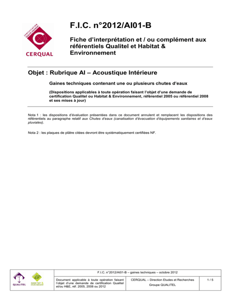 F.I.C. n°2012/AI01-B Fiche d’interprétation et / ou complément aux référentiels Qualitel et Habitat & Environnement Objet : Rubrique AI – Acoustique Intérieure Gaines techniques contenant une ou plusieurs chutes d’eaux (Dispositions applicables à toute opération faisant l’objet d’une demande de certification Qualitel ou Habitat & Environnement, référentiel 2005 ou référentiel 2008 et ses mises à jour) Nota 1 : les dispositions d’évaluation présentées dans ce document annulent et remplacent les dispositions des référentiels au paragraphe relatif aux Chutes d’eaux (canalisation d’évacuation d’équipements sanitaires et d’eaux pluviales). Nota 2 : les plaques de plâtre citées devront être systématiquement certifiées NF. F.I.C. n°2012/AI01-B – gaines techniques – octobre 2012 Document applicable à toute opération faisant l’objet d’une demande de certification Qualitel et/ou H&E, réf. 2005, 2008 ou 2012 CERQUAL – Direction Etudes et Recherches Groupe QUALITEL 1/5 Chute d'eaux (canalisation d'évacuation d'équipements sanitaires et d'eaux pluviales) On étudie, pour chaque pièce principale et pour la cuisine du logement examiné, la transmission provenant de canalisations d’évacuation d’eaux des équipements sanitaires extérieurs au logement examiné (eaux usées et eaux vannes) ou d’eaux pluviales, et passant ou non dans une gaine technique ou un soffite. Il y a lieu d’examiner à la fois les gaines techniques avec ou sans dévoiement contenant une ou plusieurs chutes d’eau, y compris les soffites. Le niveau d’évaluation est réalisé en se reportant dans un premier temps au tableau « dispositions de base » et dans un deuxième temps aux tableaux « Définition des différentes configurations possibles » puis « Constitution des gaines techniques et soffites ». Dans le cas où il n’est pas prévu de gaine technique ou de soffite autour de telles canalisations, on retient directement le niveau “ NC ” pour cette sous-rubrique. Définitions : Gaine technique : galerie coffrée d’allure verticale, visitable ou non par trappe de visite selon les cas, dans laquelle sont regroupés et masqués à la vue des organes de distribution et d’évacuation des fluides tels que les eaux usées, les eaux vannes, les eaux de pluie, l’eau chaude, l’eau froide, etc. Dévoiement : déviation horizontale ou oblique d’une canalisation. Soffite : encoffrement d’allure horizontale dans lequel sont regroupés et masqués les mêmes éléments que ci-dessus. Examen de la gaine technique contenant une ou plusieurs chutes d'eaux On vérifie que l’ensemble des dispositions suivantes sont satisfaites : Dispositions de base dispositions de base canalisations standard en PVC fixées uniquement sur un mur de masse surfacique ms 200 kg/m². dans le cas de gaines possédant 4 faces visibles dans la pièce de ms < 200 kg/m², les canalisations devront être totalement indépendantes des parois de la gaine et fixées aux planchers par le biais d’un support antivibratile. présence d’une désolidarisation des chutes d’eaux au niveau de la traversée de plancher par un matériau résilient d’une épaisseur suffisante (5 mm minimum), qui doit dépasser largement (10 cm environ) de part et d’autre du plancher. présence d’une désolidarisation du conduit de raccordement du WC à la chute d’eau verticale, au niveau de la traversée des parois verticales de gaines techniques, par un matériau résilient d’une épaisseur suffisante (5 mm minimum), qui doit dépasser de 1 cm minimum de part et d’autre de la paroi concernée. les trappes de visite ne sont pas admises dans les chambres et les séjours sauf dans la partie cuisine d’un séjour ouvert sur cuisine. Elles seront pourvues : d’une surface ≤ 0,25 m² ; d’un indice [Rw+C] ≥ 32 dB ; d’un joint périphérique ; d’une fermeture à batteuse avec rampe de serrage. en présence d’une gaine technique accolée à une façade avec un doublage intérieur, il convient de limiter les transmissions latérales par le parement du doublage. Selon les cas : la gaine technique est réalisée avant le doublage : La cloison de gaine technique doit se prolonger jusqu’à la façade de manière à ce que le doublage ne soit pas filant entre la gaine et la pièce principale ou cuisine. L’isolation thermique de façade sera rapportée dans la gaine pour éviter les ponts thermiques. la gaine technique est réalisée après doublage : la plaque de plâtre du doublage doit être découpée (trait de scie) au droit de la cloison de gaine technique, sur toute la hauteur Dans les deux cas, les canalisations seront fixées aux dalles ou à un mur lourd au moyen de supports antivibratiles et en aucun cas sur le doublage ou la gaine technique F.I.C. n°2012/AI01-B – gaines techniques – octobre 2012 Document applicable à toute opération faisant l’objet d’une demande de certification Qualitel et/ou H&E, réf. 2005, 2008 ou 2012 CERQUAL – Direction Etudes et Recherches Groupe QUALITEL 2/5 Le tableau suivant définit les différentes configurations rencontrées : Cas n°1 : cas courant de gaine technique ayant au moins une face donnant dans une cuisine ou une pièce principale, en présence ou non d’un dévoiement oblique de chute d’eau à l’étage concerné. Cas n°2 : lorsque le local examiné est situé au-dessus d’un local d’activités ou d’un garage. Cas n°3 : lorsqu’un dévoiement à angle droit est situé dans le local examiné en plafond (soffite). Définition des différentes configurations possibles Cas n°1 : Gaine courante Dévoiement oblique éventuel de chute d’eau Gaine technique Local examiné Dévoiement à 90° éventuel Cas n°2 : Gaine au-dessus d’un local d’activité ou garage situé au niveau inférieur, en absence de paroi de gaine dans ces locaux Cas n°3 : Soffite Dévoiement oblique éventuel de chute d’eau Dévoiement obliq