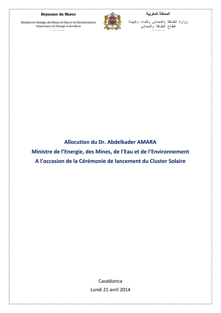 Allocution du Dr. Abdelkader AMARA Ministre de l’Energie, des Mines, de l’Eau et de l’Environnement A l’occasion de la Cérémonie de lancement du Cluster Solaire Casablanca Lundi 21 avril 2014 0/6 Monsieur le Président du Directoire de l’Agence Marocaine de l’Energie Solaire (MASEN), Monsieur le Président de la Fédération des Industries Métallurgiques, Mécaniques et Electromécaniques (FIMME), Monsieur le Président de la Fédération Nationale de l’Electricité, de l’Electronique et des Energies Renouvelables (FENELEC), Messieurs les Présidents des Universités et des Etablissements de Recherche, Monsieur le représentant de la GIZ, Messieurs les Directeurs Généraux, Mesdames et Messieurs, (Selon présence…) C’est avec un réel plaisir et un grand intérêt que je de participe aujourd’hui à cette cérémonie de lancement du Cluster Solaire, qui vient renforcer les actions menées dans le cadre de la stratégie énergétique nationale, en vue de promouvoir l´innovation et d’étendre les structures de R&D au niveau national. Je remercie et je félicite MASEN et ses partenaires pour cette initiative qui vise à favoriser l’émergence d’une filière industrielle solaire compétitive dans notre pays. Je tiens également à exprimer mes remerciements à nos partenaires allemands, notamment la GIZ et la Kfw, qui nous ont toujours soutenu et accompagné pour le développement et la promotion du secteur des énergies renouvelables au Maroc. Mesdames et Messieurs, Durant ces dernières années, la demande nationale en énergie primaire a augmenté en moyenne de près de 5%, tirée par la consommation électrique qui a connu une croissance moyenne de 6,5% par an, en raison de la quasi généralisation de l’électrification rurale et du dynamisme de notre économie et principalement la politique des grands chantiers en infrastructures, industrie, agriculture, tourisme et logement social, ainsi que de la croissance démographique couplée à l’amélioration du niveau de vie de la population. Les études prospectives menées par le Ministère prévoient le triplement de la demande en énergie primaire et le quadruplement de la demande électrique à l’horizon 2030. 1/6 Pour faire face à cette demande, notre pays a mis en place une stratégie énergétique visant principalement le développement des énergies renouvelables, l’intégration industrielle et le renforcement de la RechercheDéveloppement dans le domaine des nouvelles technologies énergétiques, ainsi que le développement des compétences. Ainsi, à l’horizon 2020, les énergies renouvelables représenteront 42% de la puissance installée, en développant 2000 MW d’énergie solaire, 2000 MW d’énergie éolienne et 2000 MW hydraulique. L’investissement global pour les trois programmes des énergies renouvelables est évalué à 13,1 milliard de $ US, soit près de 60% de l’investissement total prévu pour le secteur de l’énergie. Le processus de concrétisation de nos deux projets d’énergies solaire et éolienne connait un progrès remarquable. Mesdames et Messieurs Pour accompagner la mise en œuvre de notre stratégie énergétique, des réformes importantes et nécessaires ont été entreprises aux niveaux législatifs, réglementaire et institutionnel dans le but d’asseoir un cadre propice au développement accéléré des énergies renouvelables et son inscription dans la dynamique de développement de la coopération régionale et internationale et d’intégration des marchés régionaux de l’énergie. Et nous souhaitons que l’élan que manifeste notre pays à l’égard du solaire particulièrement trouve des échos positifs dans d’autres pays, ce qui permettrait la création d’un véritable marché régional électrique et industriel et par voie de conséquence la réduction des couts d’investissement. Aujourd’hui, nous nous apprêtons à lancer deux chantiers importants qui feront suite à l’ouverture à la concurrence de la production de l’électricité produite à partir de sources d’énergies renouvelables pour les clients Très Haute Tension (THT) et Haute Tension (HT) et le libre accès au réseau de transport et aux interconnexions. En effet, en réponse à la demande des industriels installés au Maroc raccordés au réseau Moyenne Tension et des développeurs des centrales de sources renouvelables et de notre engagement à l’ouverture progressive et partielle de notre réseau et de notre marché de l’électricité, nous nous apprêtons à mettre 2/6 en place les conditions et des modalités de l’ouverture du marché électrique de sources renouvelables de la moyenne tension. Le second chantier vise la mise en place des bases juridiques et réglementaires nécessaire pour l’utilisation à grande échelle du photovoltaïque résidentiel et tertiaire connecté au réseau BT. Il faut préciser, sur ce point, que nous avons mené une consultation qui a démontré l’impact positif de l’utilisation du photovoltaïque résidentiel à grande échelle au Maroc tant au niveau énergétique, économique qu’environnemental. Ces deux chantiers donneront, sans conteste, une impulsion aux PMI-PME intéressées par le développement au Maroc de projets d’énergies renouvelables de petites et moyennes capacités. Mesdames et Messieurs Notre pays, à travers ses programmes solaires et ses programmes éoliens, vise, certes, à corriger sa vulnérabilité, mais également, à assurer une intégration industrielle progressive, permettant d’accélérer l’appropriation des technologies prometteuses de valorisation des ressources énergétiques renouvelables, le développement d’un tissu industriel national en mesure d’accompagner les projets de développement des énergies renouvelables et d’assurer la compétitivité requise à l’export. Ce cluster qui est lancé aujourd’hui constitue une plate-forme qui réunit des professionnels 