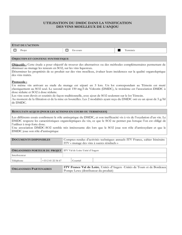 UTILISATION DU DMDC DANS LA VINIFICATION DES VINS MOELLEUX DE L’ANJOU ETAT DE L’ACTION Projet En cours Terminée OBJECTIFS ET CONTENU SYNTHETIQUE Objectifs : Cette étude a pour objectif de trouver des alternatives ou des méthodes complémentaires permettant de diminuer au mutage les teneurs en SO2, sur les vins liquoreux. Déterminer les propriétés de ce produit sur des vins moelleux, évaluer leurs incidences sur la qualité organoleptique des vins traités. Protocole : Un même vin arrivant au stade du mutage est séparé en 3 lots. Un lot correspondant au Témoin est muté classiquement au SO2 seul. Le second reçoit 150 mg/l de Velcorin (DMDC), le troisième est l’association DMDC à dose réduite et SO2 à dose réduite. Les vins sont élevés et soutirés de façon traditionnelle, avec ajout de SO2 seulemnt sur le lot Témoin. Au moment de la filtration et de la mise en bouteilles. Les 2 modalités ayant reçu du DMDC ont eu un ajout de 5 g/hl de DMDC. RESULTATS ACQUIS (POUR LES ACTIONS EN COURS OU TERMINEES) Les différents essais confirment le rôle antiseptique du DMDC, et son inefficacité vis à vis de l’oxydation d’un vin. Le DMDC respecte les caractéristiques organoleptiques du vin, ce que le SO2 ne permet pas lorsque l’on est obligé de l’utiliser à trop forte dose. Une association DMDC-SO2 semble très intéressante dès lors que le SO2 joue son rôle d’antioxydant et que le DMDC joue son rôle d’antiseptique DOCUMENTS DISPONIBLES Comptes-rendus d’activités techniques annuels ITV France, cahier Itinéraire ITV « mutage des vins à sucres résiduels » ORGANISMES PORTEUR DU PROJET IFV Val de Loire Unité d’Angers Interlocuteur Téléphone +33 2 41 22 56 67 ORGANISMES PARTENAIRES Courriel ITV France Val de Loire, Unités d’Angers -Unités de Tours et de Bordeaux, Pompe Lewa (distributeur du produit)