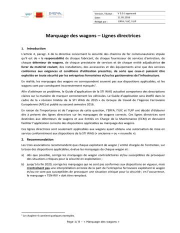 Version / Statut : V 3.0 / approuvé Date : 11.05.2016 Rédigé par : ERFA / UIC / UIP Marquage des wagons – Lignes directrices 1. Introduction L’article 4, paragr. 4 de la directive concernant la sécurité des chemins de fer communautaires stipule qu’il est de « la responsabilité de chaque fabricant, de chaque fournisseur de services d’entretien, de chaque détenteur de wagons, de chaque prestataire de services et de chaque entité adjudicatrice de livrer du matériel roulant, des installations, des accessoires et des équipements ainsi que des services conformes aux exigences et conditions d’utilisation prescrites, de sorte que ceux-ci puissent être exploités en toute sécurité par les entreprises ferroviaires et/ou les gestionnaires de l’infrastructure. En réalité, les marquages des wagons ne correspondent souvent pas aux dispositions applicables, et les wagons sont par conséquent incorrectement marqués1. Afin d’atténuer ce problème, le Guide d’application de la STI WAG actualisé comportera des descriptions claires sur la manière de marquer correctement les véhicules. Le Guide d’application sera étoffé dans le cadre de la « révision limitée de la STI WAG de 2015 » du Groupe de travail de l’Agence Ferroviaire Européenne (AFE) et publié au second semestre 2016. En raison de l’importance et de l’urgence de cette question, l’ERFA, l’UIC et l’UIP ont décidé d’élaborer dès à présent des lignes directrices sur les marquages de wagons corrects. Ces lignes directrices sont destinées aux détenteurs de wagons et aux Entités en Charge de la Maintenance (ECM) et devraient faciliter l’application correcte des dispositions applicables au marquage des wagons. Ces lignes directrices sont seulement applicables aux wagons ayant obtenu une autorisation de mise en service conformément aux dispositions de la STI WAG (« ancienne » ou « nouvelle »). 2. Recommandation Les trois associations recommandent que chaque exploitant de wagon / entité chargée de l’entretien, sur la base des dispositions applicables, évalue les marquages de chaque wagon et : a) dès que possible, corrige les marquages de wagon contradictoires et/ou susceptibles de provoquer des situations critiques pour la sécurité en exploitation ; b) jusqu’à la fin 2020, corrige les marquages qui ne sont pas conformes aux dispositions en vigueur, mais n’entraînent pas une interprétation erronée de la part de l’entreprise ferroviaire exploitant le wagon et/ou ne sont pas susceptibles de provoquer une situation critique pour la sécurité ; en l’occurrence, le marquage « TEN-RIV » doit être remplacé. 1 Le chapitre 4 contient quelques exemples. Page 1/ 8 – « Marquage des wagons » Version / Statut : V 3.0 / approuvé Date : 11.05.2016 Rédigé par : ERFA / UIC / UIP 3. L’« ancienne » et la « nouvelle » STI WAG Afin d’analyser correctement les marquages de wagons, il est essentiel de savoir quelle est la STI WAG selon laquelle les autorisations de mise en service (AMS) ont été délivrées pour chaque wagon. 3.1. AMS en application de l’« ancienne STI WAG » Les décisions suivantes s’appliquent aux wagons dont la mise en service est autorisée en application de l’« ancienne STI WAG » : DÉCISION DE LA COMMISSION 2006/861/CE du 28 juillet 2006 relative à la spécification technique d'interopérabilité concernant le sous-système « Matériel roulant — wagons pour le fret » du système ferroviaire transeuropéen conventionnel. DÉCISION DE LA COMMISSION 2009/107/CE du 23 janvier 2009 modifiant les décisions 2006/861/CE et 2006/920/CE relatives aux spécifications techniques d'interopérabilité concernant des sous-systèmes du système ferroviaire transeuropéen conventionnel. DÉCISION DE LA COMMISSION 2012/464/UE du 23 juillet 2012 modifiant les décisions 2006/861/CE, 2008/163/CE, 2008/164/CE, 2008/217/CE, 2008/231/CE, 2008/232/CE, 2008/284/CE, 2011/229/UE, 2011/274/UE, 2011/275/UE, 2011/291/UE et 2011/314/UE relatives à des spécifications techniques d’interopérabilité. Article 3c du RÈGLEMENT (UE) 2015/924 DE LA COMMISSION du 8 juin 2015 modifiant le règlement (UE) no 321/2013 relatif à la spécification technique d'interopérabilité concernant le sous-système « matériel roulant — wagons pour le fret » du système ferroviaire dans l'Union européenne. Le tableau 1 ci-dessous présente une vue d’ensemble des marquages de wagons corrects compte tenu des dispositions de l’« ancienne STI WAG », y compris l’article 3c du règlement (UE) 2015/924 de la Commission, qui est entré en vigueur le 1er juillet 2015 : Le wagon est autorisé en application de l’« ancienne STI WAG » - (Décision 2006/861/CE et modifications) Colonne : A B C Exigence : Satisfait à l'article 4.2 de l’annexe à l’« ancienne STI WAG » (spécifications fonctionnelles et techniques du sous-système) et satisfait en partie à l’article 7.6.4 de l’annexe 1 à l’« ancienne STI WAG » ou satisfait pleinement à l’article 7.6.4 de l’annexe 1 à l’« ancienne STI WAG » modifiée Marquage d’interopérabilité : Autres marquages : 1er chiffre du numéro européen de véhicule (NEV) Plaque d’autorisation (si le wagon est également destiné à être utilisé dans des États membres autres que celui ayant délivré l’AMS) Conformément au gabarit cinématique appliqué au titre de l’annexe C (voir C3 - C4 - C5) 4 ou 8 4 ou 8 Tableau 1 Page 2/ 8 – « Marquage des wagons » TEN GE GE = GO EVERYWHERE G1 0 ou 1 ou 2 ou 3 Version / Statut : V 3.0 / approuvé Date : 11.05.2016 Rédigé par : ERFA / UIC / UIP En résumé : Le wagon satisfait à l’exigence de la colonne A du tableau 1, c.-à-d. que les critères énoncés à l’article 4.2 de la décision 2006/861/CE sont pleinement respectés : Dans ce cas : o Le wagon nécessitera une plaque d’autorisation. o Le premier chiffre de son NEV est 4 ou 8. Exemple : AMS : Allema