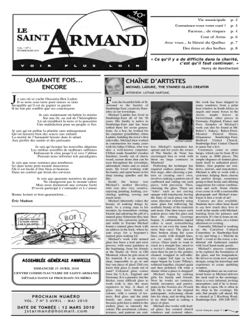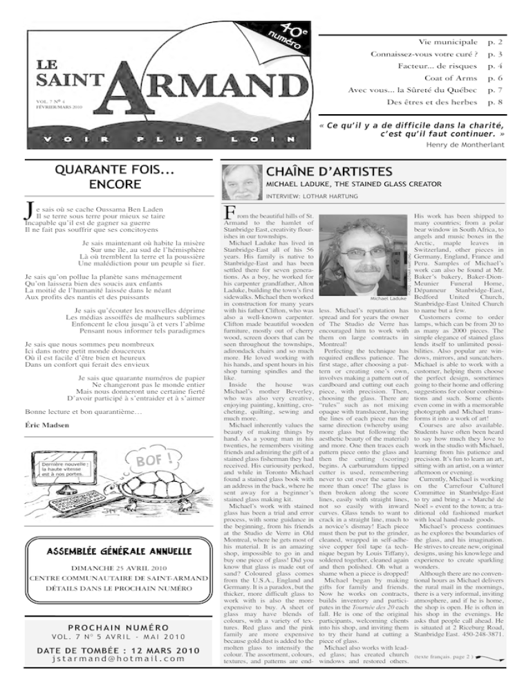 40 e m nu éro Vie municipale p. 2 Connaissez-vous votre curé ? p. 3 Facteur... de risques p. 4 Coat of Arms p. 6 Avec vous... la Sûreté du Québec p. 7 Des êtres et des herbes p. 8 VOL. 7 No 4 FÉVRIER/MARS 2010 « Ce qu’il y a de difficile dans la charité, c’est qu’il faut continuer. » Henry de Montherlant QUARANTE FOIS... ENCORE Je sais maintenant où habite la misère Sur une île, au sud de l’hémisphère Là où tremblent la terre et la poussière Une malédiction pour un peuple si fier. Je sais qu’on pollue la planète sans ménagement Qu’on laissera bien des soucis aux enfants La moitié de l’humanité laissée dans le néant Aux profits des nantis et des puissants Je sais qu’écouter les nouvelles déprime Les médias assoiffés de malheurs sublimes Enfoncent le clou jusqu’à et vers l’abîme Pensant nous informer tels paradigmes Je sais que nous sommes peu nombreux Ici dans notre petit monde doucereux Où il est facile d’être bien et heureux Dans un confort qui ferait des envieux Je sais que quarante numéros de papier Ne changeront pas le monde entier Mais nous donneront une certaine fierté D’avoir participé à s’entraider et à s’aimer Bonne lecture et bon quarantième… Éric Madsen BOF ! ASSEM BLÉE GÉNÉ RALE ANNUE LLE DIMANCHE 25 AVRIL 2010 CENTRE COMMUNAUTAIRE DE SAINT-ARMAND DÉTAILS DANS LE PROCHAIN NUMÉRO PROCHAIN NUMÉRO V O L . 7 N O 5 AV R I L - M A I 2 0 1 0 DATE DE TOMBÉE : 12 MARS 2010 [email protected] MICHAEL LADUKE, THE STAINED GLASS CREATOR INTERVIEW: LOTHAR HARTUNG rom the beautiful hills of St. Armand to the hamlet of Stanbridge East, creativity flourishes in our townships. Michael Laduke has lived in Stanbridge-East all of his 56 years. His family is native to Stanbridge-East and has been settled there for seven generations. As a boy, he worked for his carpenter grandfather, Alton Laduke, building the town’s first sidewalks. Michael then worked in construction for many years with his father Clifton, who was also a well-known carpenter. Clifton made beautiful wooden furniture, mostly out of cherry wood, screen doors that can be seen throughout the townships, adirondack chairs and so much more. He loved working with his hands, and spent hours in his shop turning spindles and the like. Inside the house was Michael’s mother Beverley, who was also very creative, enjoying painting, knitting, crocheting, quilting, sewing and much more. Michael inherently values the beauty of making things by hand. As a young man in his twenties, he remembers visiting friends and admiring the gift of a stained glass fisherman they had received. His curiousity perked, and while in Toronto Michael found a stained glass book with an address in the back, where he sent away for a beginner’s stained glass making kit. Michael’s work with stained glass has been a trial and error process, with some guidance in the beginning, from his friends at the Studio de Verre in Old Montreal, where he gets most of his material. It is an amazing shop, impossible to go in and buy one piece of glass! Did you know that glass is made out of sand? Coloured glass comes from the U.S.A., England and Germany. It is a paradox, but the thicker, more difficult glass to work with is also the more expensive to buy. A sheet of glass may have blends of colours, with a variety of textures. Red glass and the pink family are more expensive because gold dust is added to the molten glass to intensify the colour. The assortment, colours, textures, and patterns are end- F PHOTO : LOTHAR HARTUNG e sais où se cache Oussama Ben Laden Il se terre sous terre pour mieux se taire Incapable qu’il est de gagner sa guerre Il ne fait pas souffrir que ses concitoyens J CHAÎNE D’ARTISTES Michael Laduke His work has been shipped to many countries; from a polar bear window in South Africa, to angels and music boxes in the Arctic, maple leaves in Switzerland, other pieces in Germany, England, France and Peru. Samples of Michael’s work can also be found at Mr. Baker’s bakery, Baker-DionMeunier Funeral Home, Dépanneur Stanbridge-East, Bedford United Church, Stanbridge-East United Church to name but a few. Customers come to order lamps, which can be from 20 to as many as 2000 pieces. The simple elegance of stained glass lends itself to unlimited possibilities. Also popular are windows, mirrors, and suncatchers. Michael is able to work with a customer, helping them choose the perfect design, sometimes going to their home and offering suggestions for colour combinations and such. Some clients even come in with a memorable photograph and Michael transforms it into a work of art! Courses are also available. Students have often been heard to say how much they love to work in the studio with Michael, learning from his patience and precision. It’s fun to learn an art, sitting with an artist, on a winter afternoon or evening. Currently, Michael is working on the Carrefour Culturel Committee in Stanbridge-East to try and bring a « Marché de Noël » event to the town; a traditional old fashioned market with local hand-made goods. Michael’s process continues as he explores the boundaries of the glass, and his imagination. He strives to create new, original designs, using his knowlege and experience to create sparkling wonders. Although there are no conventional hours as Michael delivers the rural mail in the mornings, there is a very informal, inviting atmosphere, and if he is home, the shop is open. He is often in his shop in the evenings. He asks that people call ahead. He is situated at 2 Riceburg Road, Stanbridge East. 450-248-3871. less. Michael’s reputation has spread and for years the owner of The Studio de Verre has encouraged him to work with them on large contracts in Montreal! Perfecting the technique has required endless patience. The first stage, after choosing a pattern or creating one’s own, involves making a pattern out of cardboard and cutting out each piece, with pr